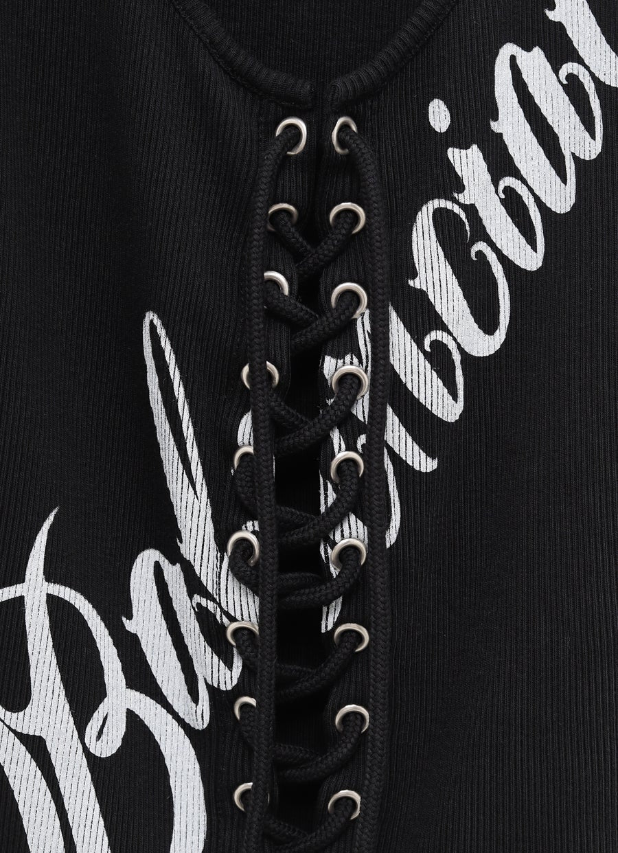 Top sin mangas de Balenciaga en jersey de canalé. Con estampado frontal, escote de pico y cierre de ojales y cordones. Hecho en Portugal. Corte slim. Talla normal, elige tu talla habitual. Tallaje estándar para mujer.