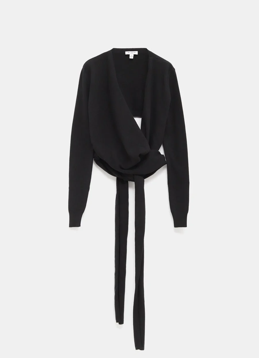 Top de punto de Alaïa en mezcla de cashmere con cintura corta, lazos cruzados, escote en V y manga larga. Hecho en Italia. Talla normal, elige tu talla habitual. Tallaje UE para mujer.