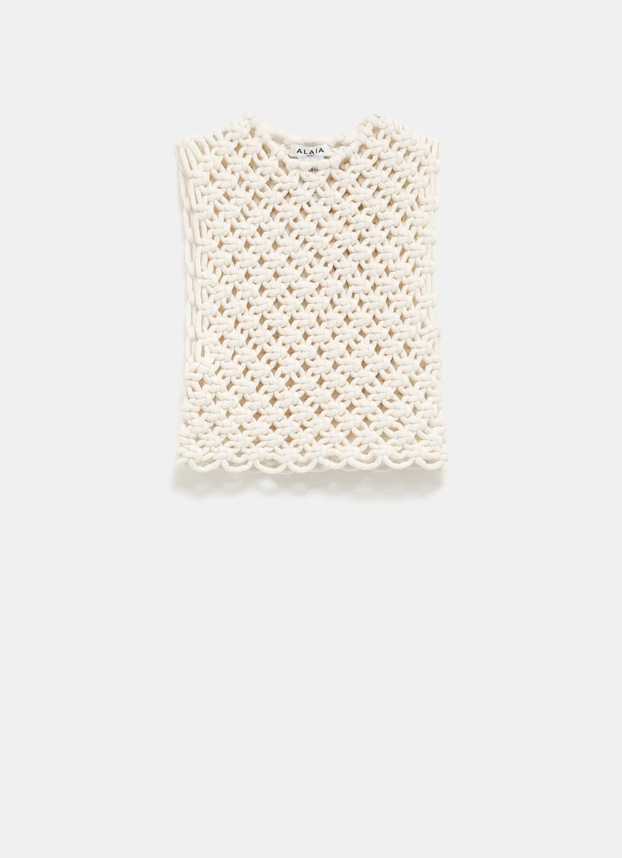 Top sin mangas de Alaïa en algodón y nailon técnico, tejido a mano. Cuello redondo y corte cuadrado. Hecho en Italia. Tallaje normal, elige tu talla habitual. Tallaje francés.