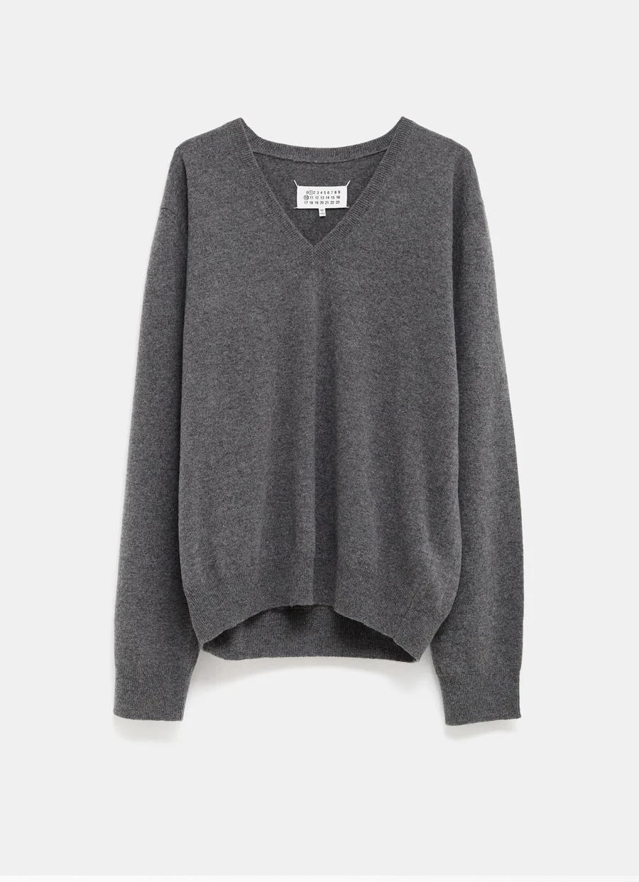Jersey de Maison Margiela en lana con cuello en V, manga larga, ribetes acanalados y el característico pespunte de cuatro puntos en la espalda. Corte holgado. Hecho en Italia. Talla normal, elige tu talla habitual. Tallaje estándar para mujer.