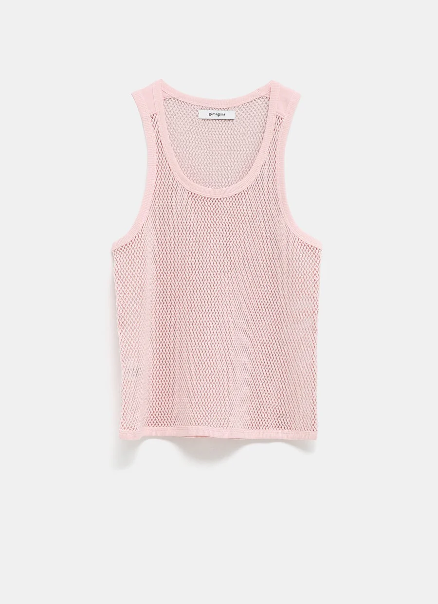 Top unisex de Gimaguas de malla sin mangas con tejido de punto abierto. Escote redondo y ribetes en los bordes. Corte recto. Talla normal, elige tu talla habitual. Tallaje estándar.
