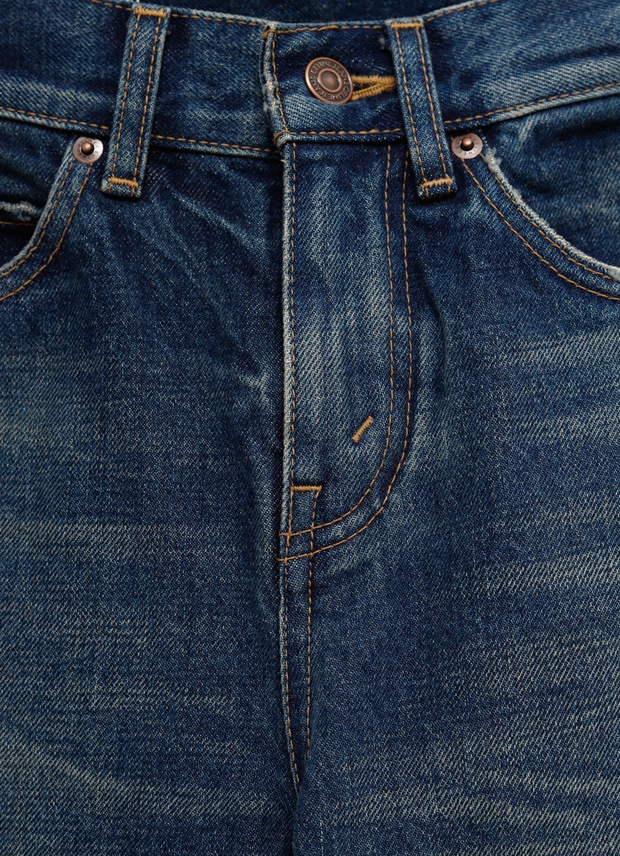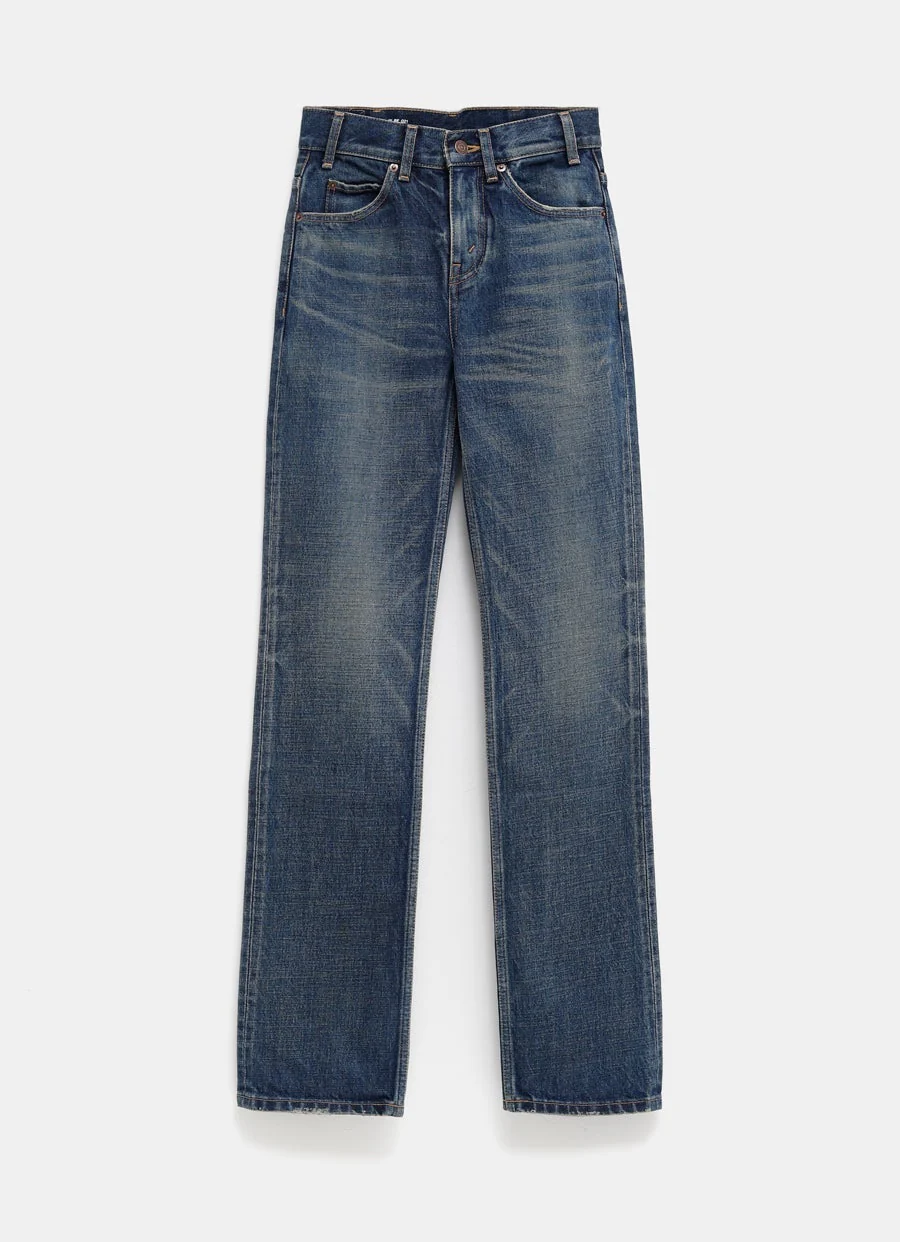 Pantalón vaquero de tiro medio de Celine en dark union wash desgastado, pierna recta, cinco bolsillos, parche en la parte posterior de la cintura y cierre de cremallera y botón grabados. Corte clásico, para un corte más relajado, elegir una talla más. Hecho en Japón. Talla normal, elige tu talla habitual. Tallaje de vaqueros para mujer.