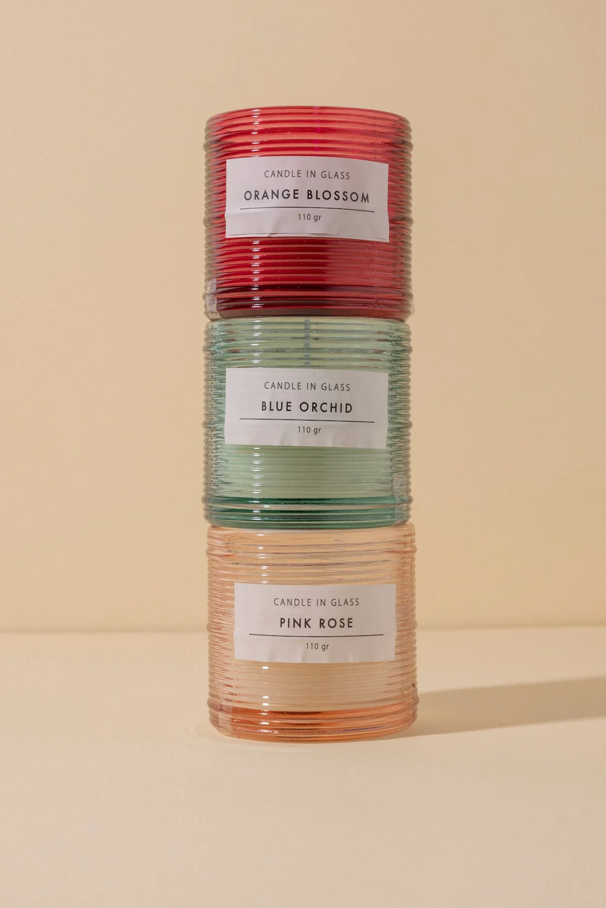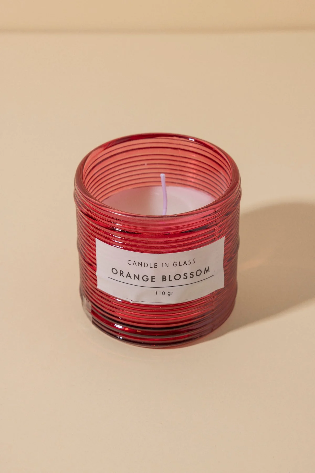 Velas arom谩tica en recipiente de vidrio estriado.