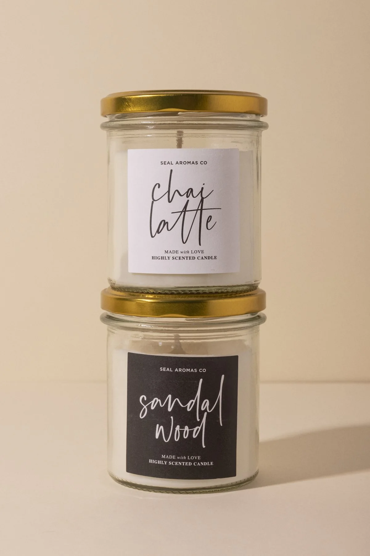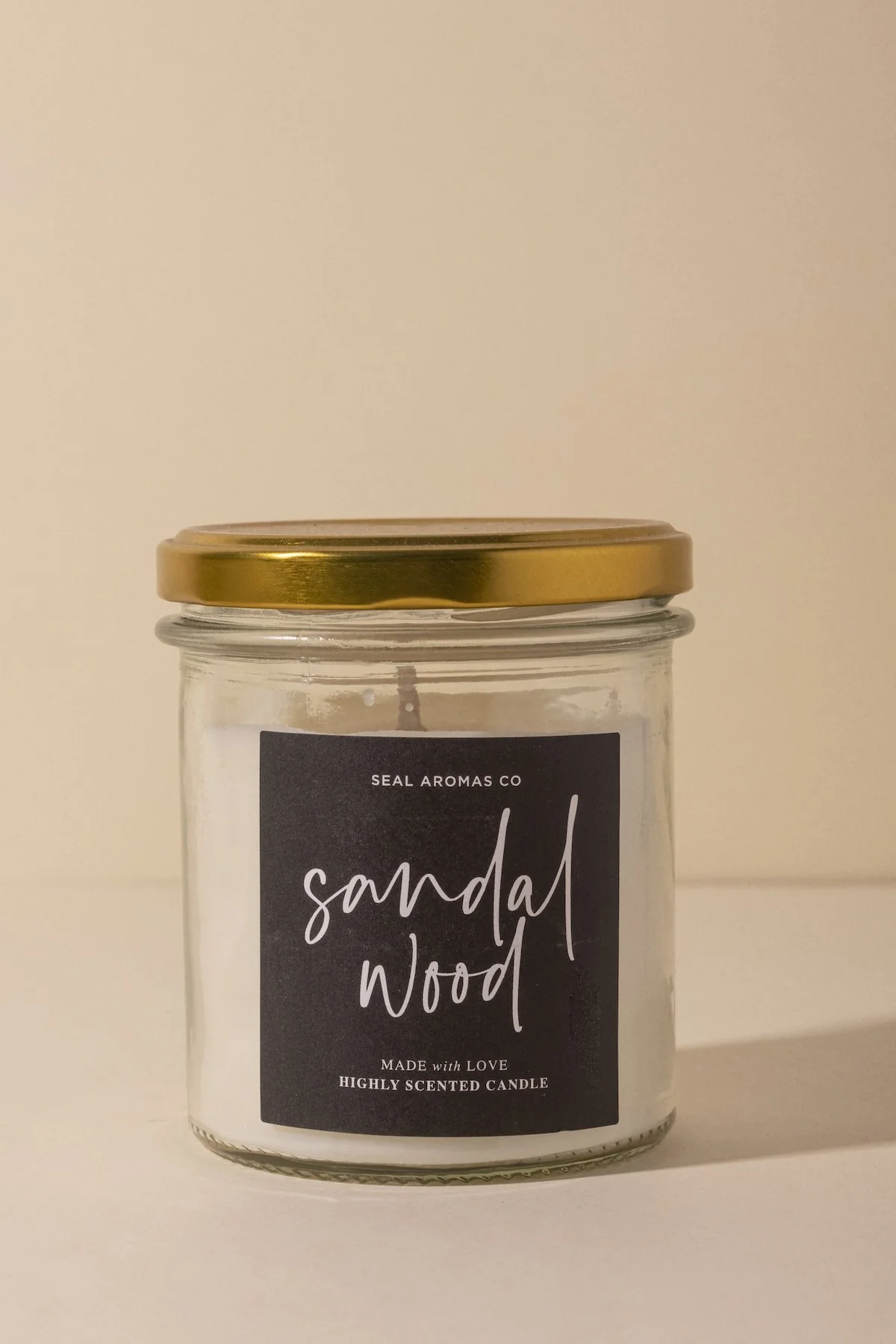 En recipiente de vidrio con tapa de rosca de metal en dorado.