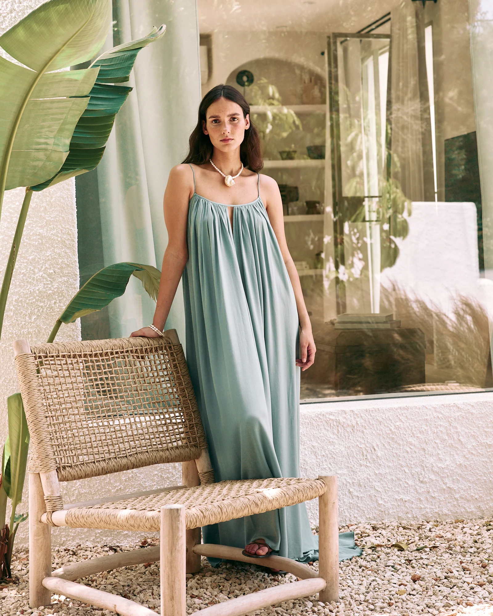 Este maxi vestido asimétrico evoca la belleza natural del Mediterráneo con su tonalidad azul agua, inspirada en las aguas turquesa de la costa. Confeccionado en una delicada mezcla de viscosa texturizada y rayón, se adapta con fluidez al cuerpo, creando una silueta etérea y sofisticada.