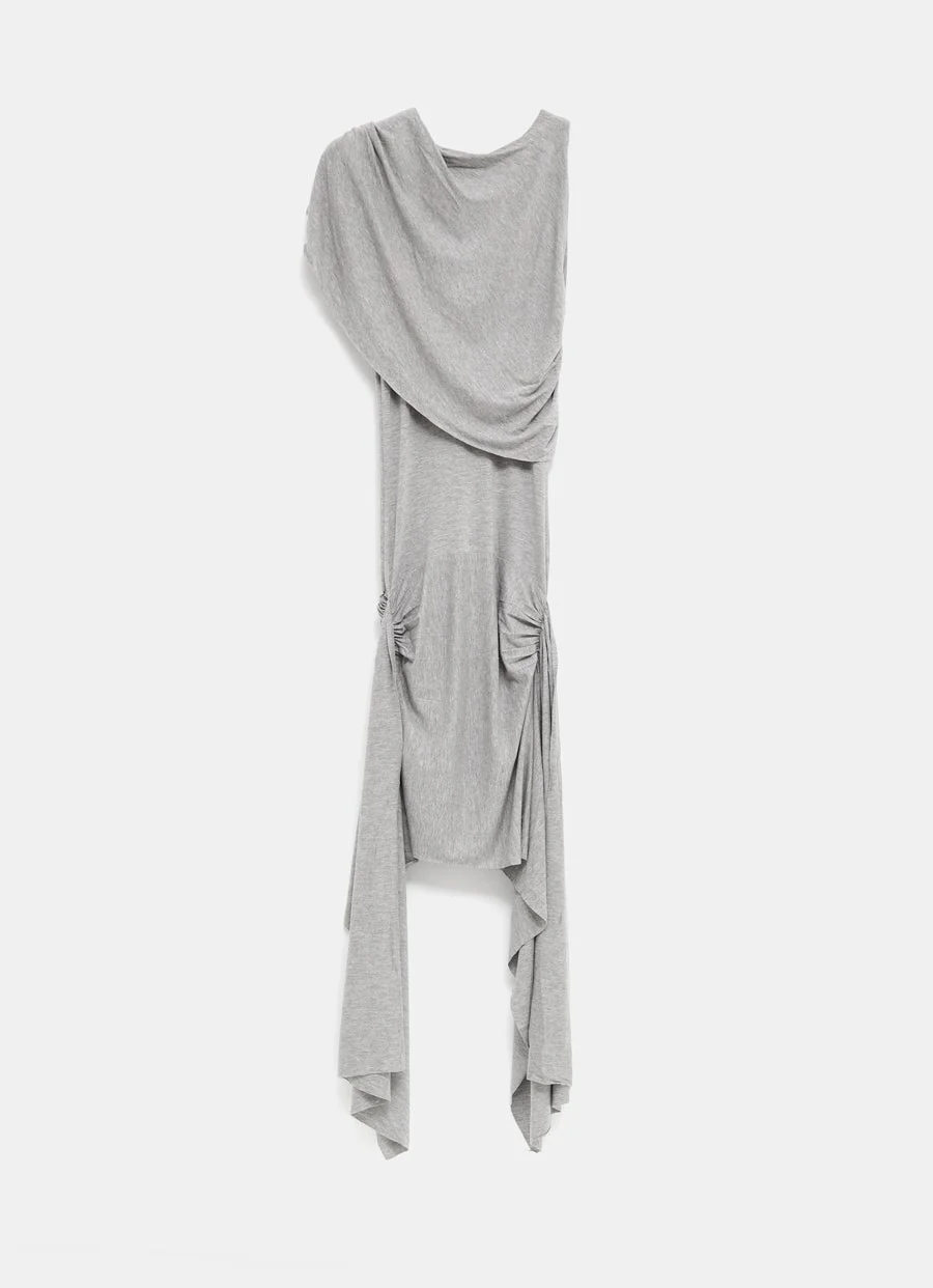 Vestido de Gimaguas sin mangas con efecto de dos piezas en tejido elástico. Bajo asimétrico, drapeado en el pecho y espalda, fruncido en las caderas y fajín en los laterales. Largo hasta la rodilla con fajín hasta el tobillo, corte ajustado. Hecho en Portugal. Talla normal, elige tu talla habitual. Tallaje estándar para mujer.