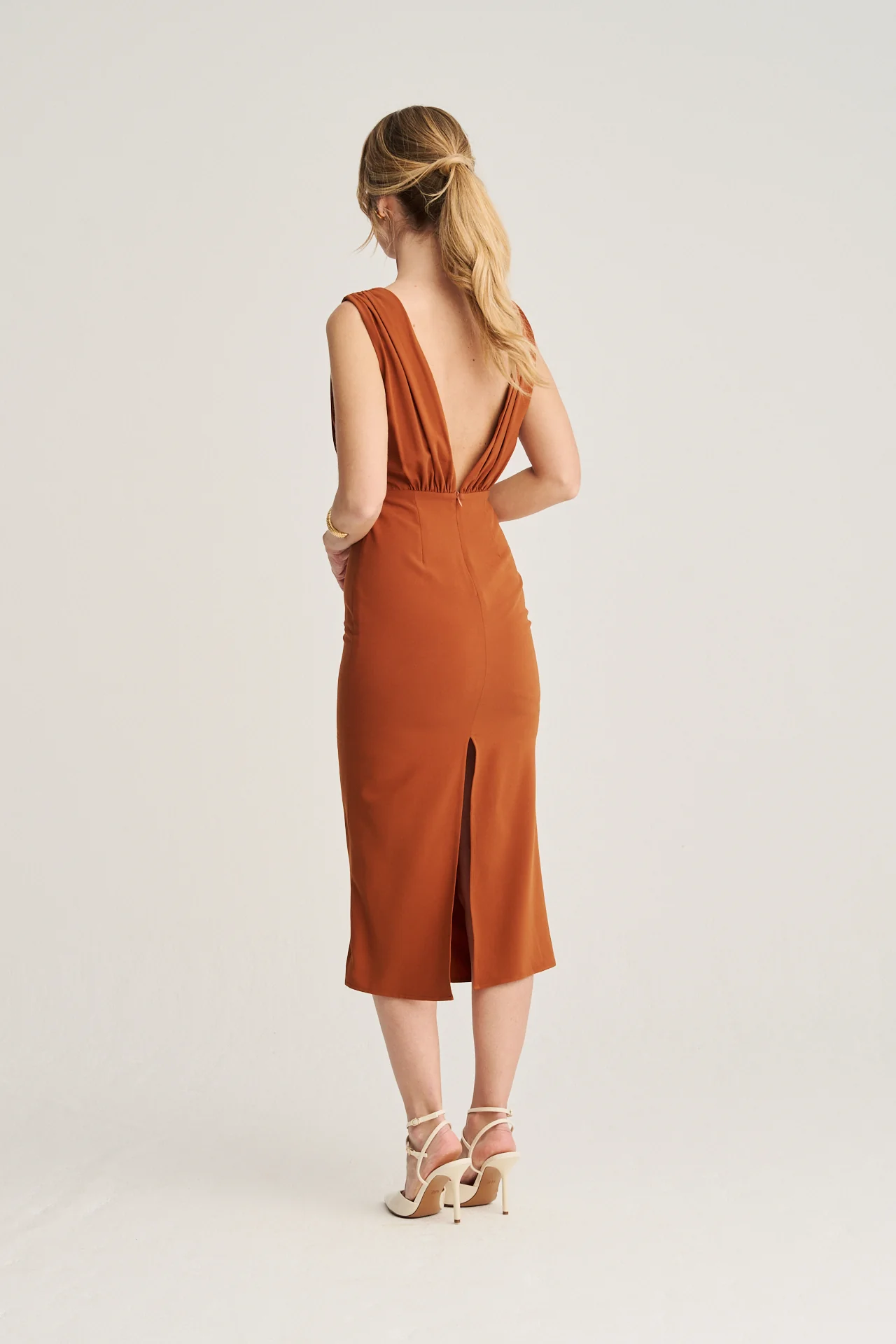 El equilibrio perfecto entre estilo y sostenibilidad. Este vestido midi, confeccionado en crepé reciclado de alta calidad, se presenta en un delicado color macadamia, ideal para eventos especiales y looks versátiles.