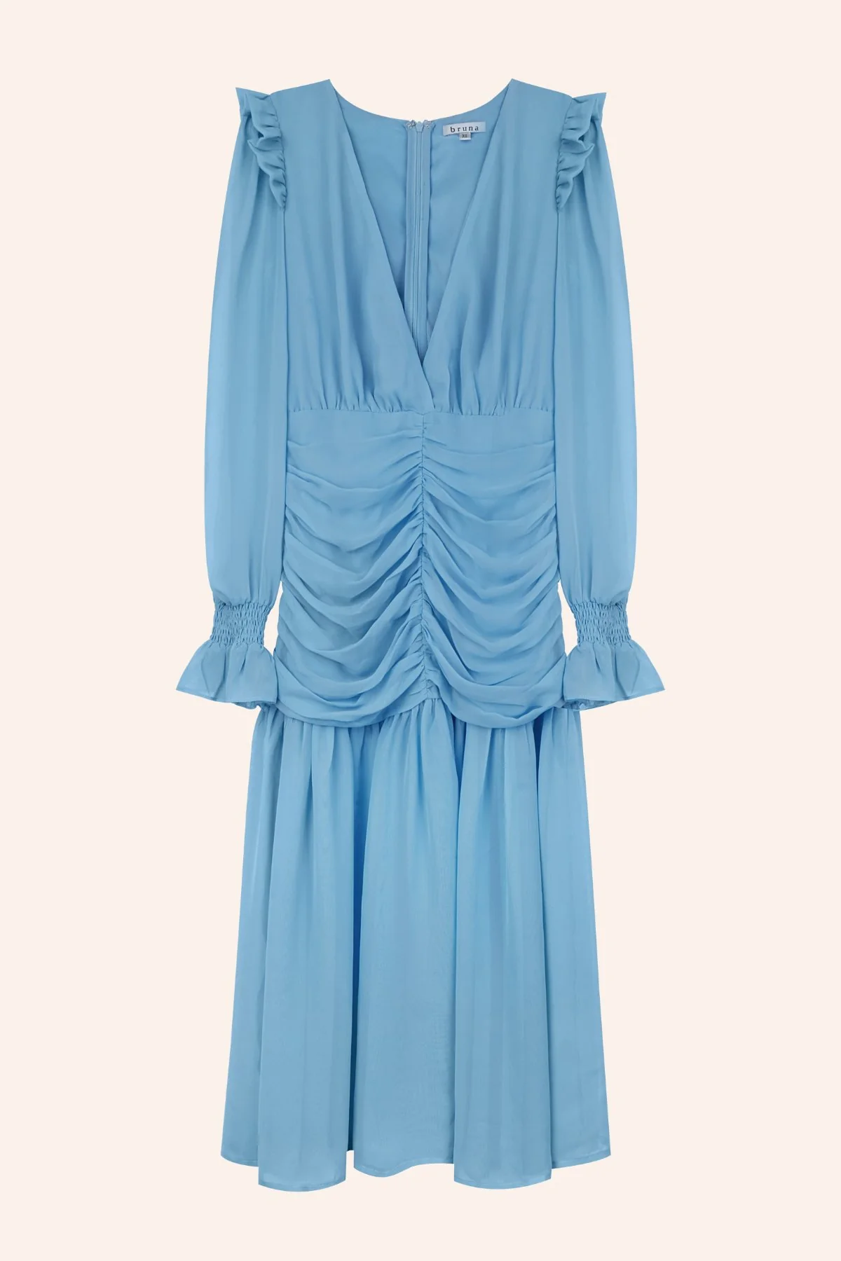 Dise帽o de volantes en hombros. Escote cruzado en V y manga larga con fruncidos de nido de abeja en pu帽o y volante. Cremallera invisible en espalda.