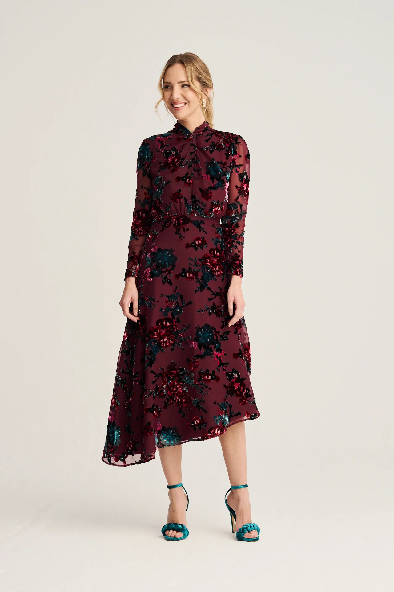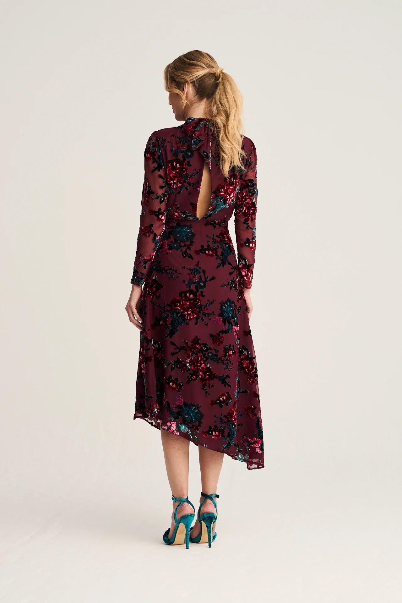 Envuelve tu estilo en la sofisticaci贸n de este vestido midi de dise帽o asim茅trico, confeccionado en un rico tejido con estampado floral en tonos burdeos y azules.