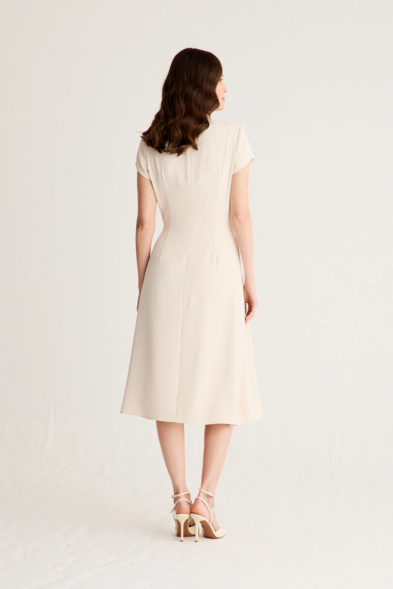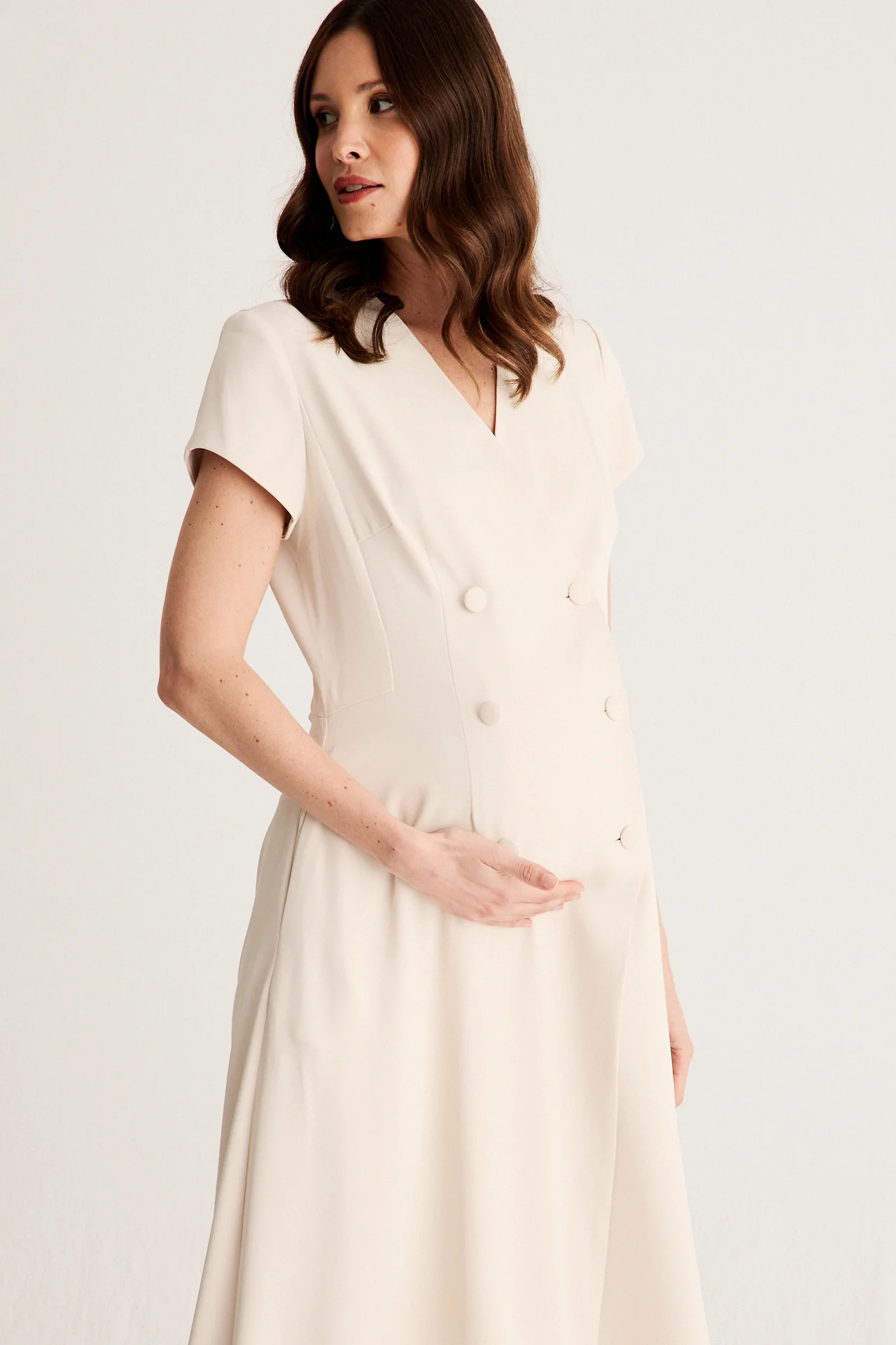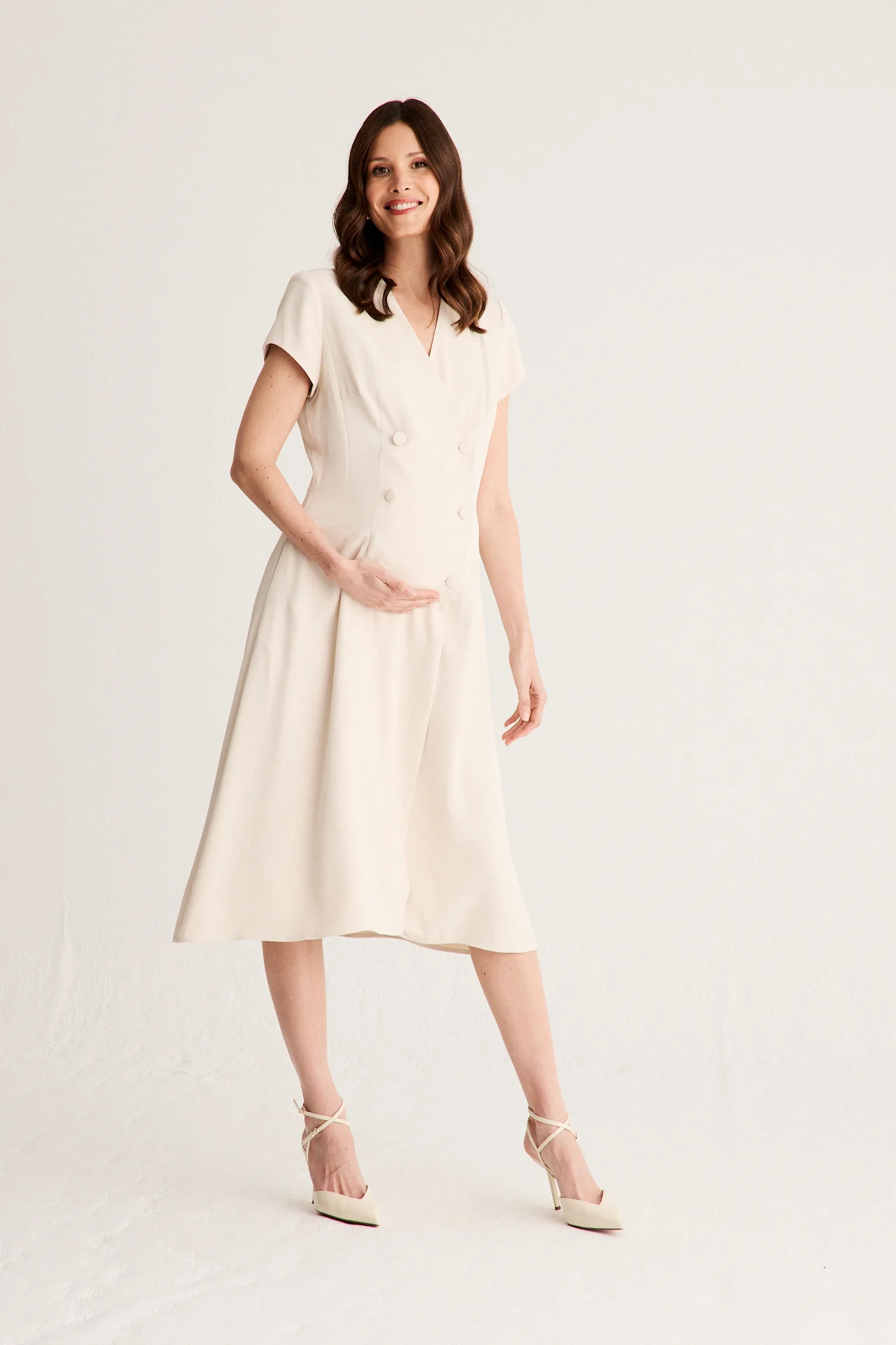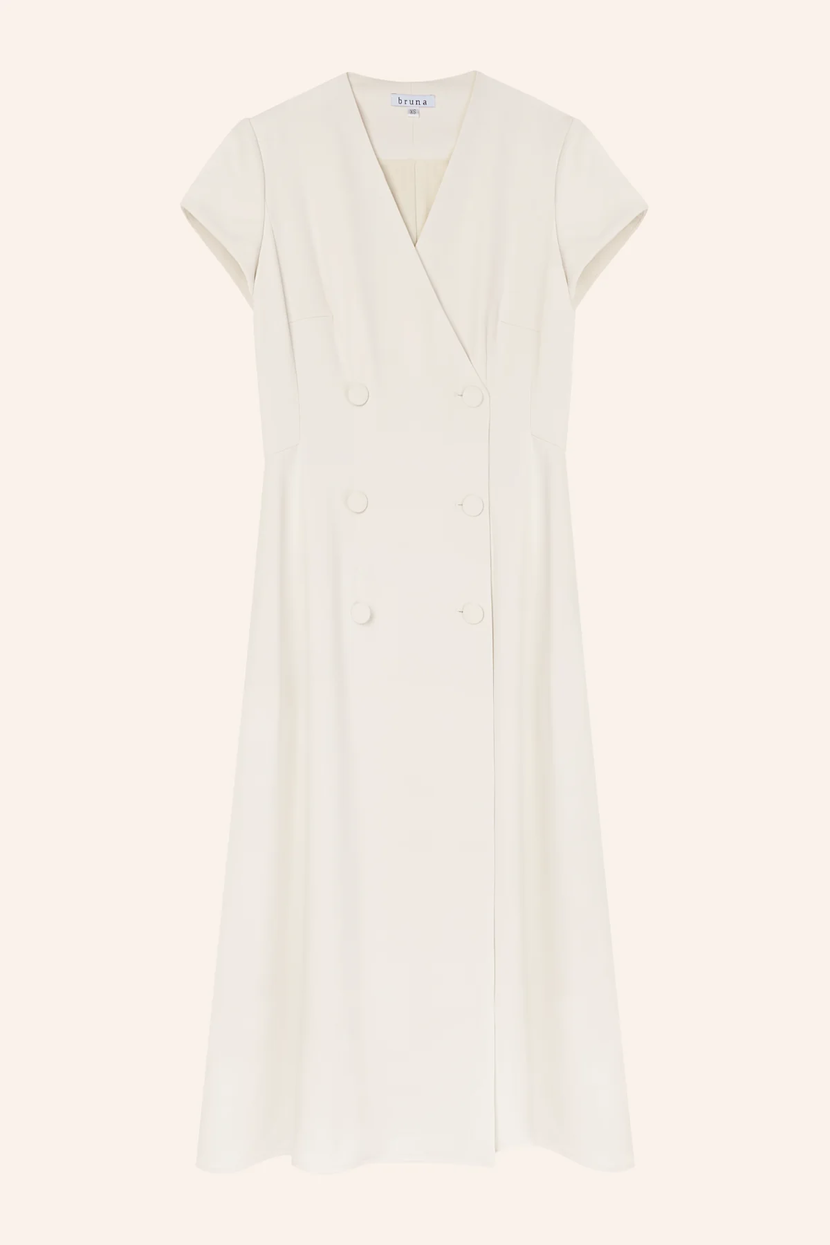 Descubre la perfecta combinaci贸n de sofisticaci贸n y estilo con este vestido cruzado con botones forrados, dise帽ado para realzar tu elegancia en ocasiones y eventos especiales como comuniones, bautizos o celebraciones diurnas.