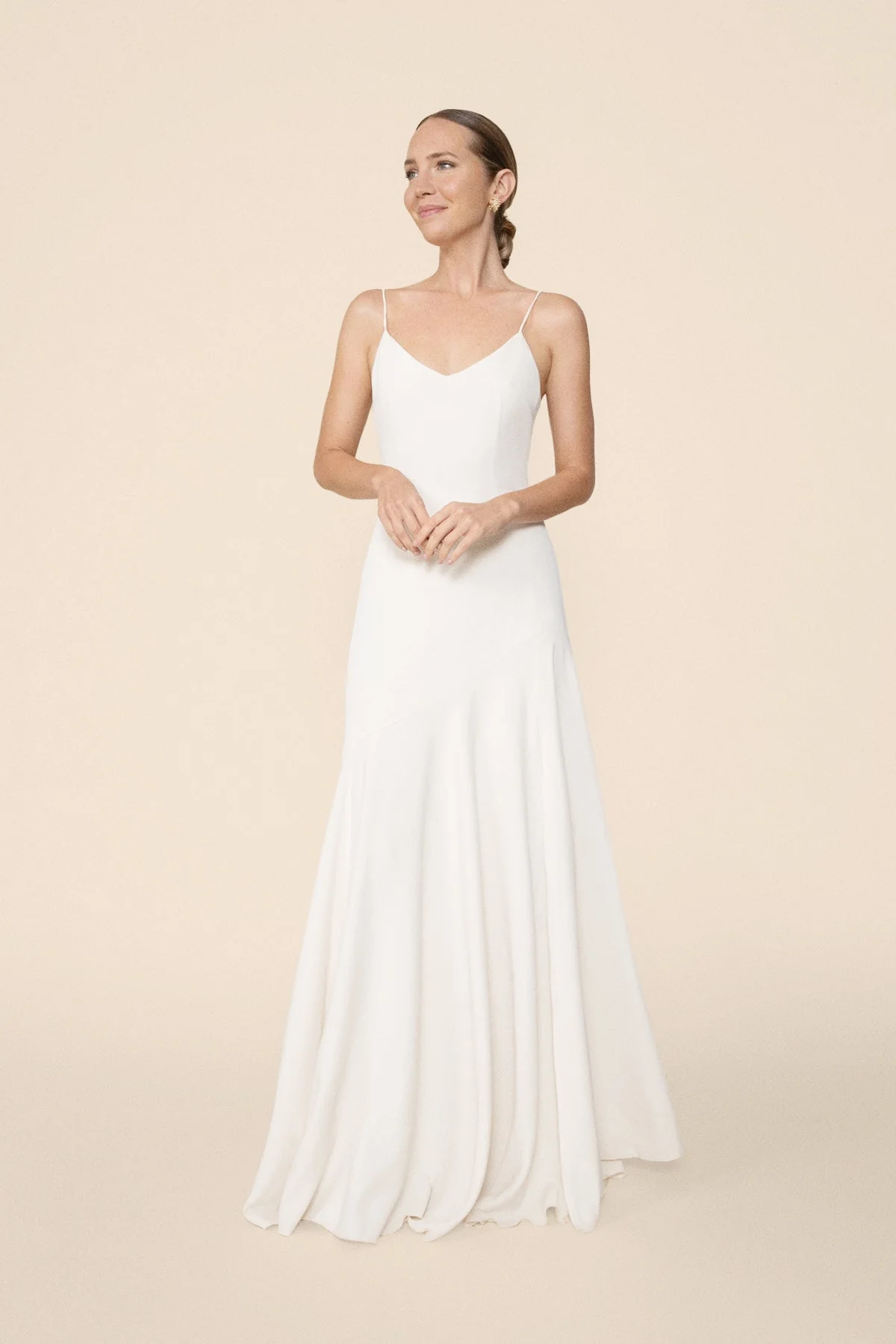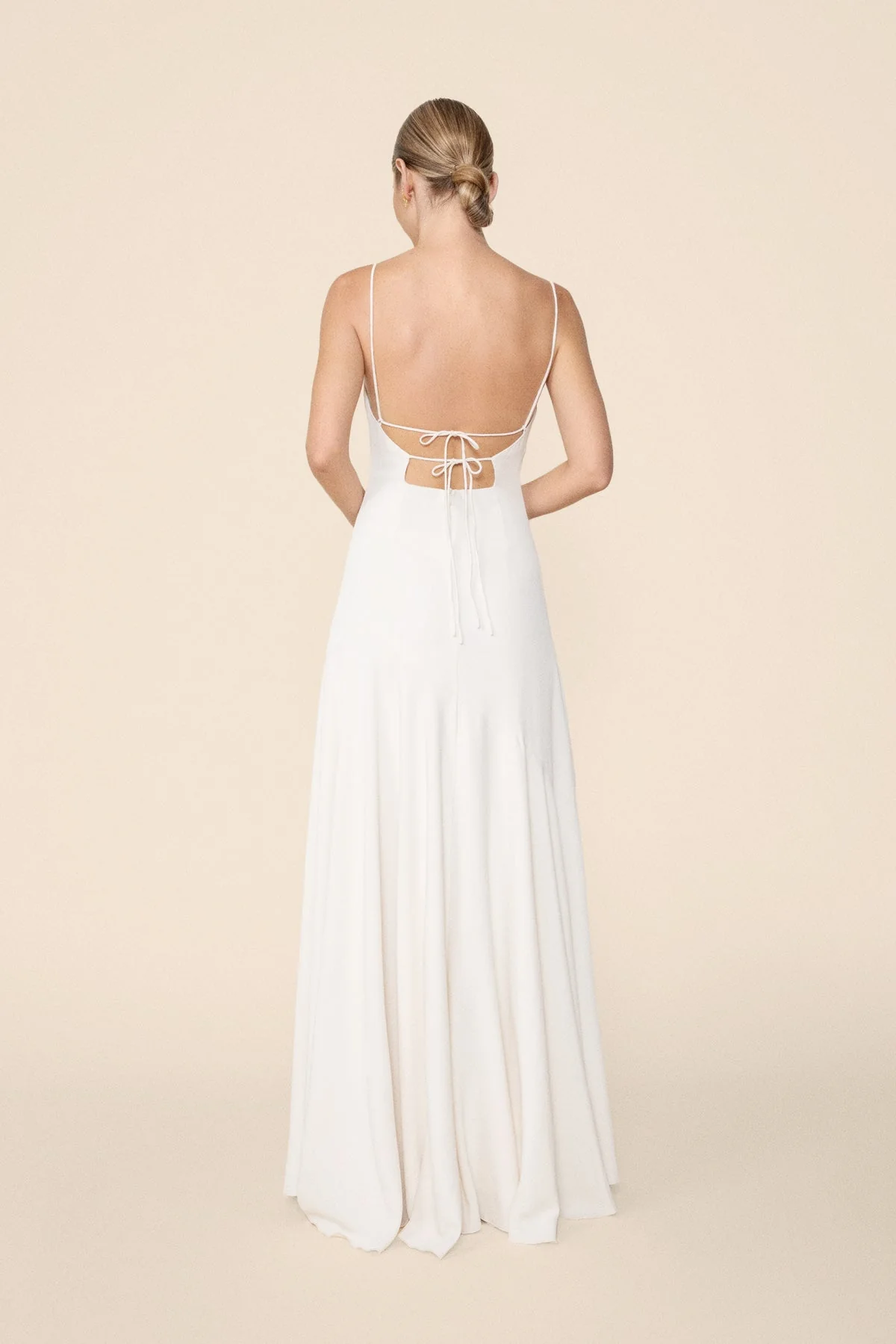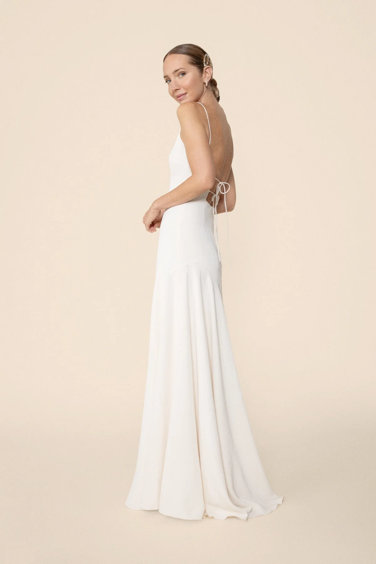 Vestido de novia en largo realizado en crepe y con dise帽o de profundo escote en la espalda con lazadas realizadas en el mismo tejido para anudar a tu gusto.