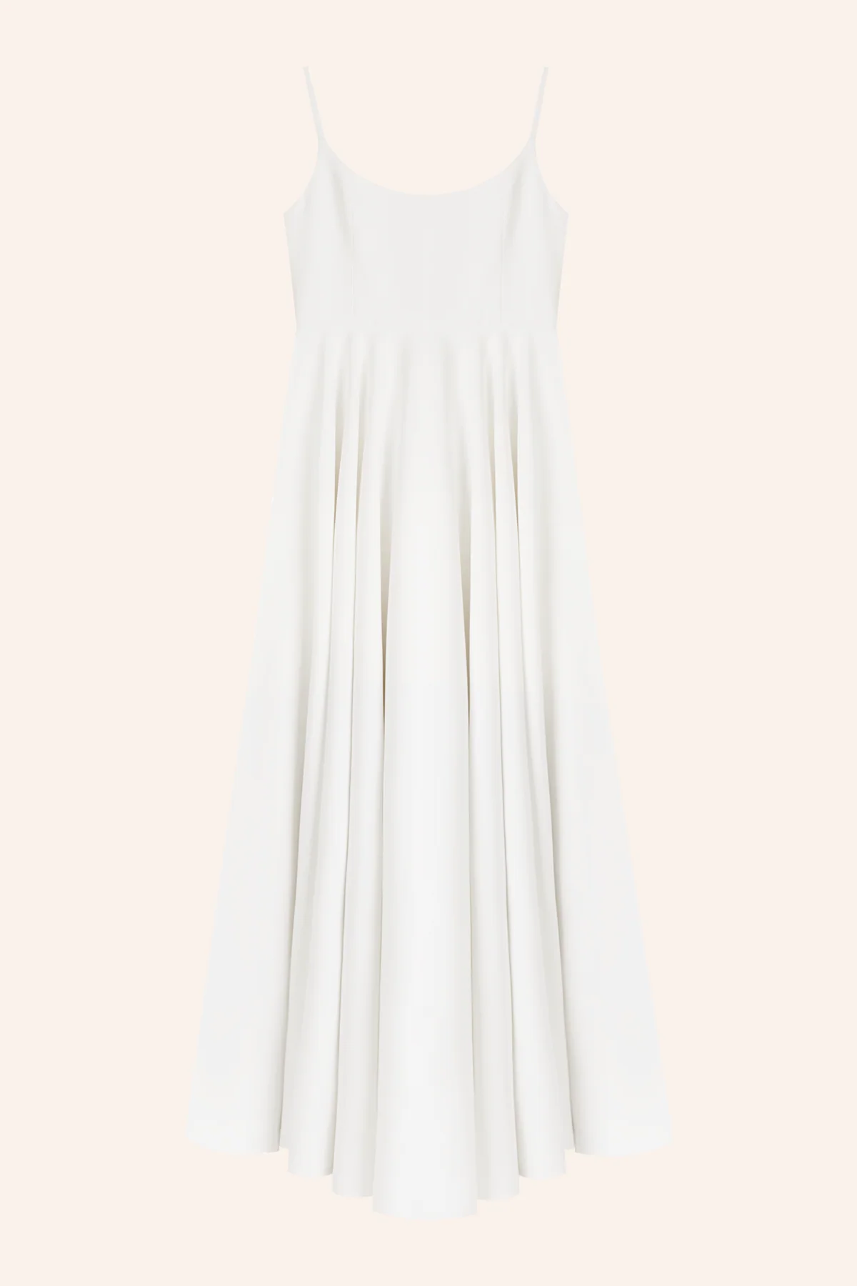 Este vestido de novia midi en blanco roto, confeccionado en crepé de alta calidad, destaca por su diseño sofisticado y femenino. Su escote balconet realza la figura con un toque clásico y romántico, mientras que sus tirantes regulables permiten un ajuste perfecto. La silueta entallada en la cintura y la falda con corte al bies aportan fluidez y movimiento, ideal para una boda civil, una celebración íntima o un segundo look nupcial.