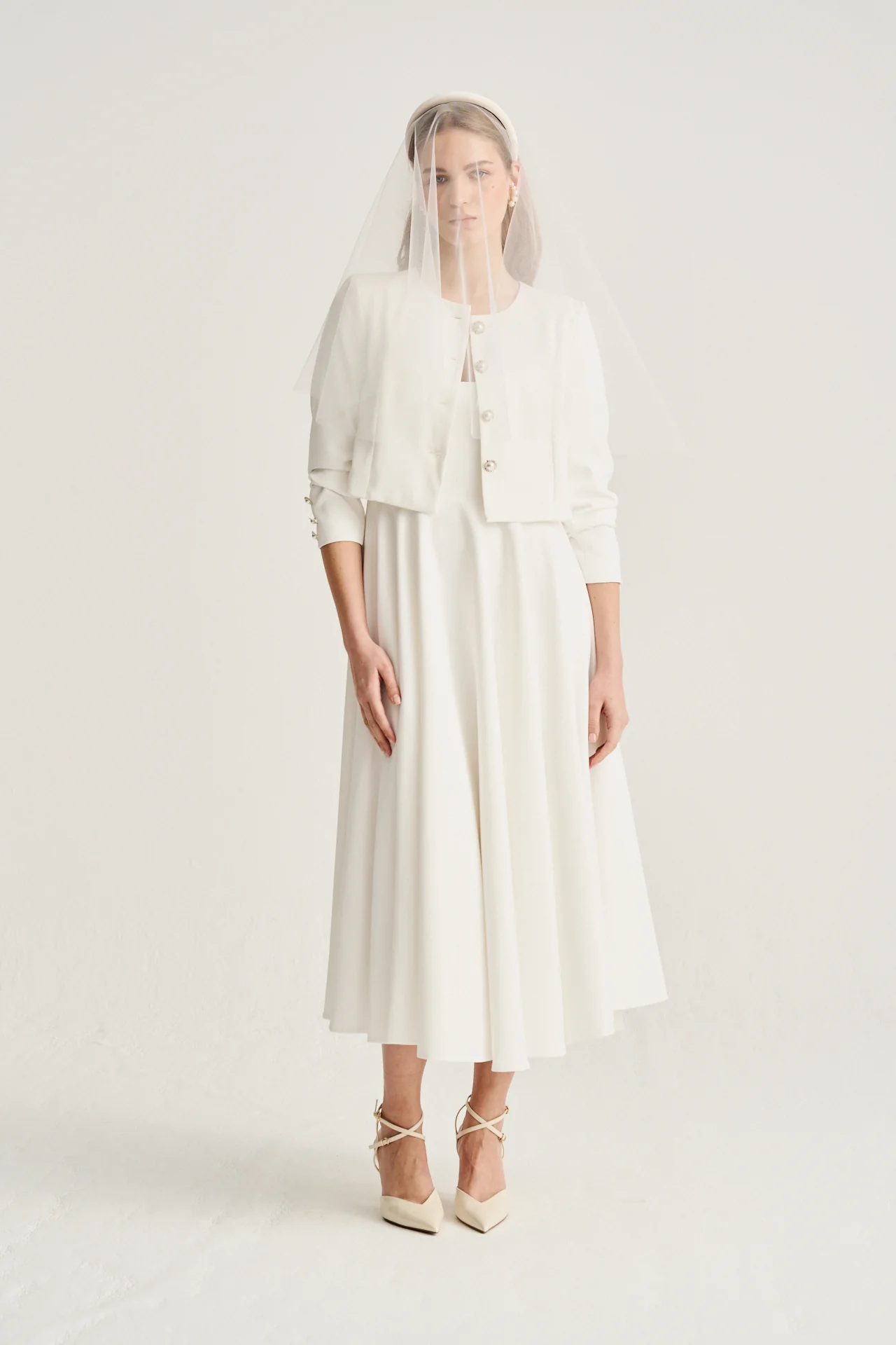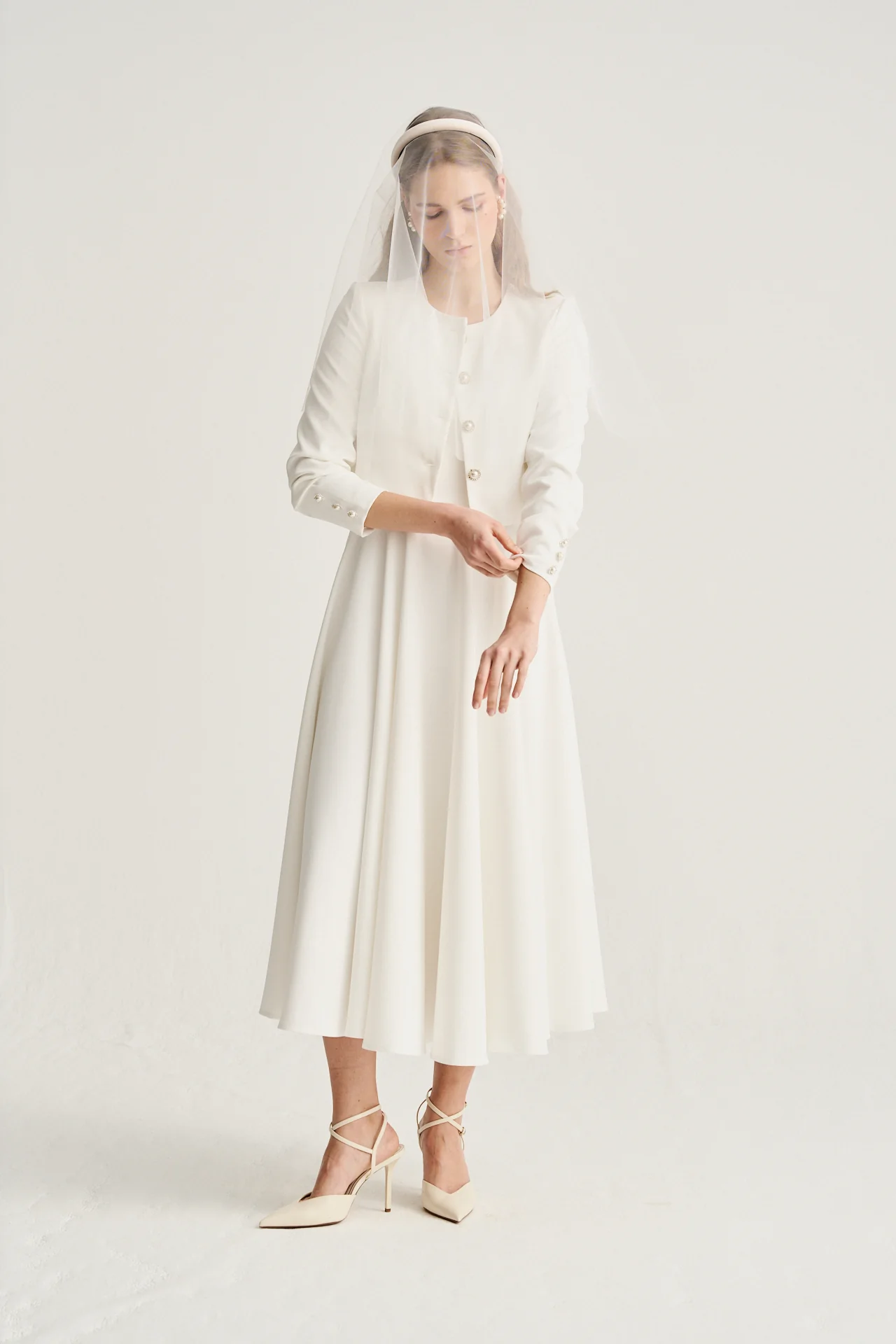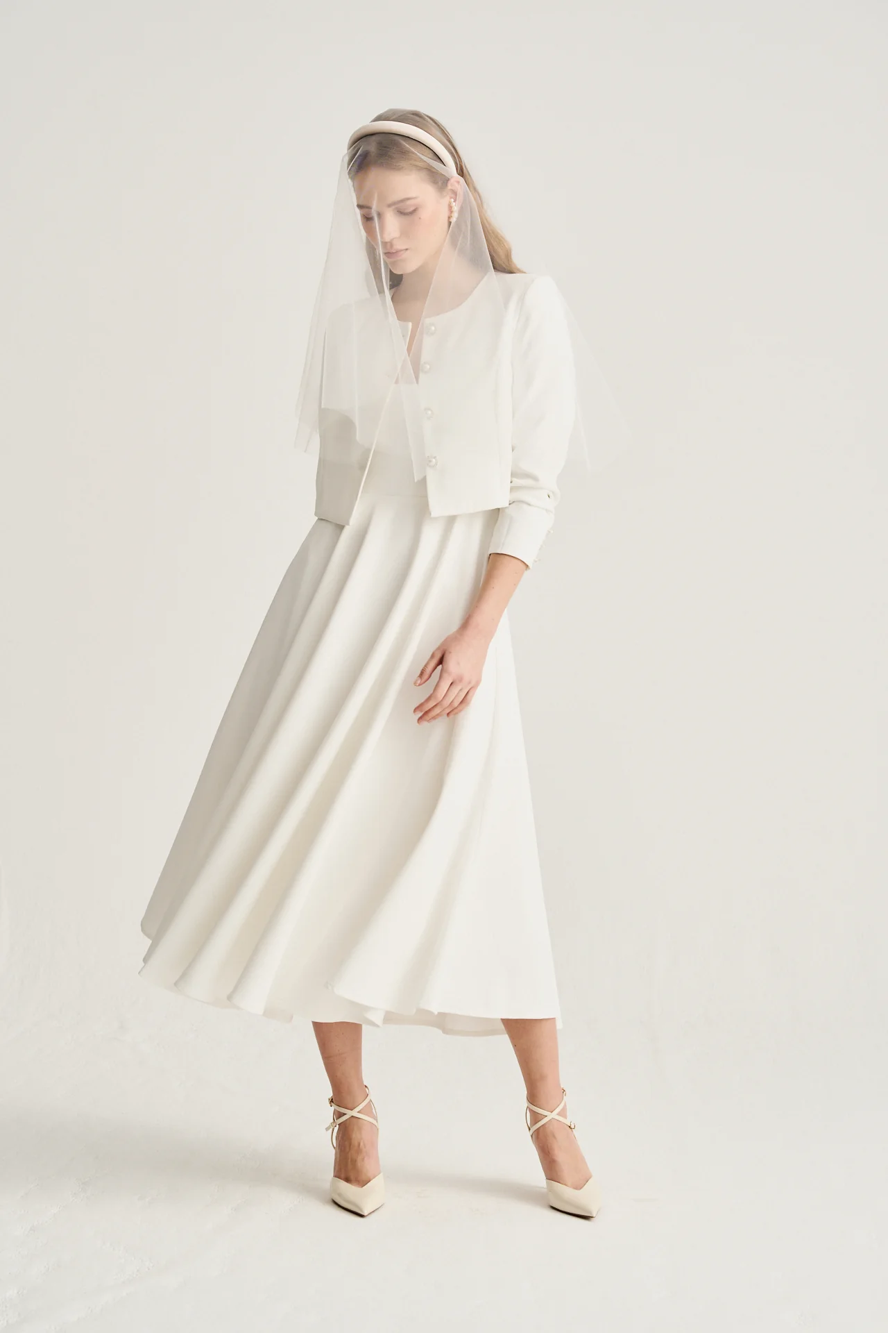 Este vestido combina a la perfección con nuestra chaqueta de novia (Giada – confeccionada en el mismo tejido y color)para un look sofisticado o con accesorios sutiles para un estilo minimalista y elegante.