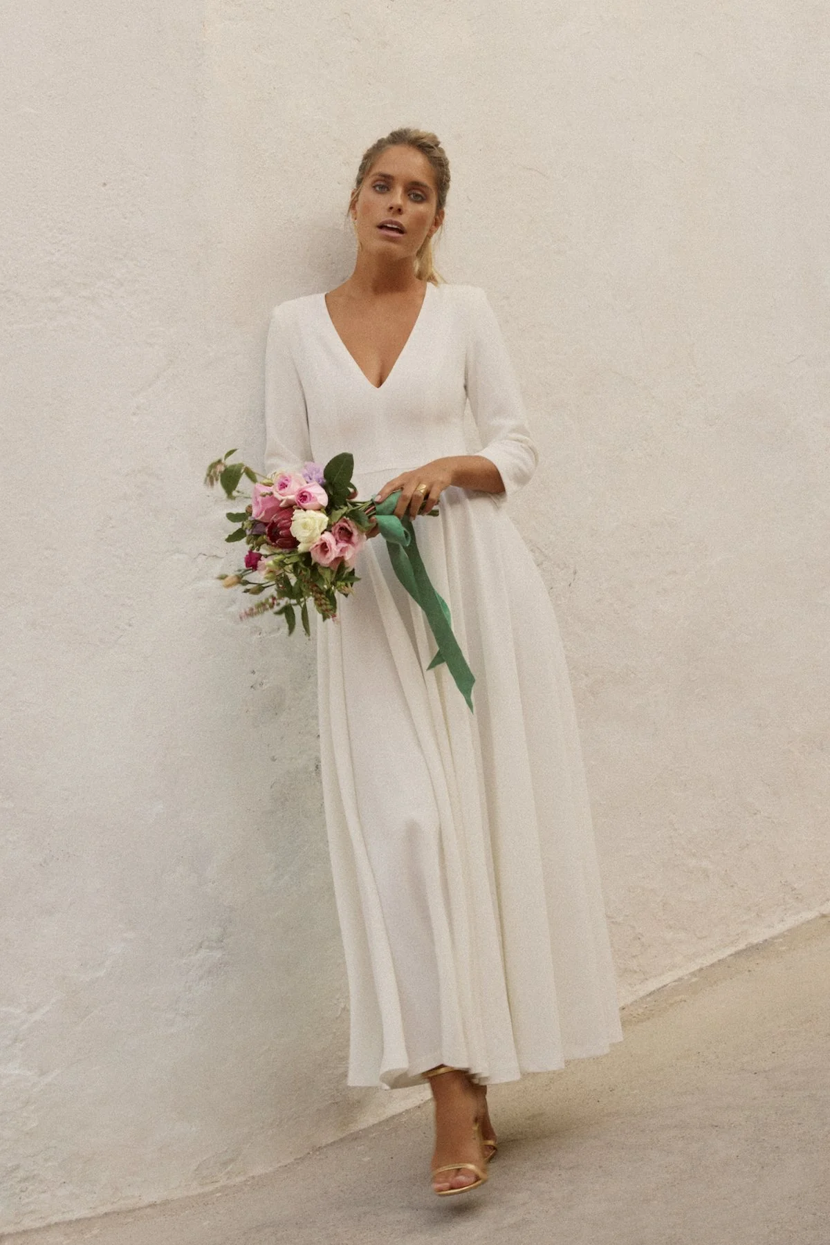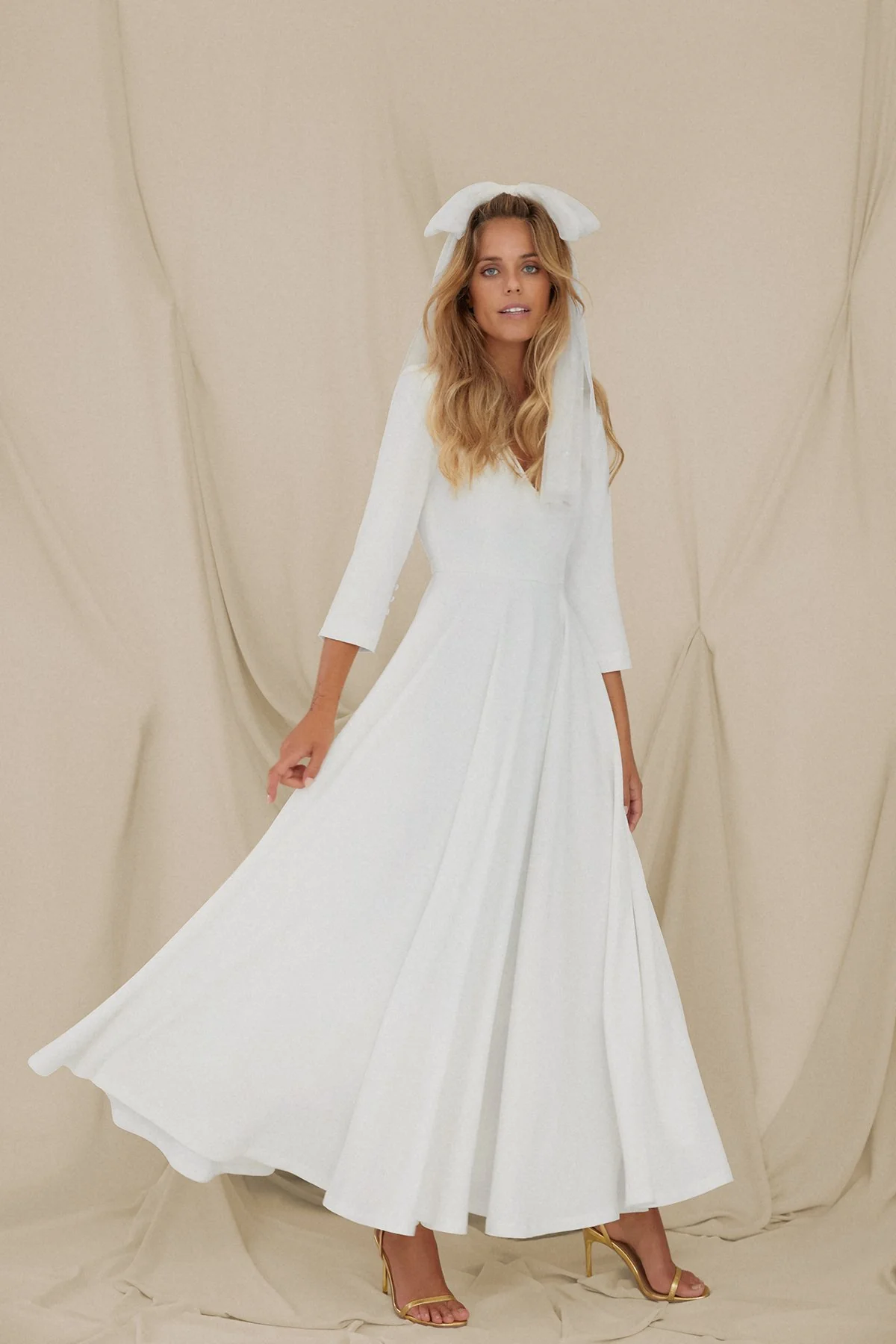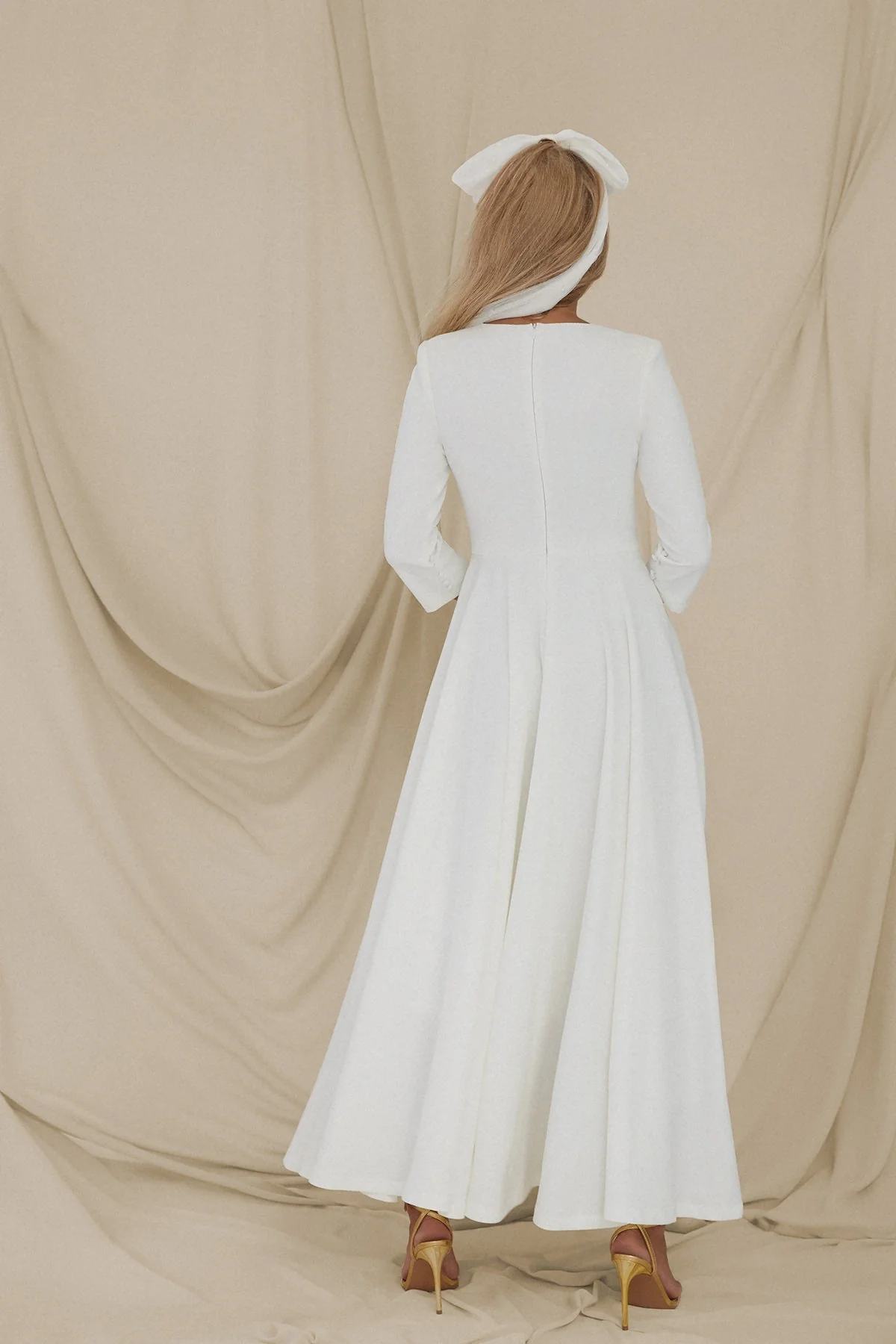 Silueta ajustada hasta la cintura y amplia falda cortada al bies de gran volumen y elegancia.