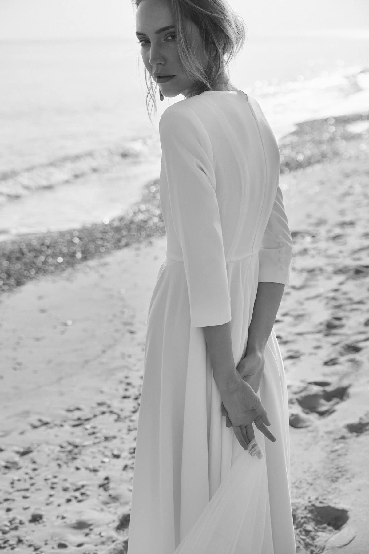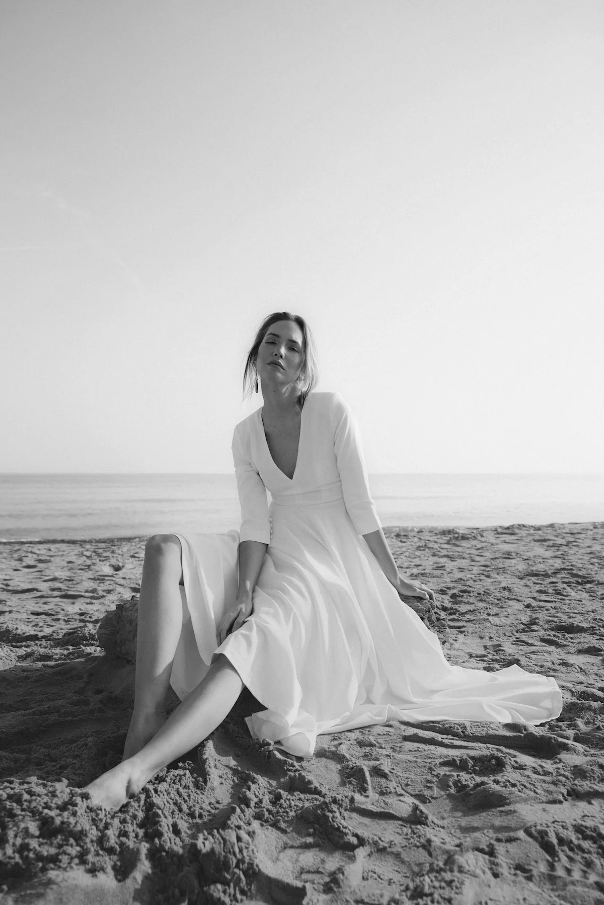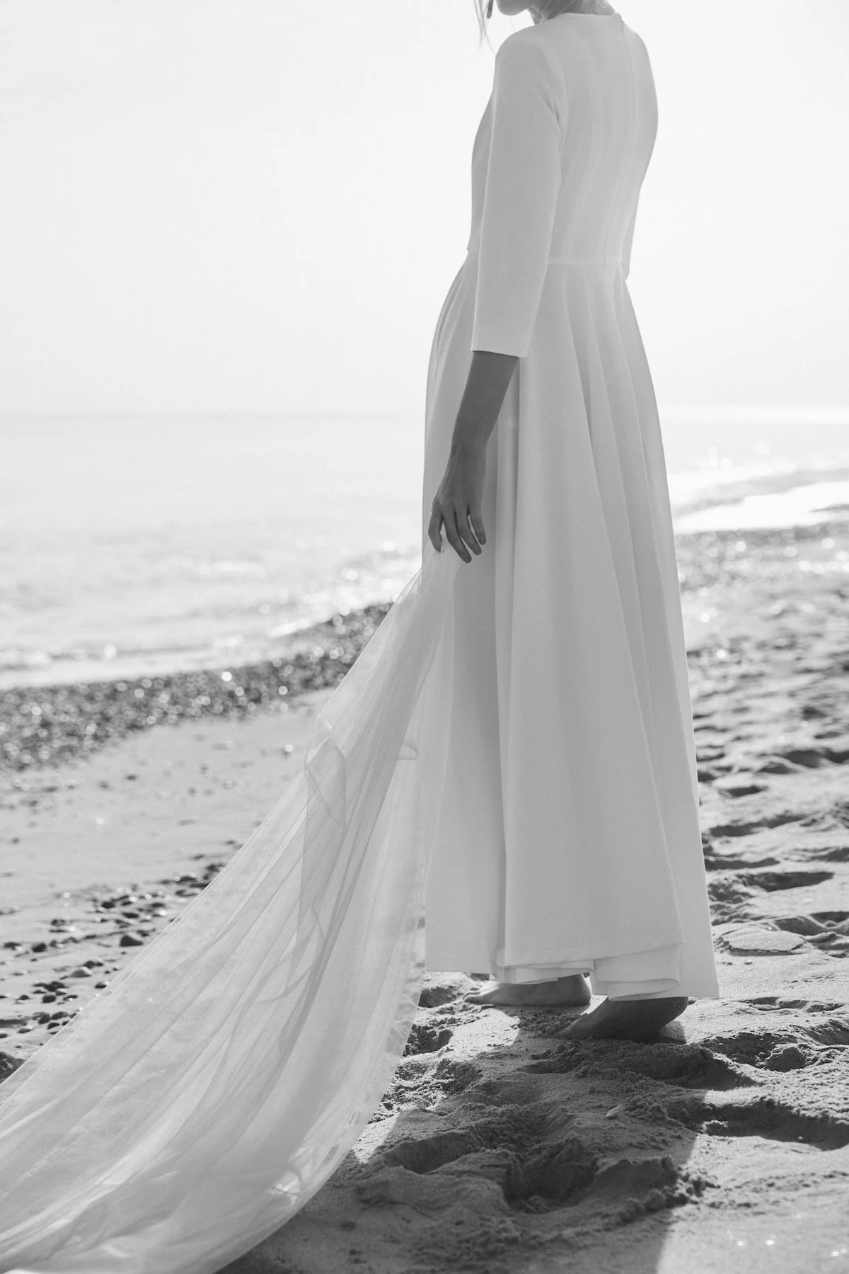 Silueta ajustada hasta la cintura y amplia falda cortada al bies de gran volumen y elegancia.