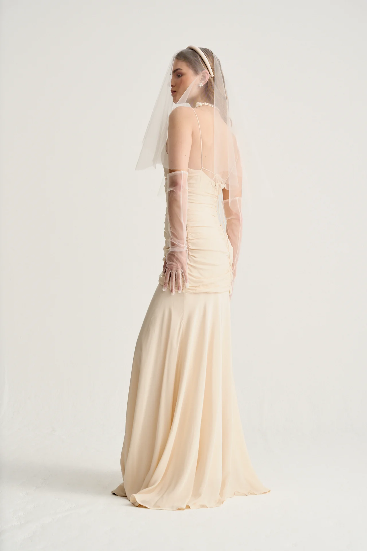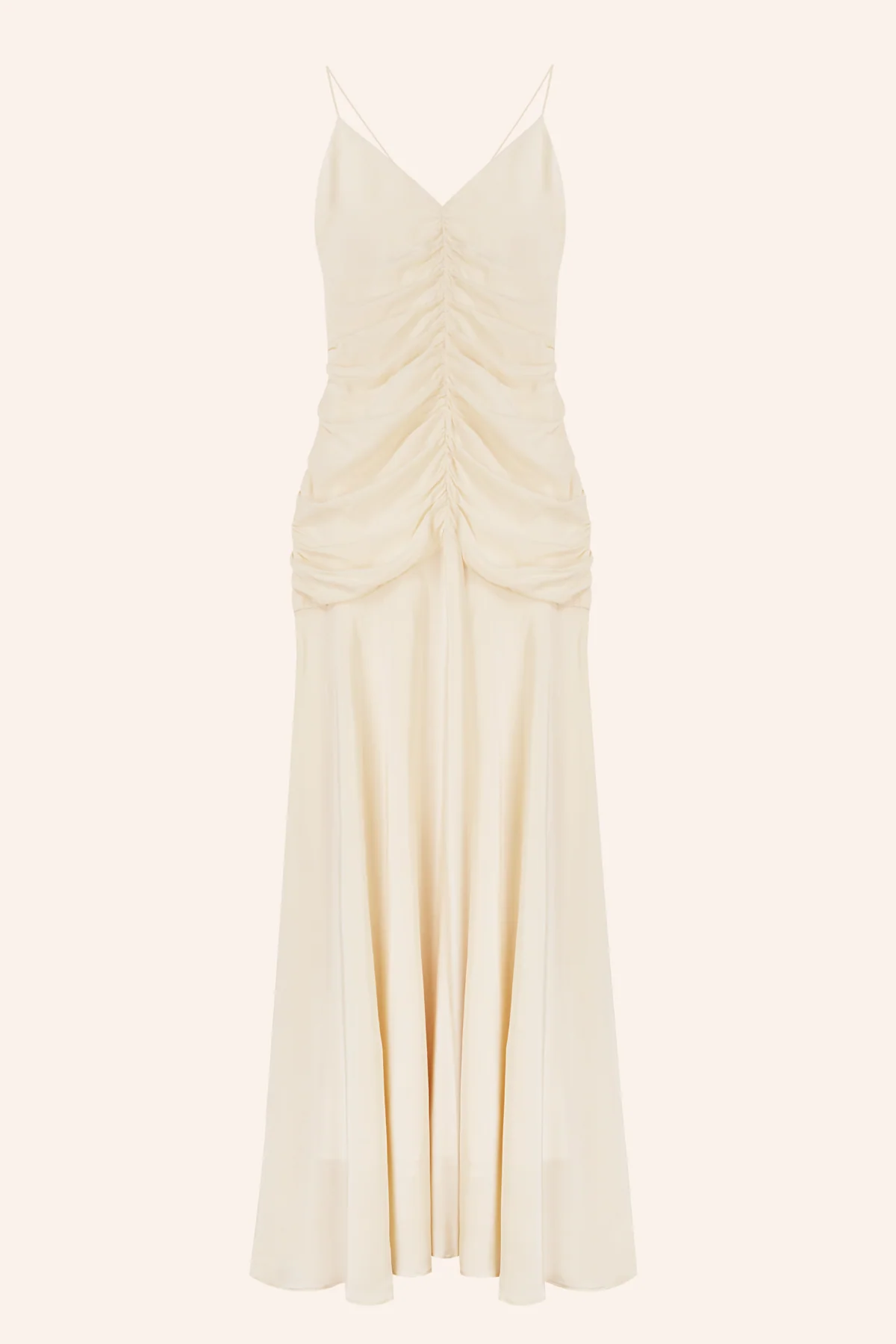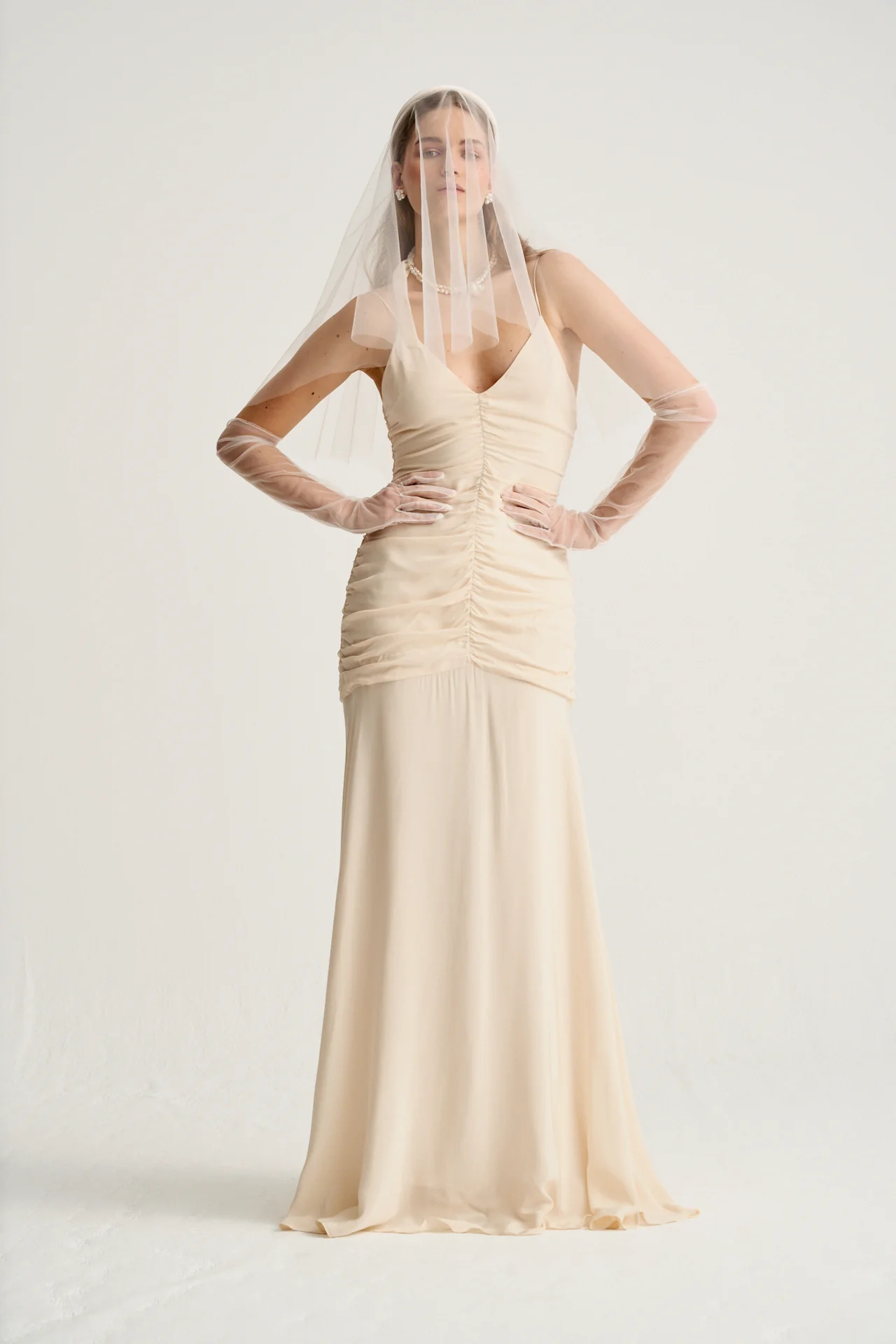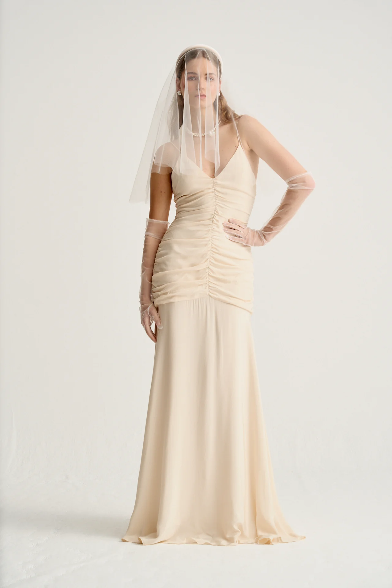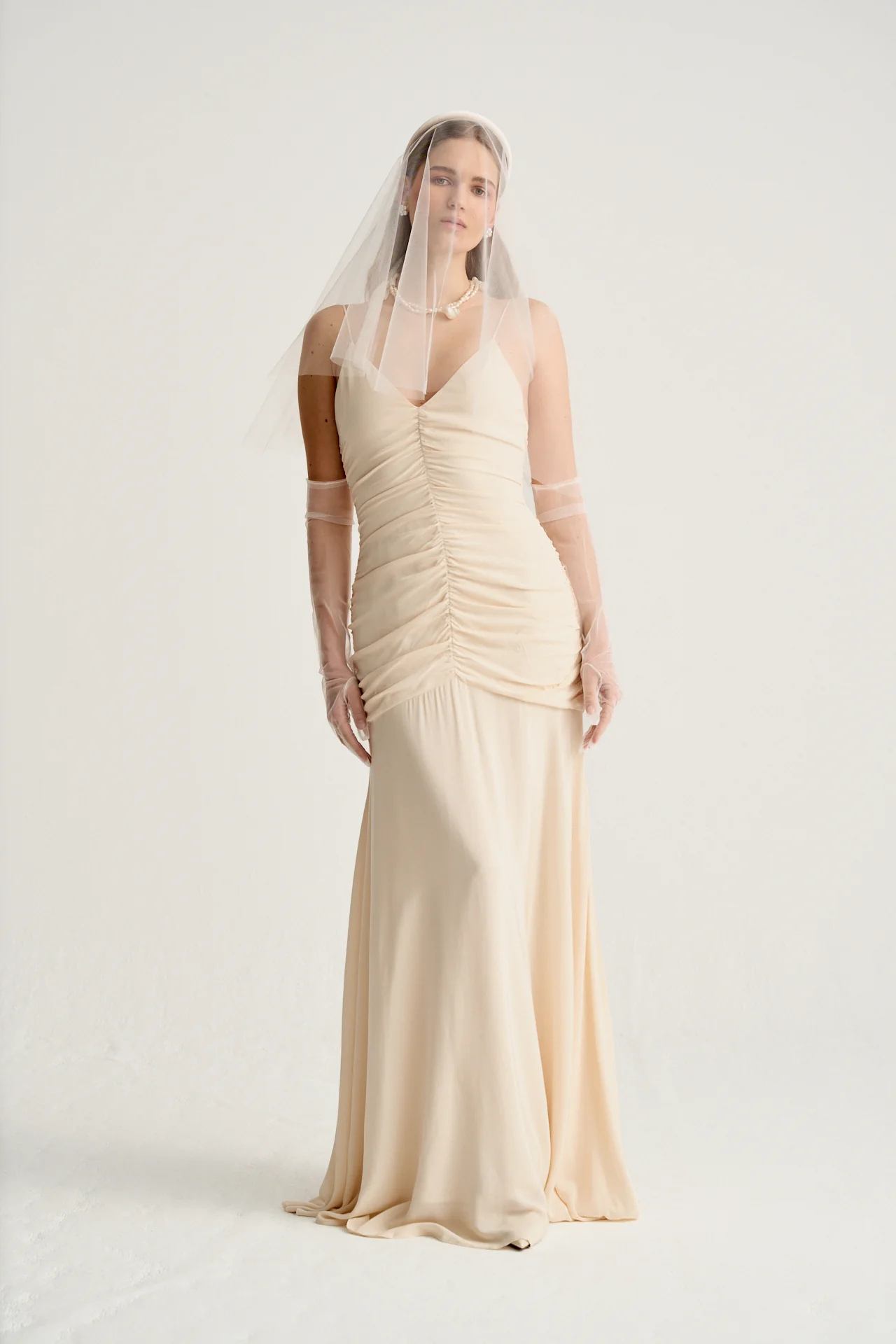 Este vestido de novia en beige vintage, confeccionado en viscosa de alta calidad, es la elecci贸n perfecta para novias que buscan una pieza sofisticada y favorecedora. Los fruncidos a lo largo del cuerpo estilizan la figura de manera elegante, ofreciendo un ajuste perfecto que realza la silueta.