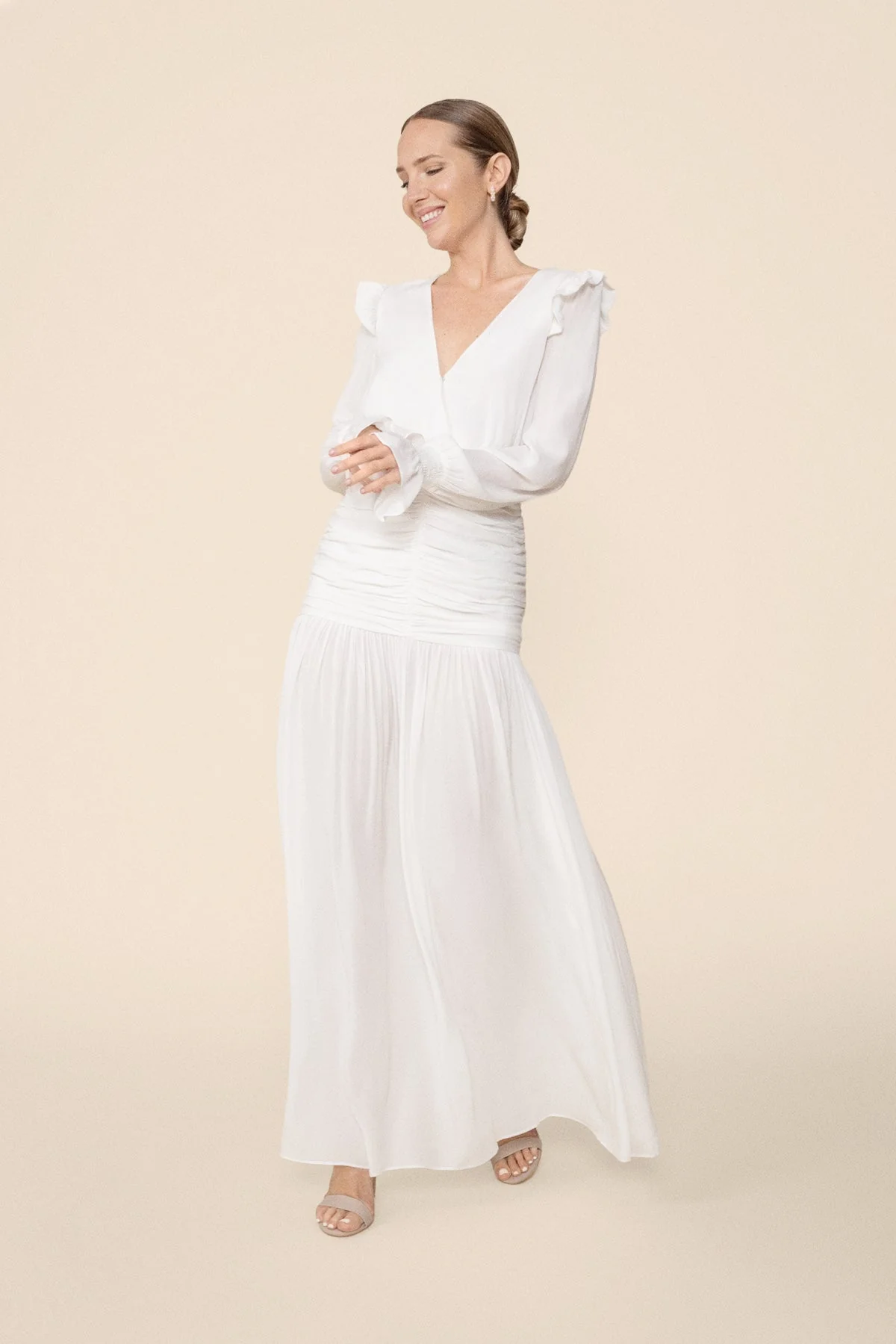 Dise帽o de volantes en hombros. Escote cruzado en V y manga larga con fruncidos de nido de abeja en pu帽o y volante.