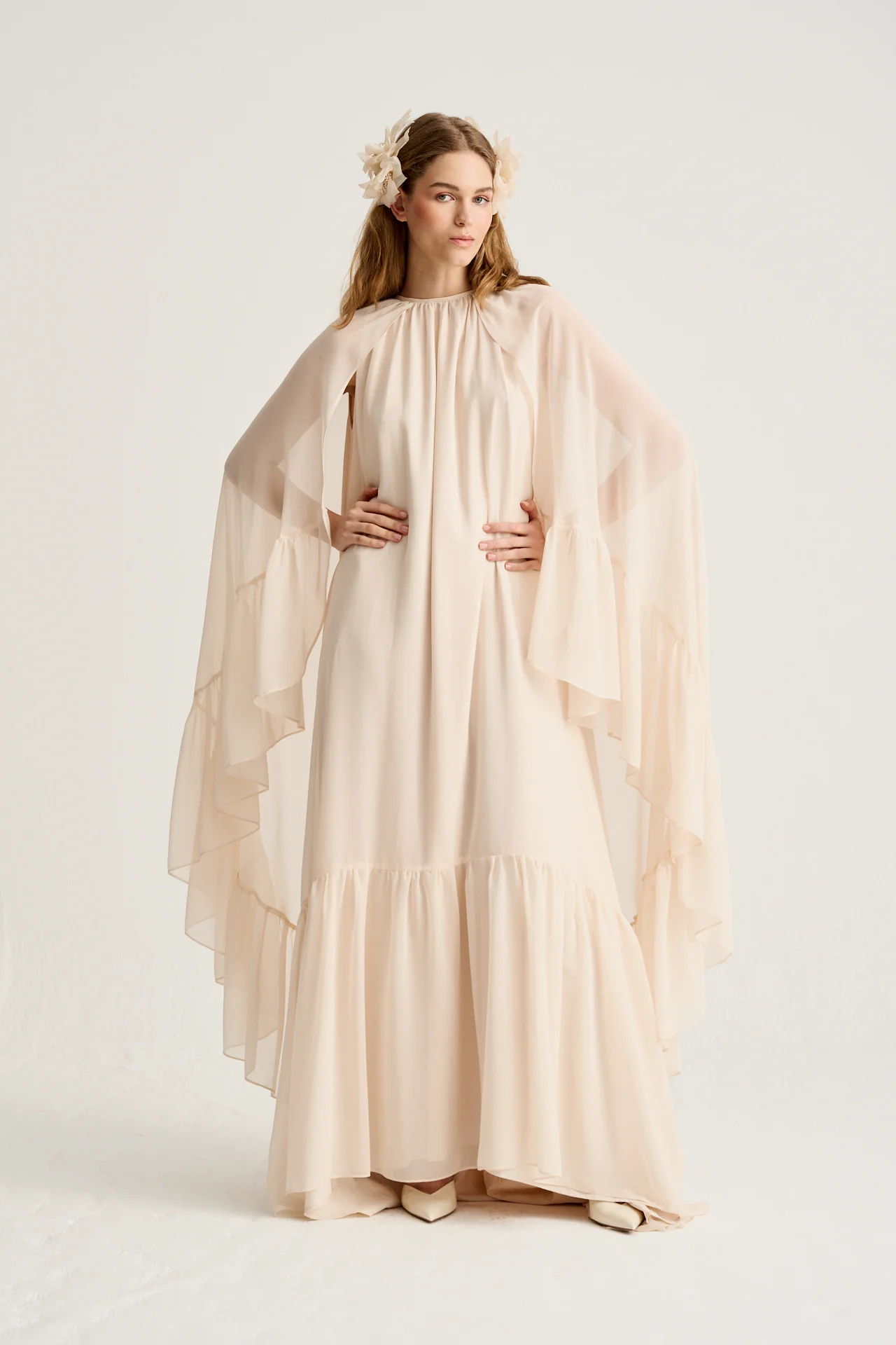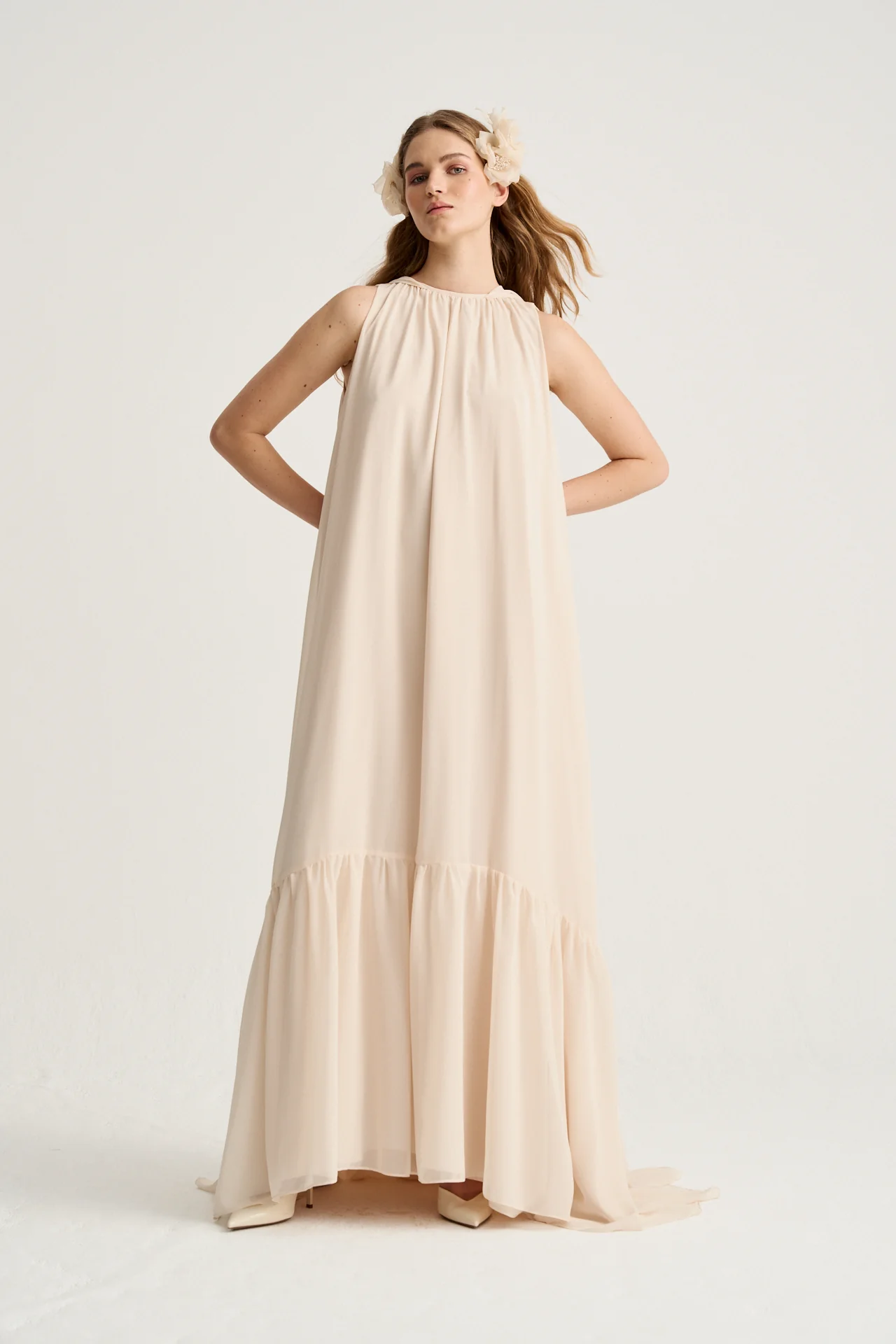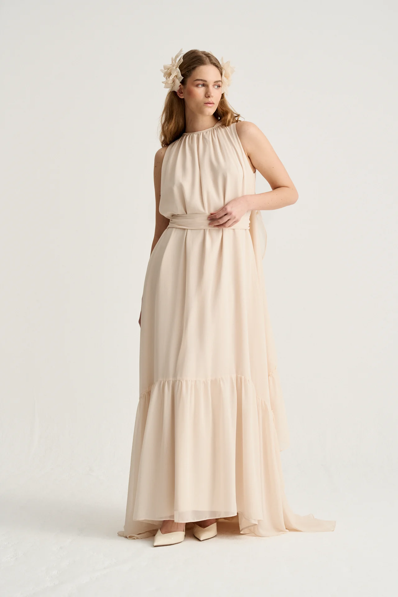 Vestido de novia en gasa beige vintage – Elegancia etérea y versatilidad en un solo diseño
