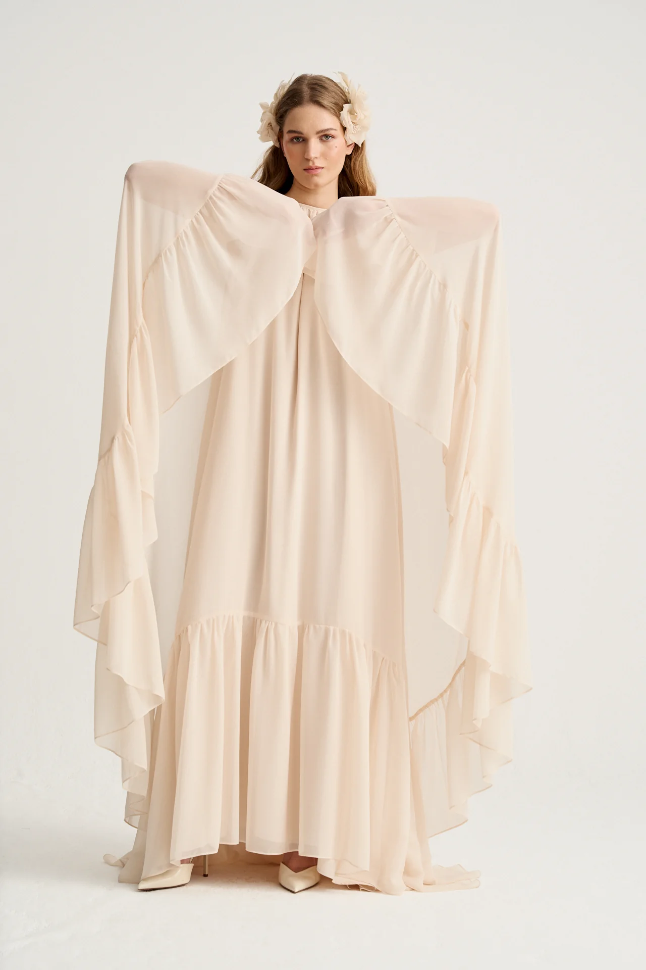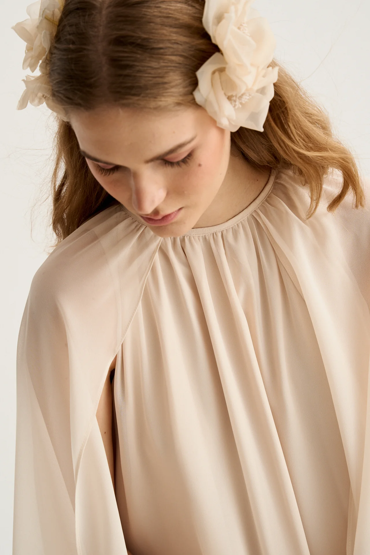 - Confeccionado en gasa de gran caída, que aporta un efecto etéreo y vaporoso.