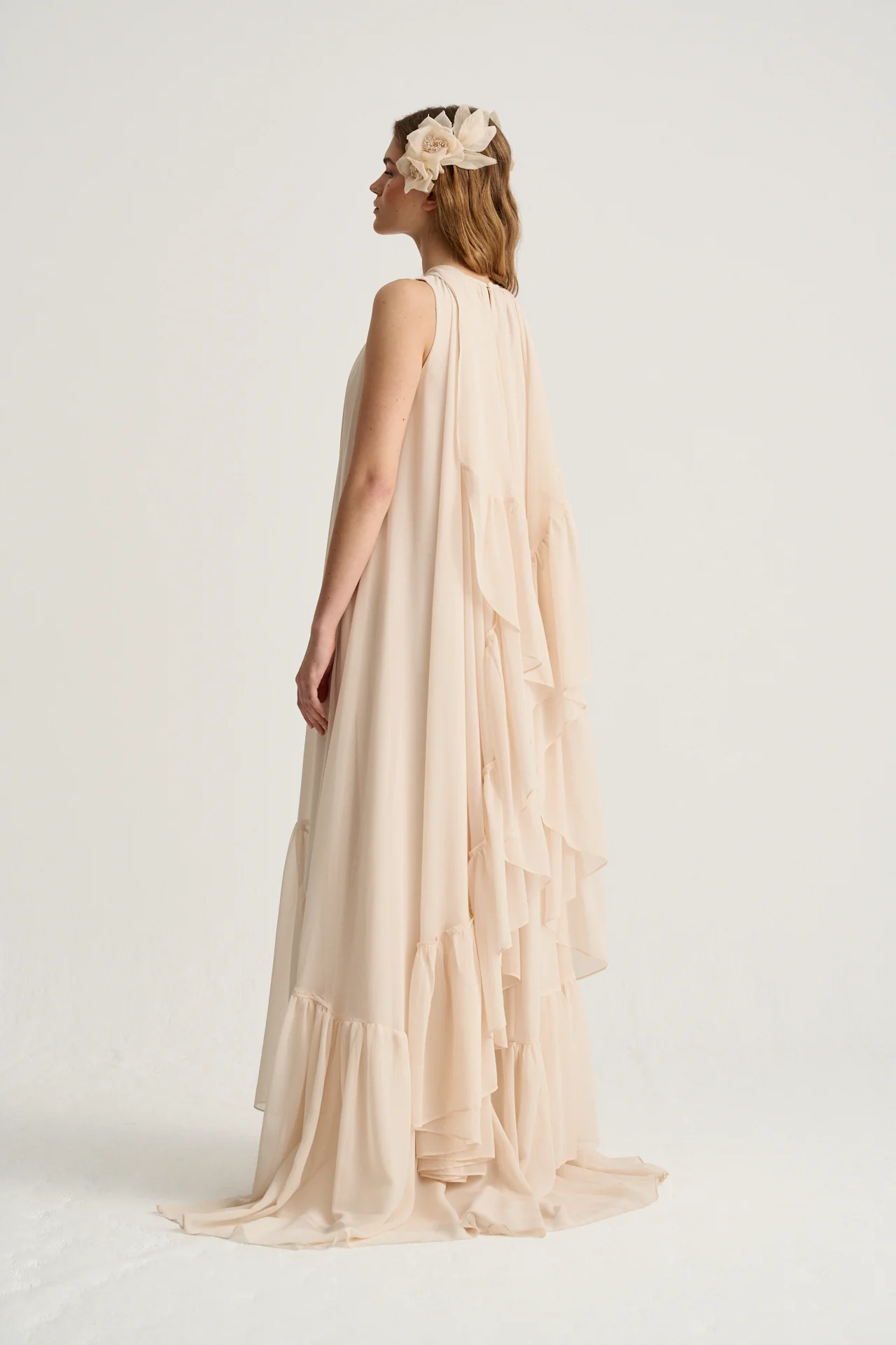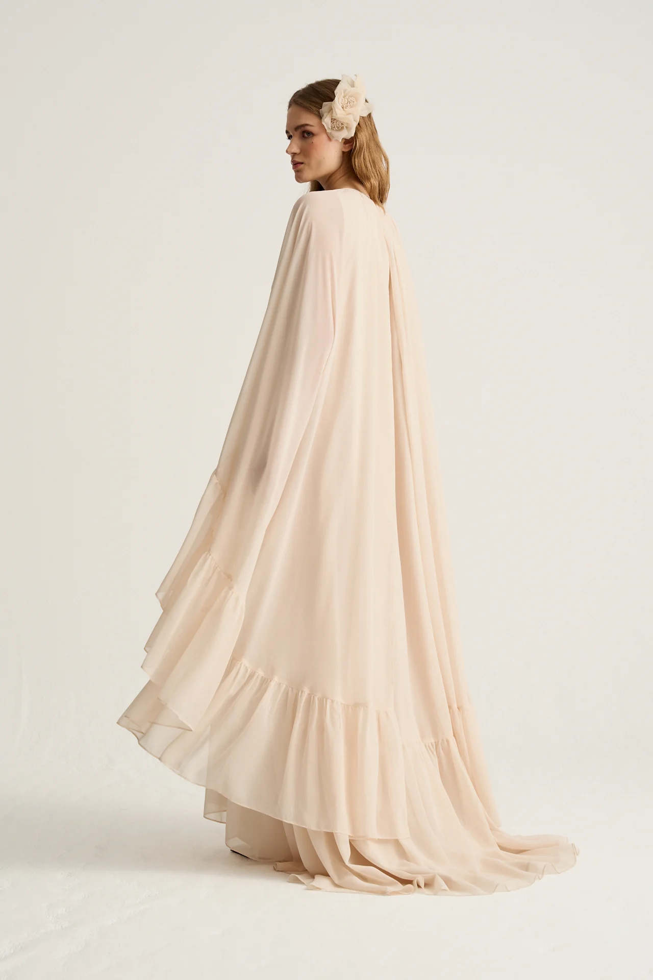 Este vestido de novia en gasa color beige vintage es la opción ideal para novias que buscan un look romántico, sofisticado y con un aire bohemio. Su diseño fluido y ligero envuelve la silueta con delicadeza, creando un movimiento sutil y elegante que realza la belleza natural de cada novia.