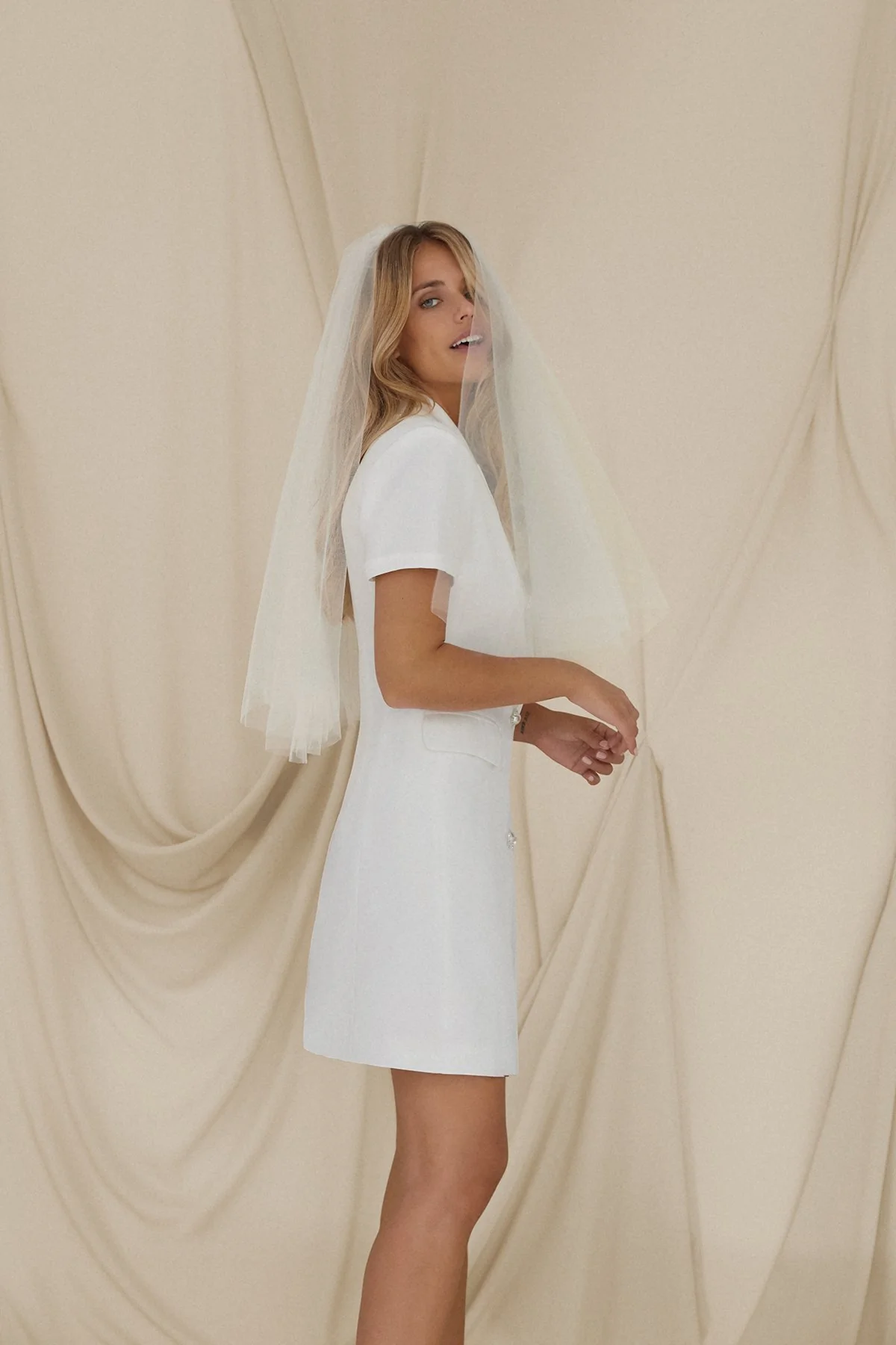 Mini vestido de novia de manga cortita realizado en crepe con textura tipo otoman.