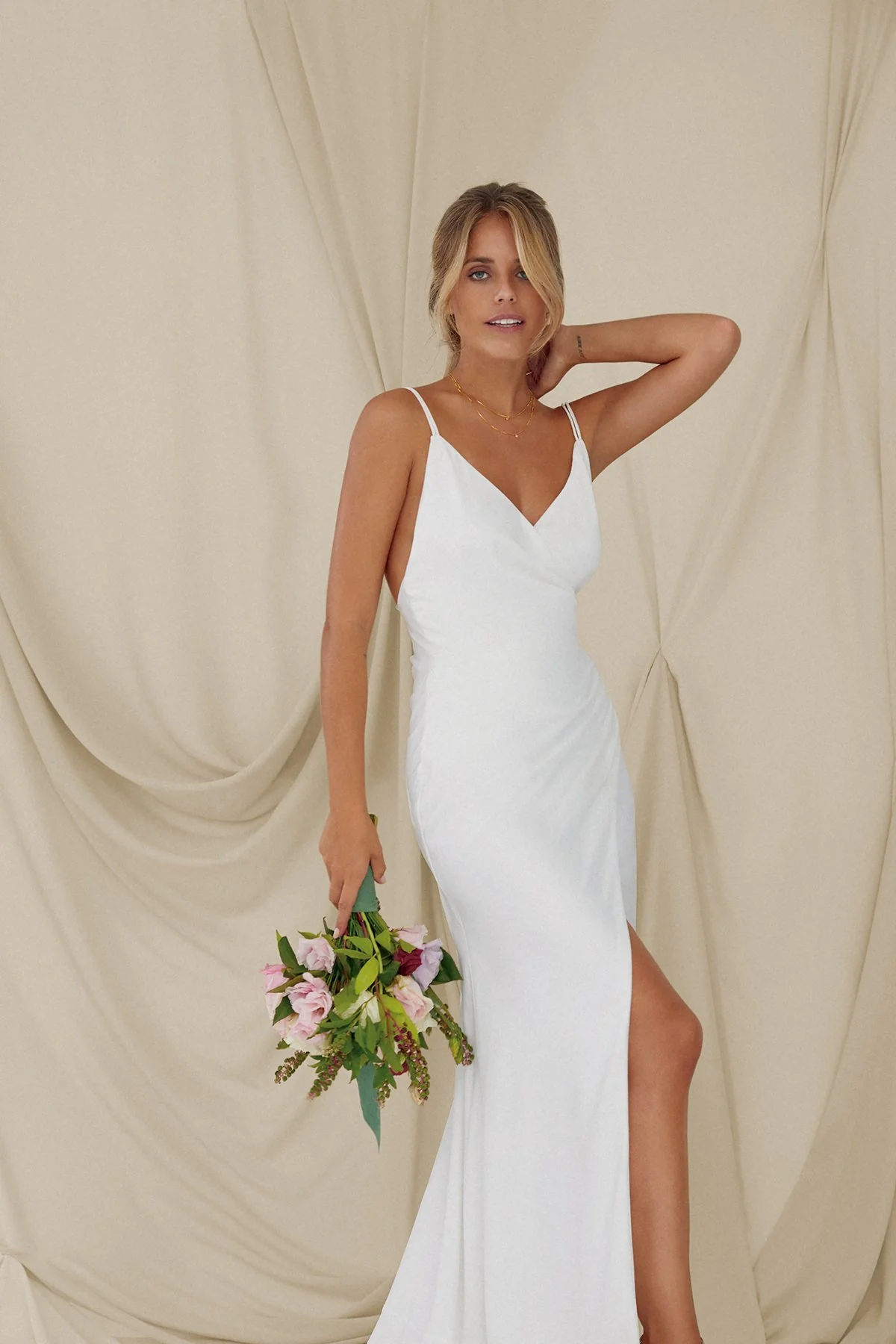 Con escote cruzado y drapeados desde el pecho hasta la cadera super favorecedores. Tirantes dobles realizados en el mismo tejido de saten de gran calidad.