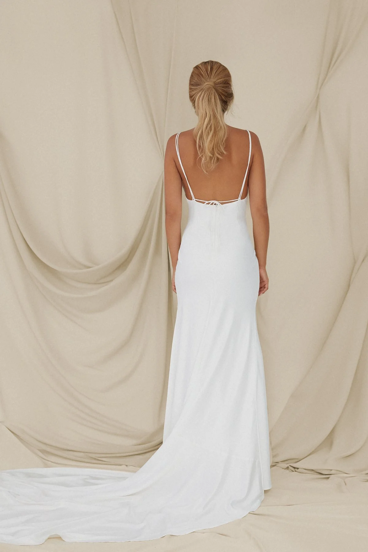 De estilo sencillo y minimalista, elegante y con un toque muy glam gracias a su cola que podr谩s despues colgar y sujetar en la cremallera de para acortarla y poderte mover c贸modamente durante el baile.