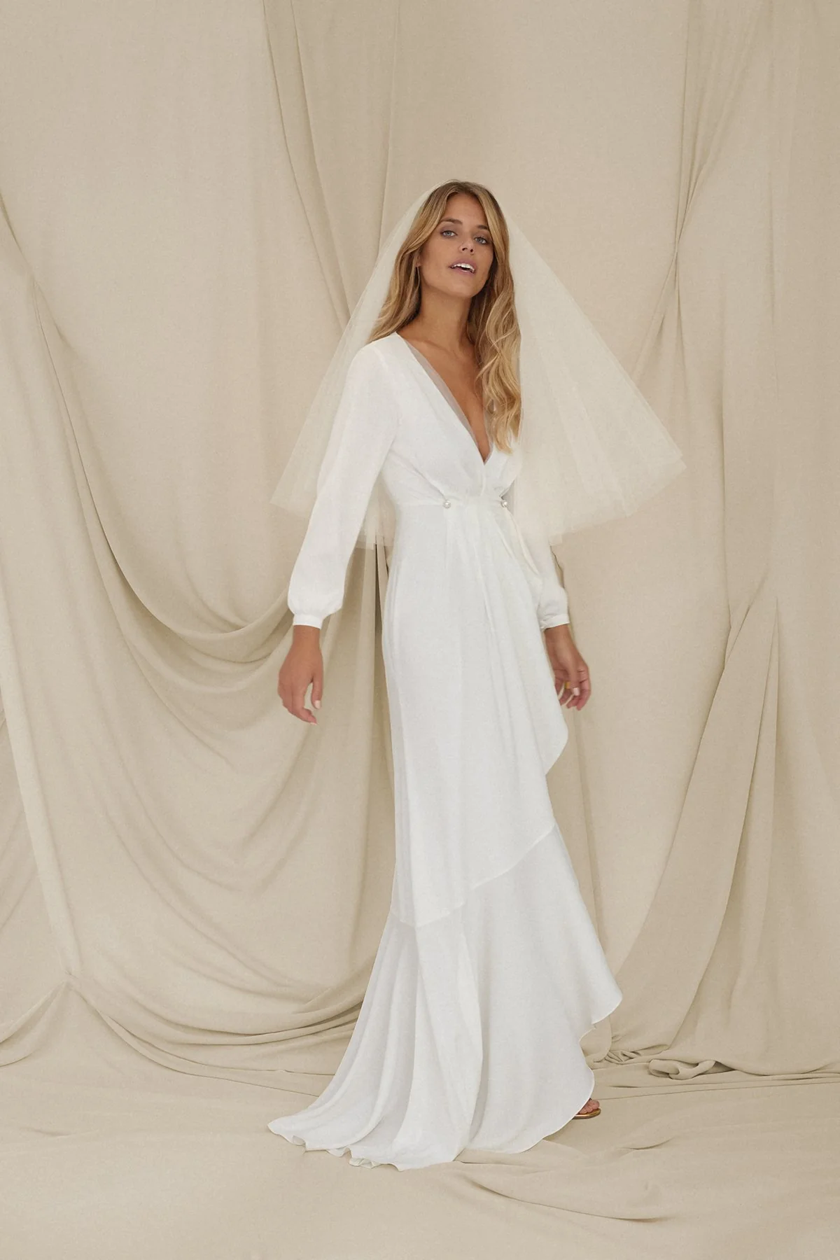 Escote cruzado con dise帽o de organza doble a lo largo del escote y manga larga (adoramos las mangas largas para novia!) ligeramente abullonada en los pu帽os y con detalle de botoncito joya.