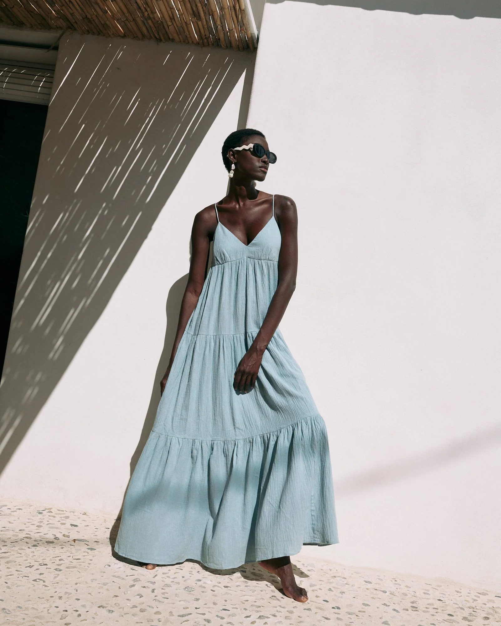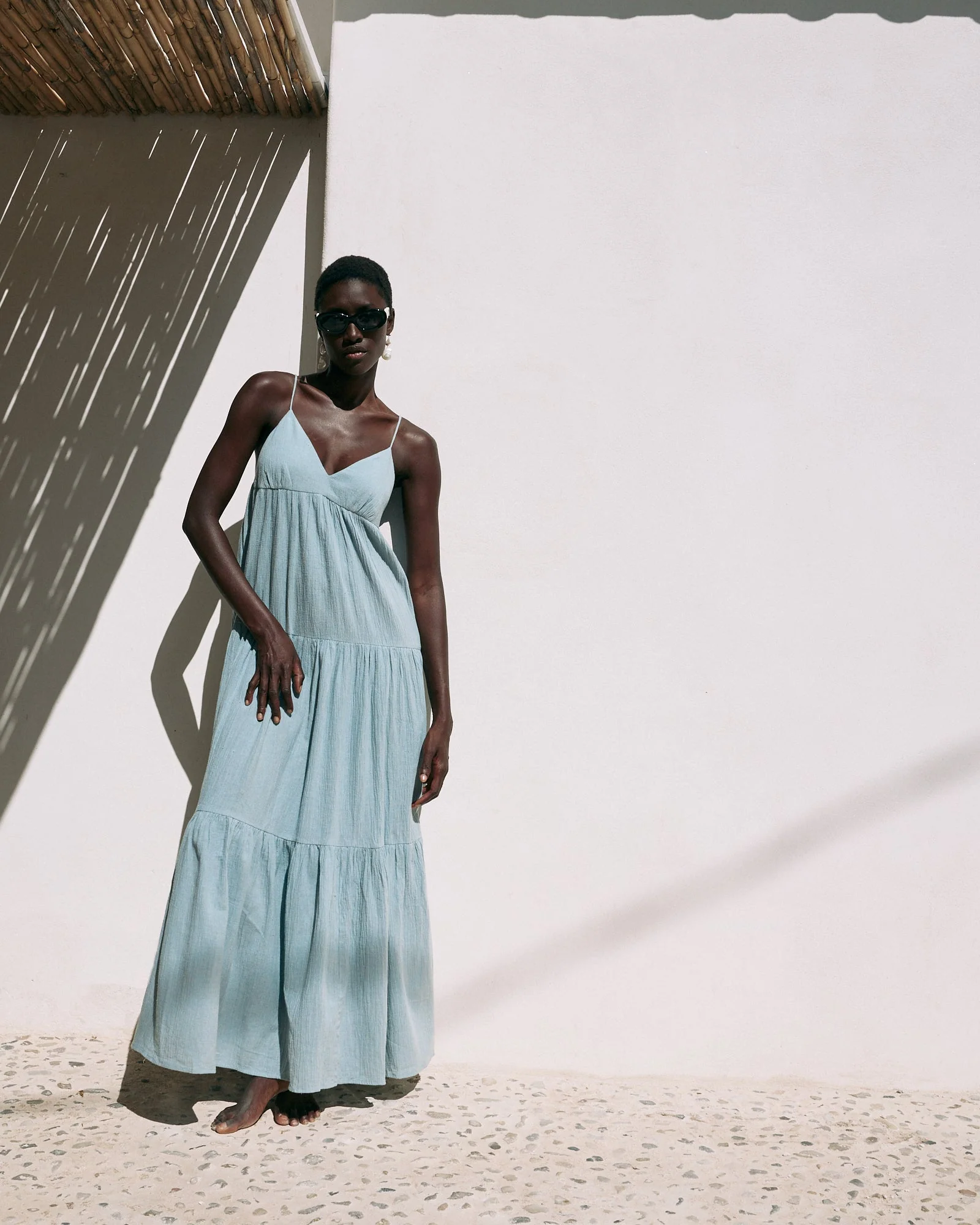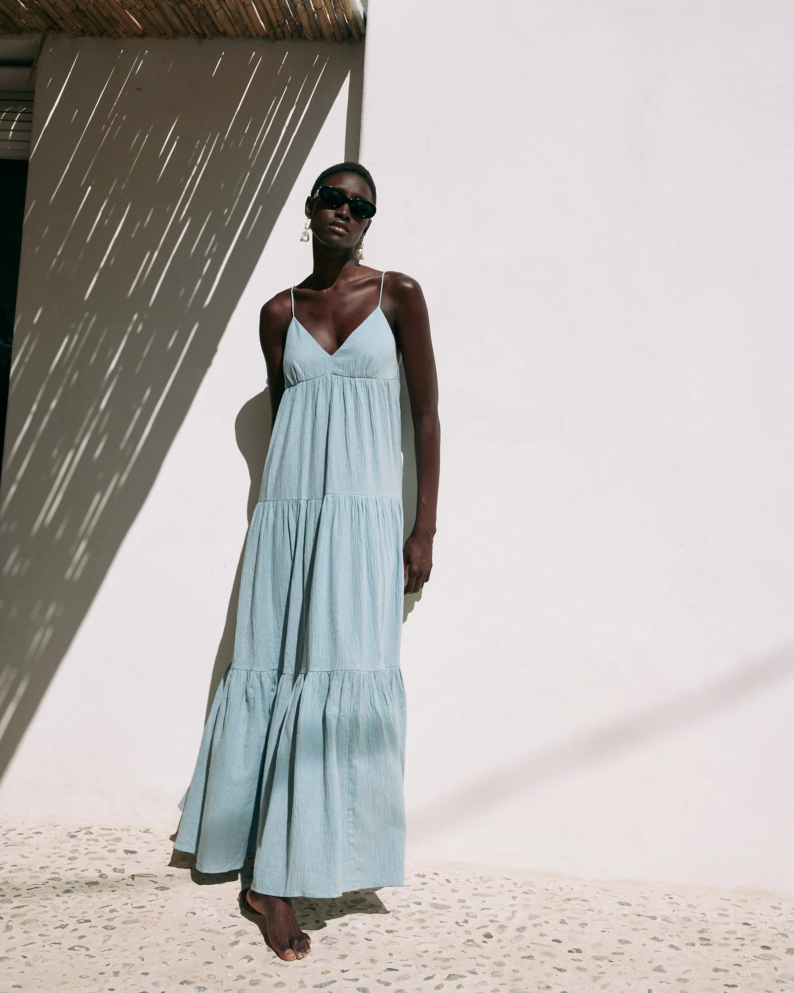 Vestido largo confeccionado en mezcla de algod贸n y lino con tirantes regulables y volantes en falda.