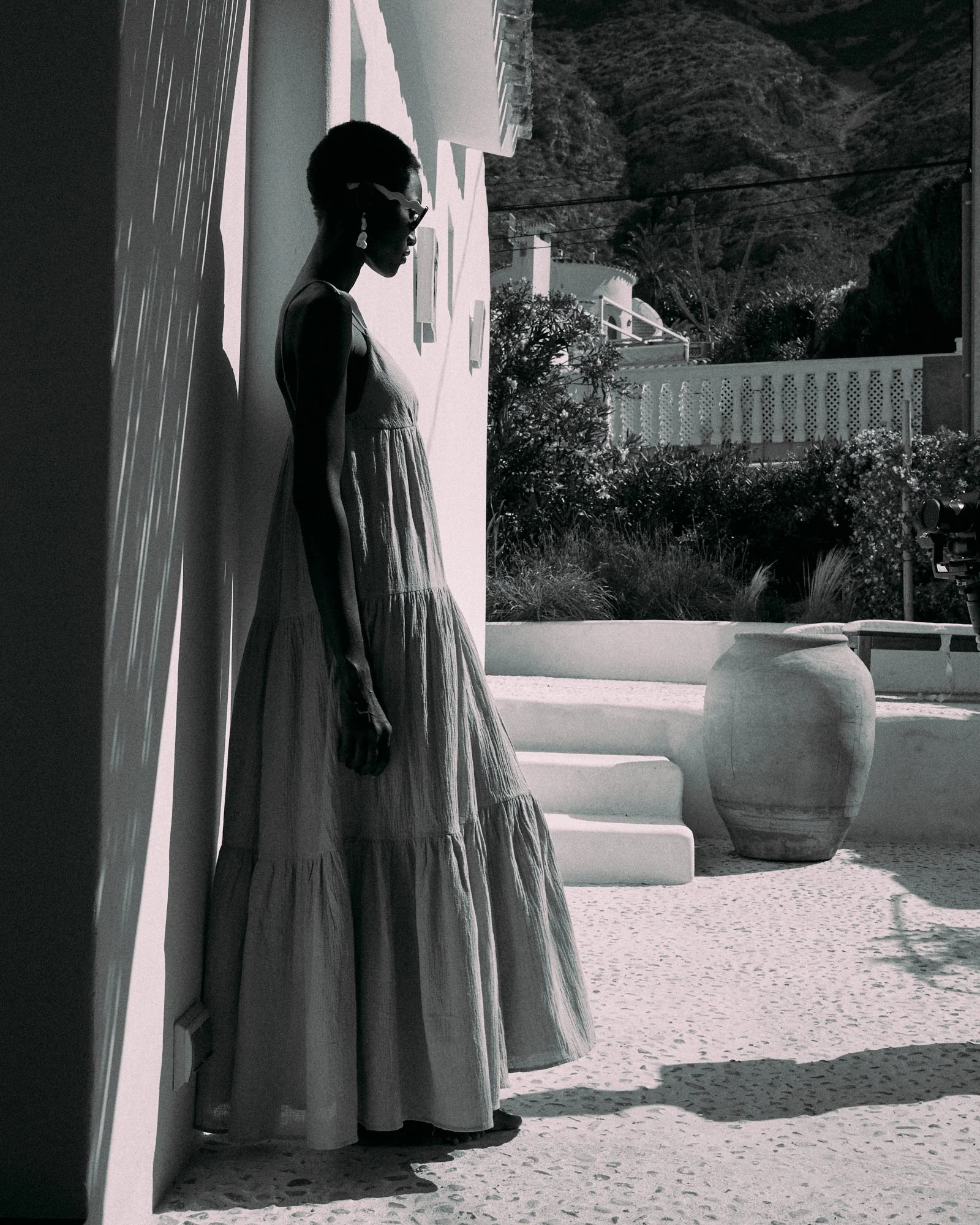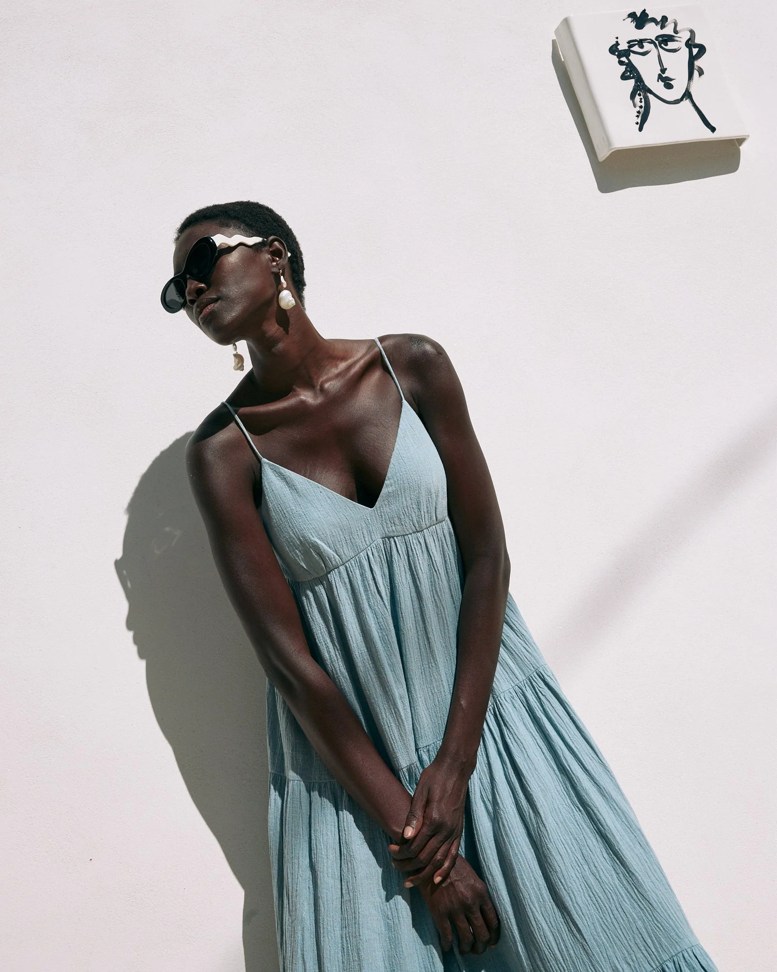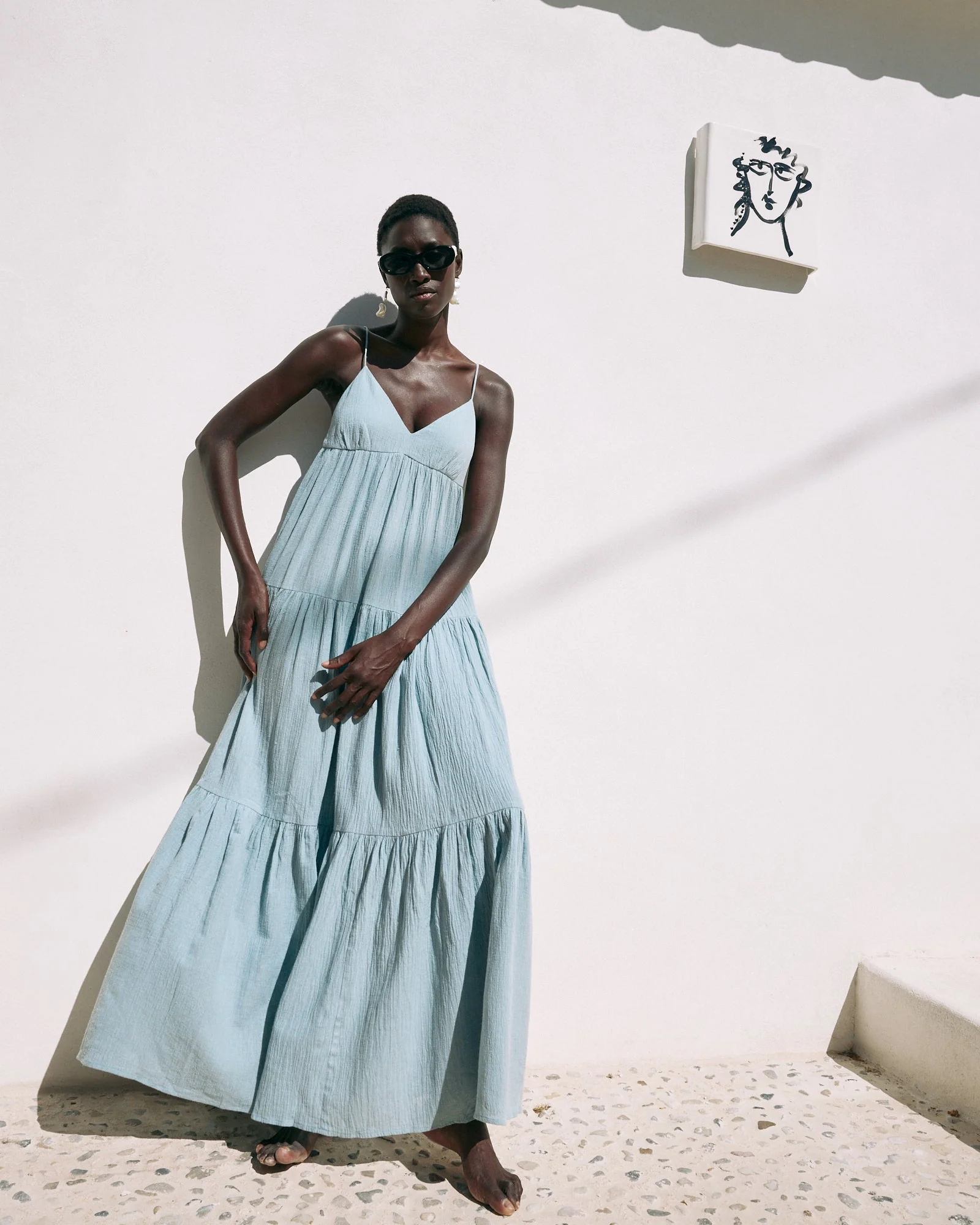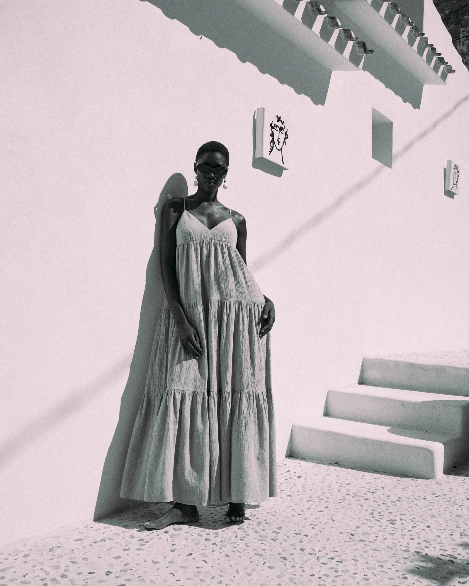 Vestido largo confeccionado en mezcla de algod贸n y lino con tirantes regulables y volantes en falda.