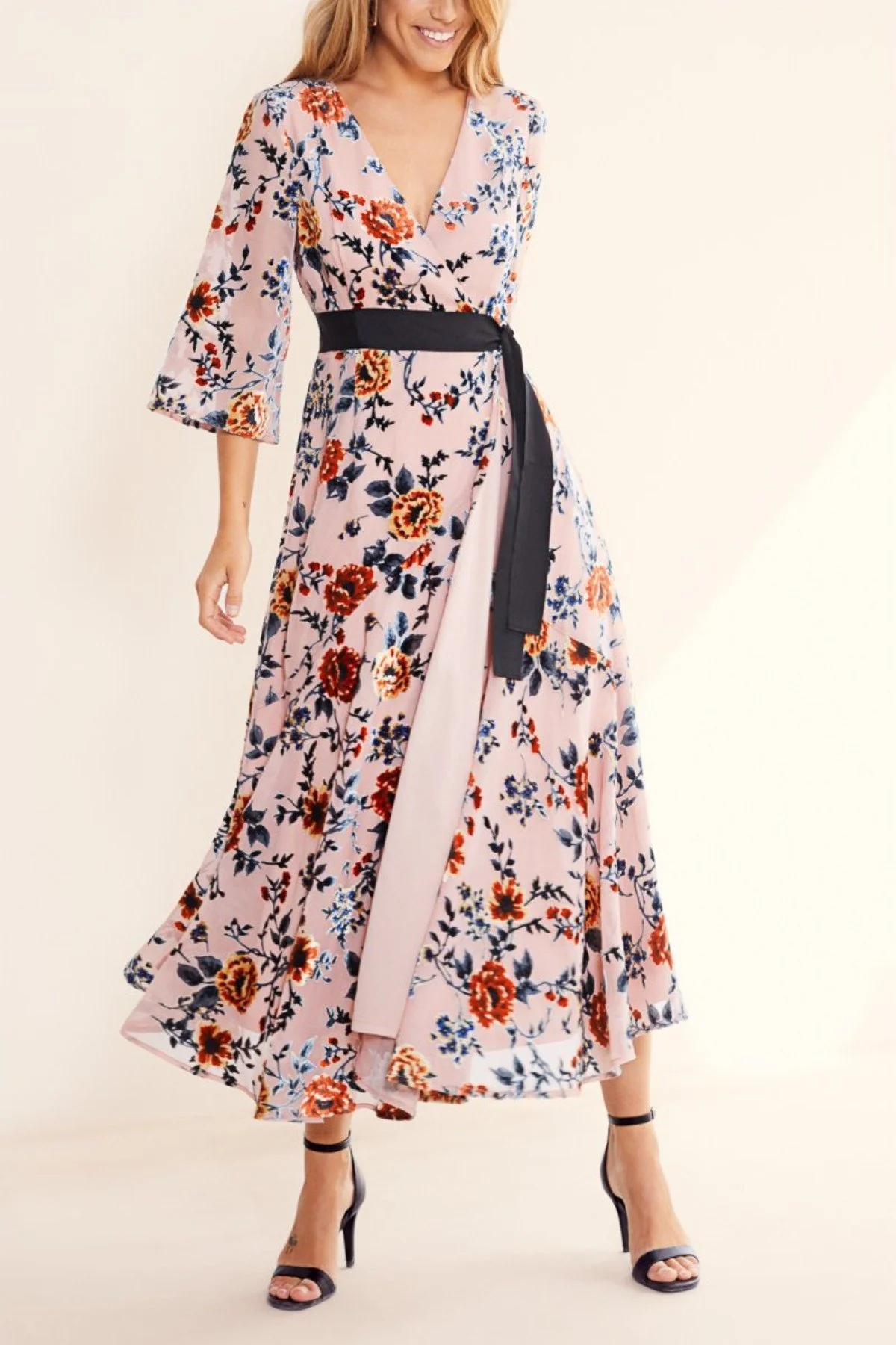 Este vestido de fiesta en terciopelo devoré estampado combina sofisticación y estilo atemporal. Su diseño inspirado en el kimono, con escote cruzado y manga japonesa, aporta un aire refinado y favorecedor.