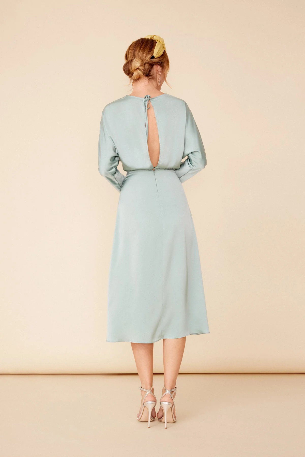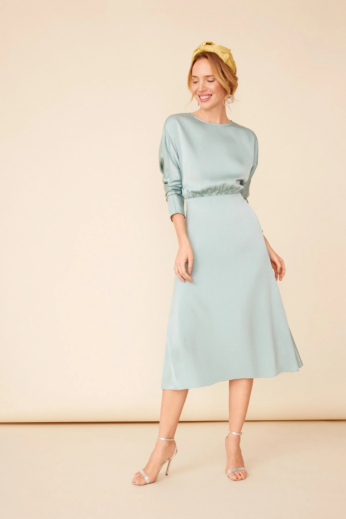 Inspirado en nuestro vestido Zulay, que tanto os gust贸 en temporadas anteriores, ahora con cuello a la caja y abertura en la espalda pero manteniendo las elegantes mangas murci茅lago y la falda evas茅. Un must en tu armario.