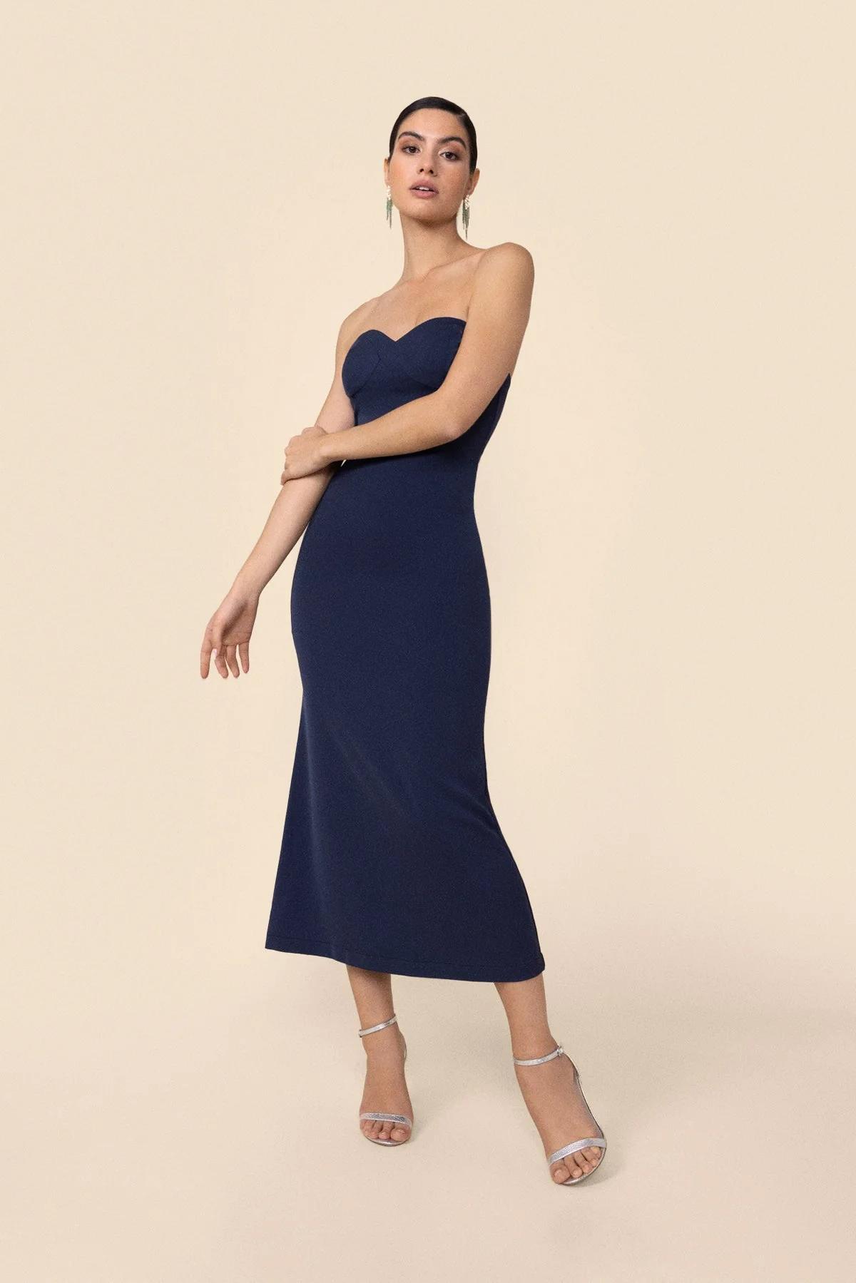Este vestido midi de fiesta es la elecci贸n ideal para eventos donde el estilo y la elegancia se destacan. Con un corte cl谩sico y sencillo, su dise帽o resalta la figura de manera sofisticada y chic.