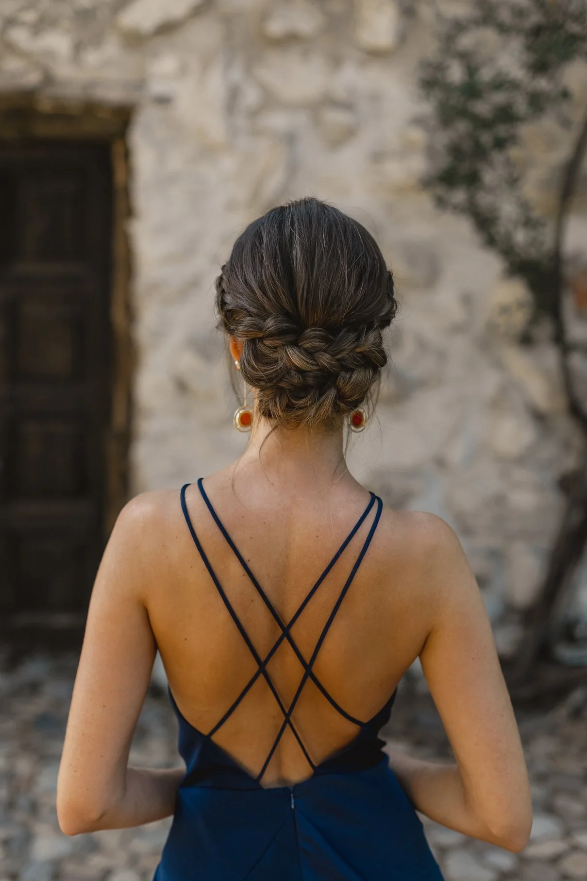 - Escote en la espalda con tirantes cruzados que a帽aden un toque sexy y moderno, perfecto para eventos de noche o celebraciones de d铆a.