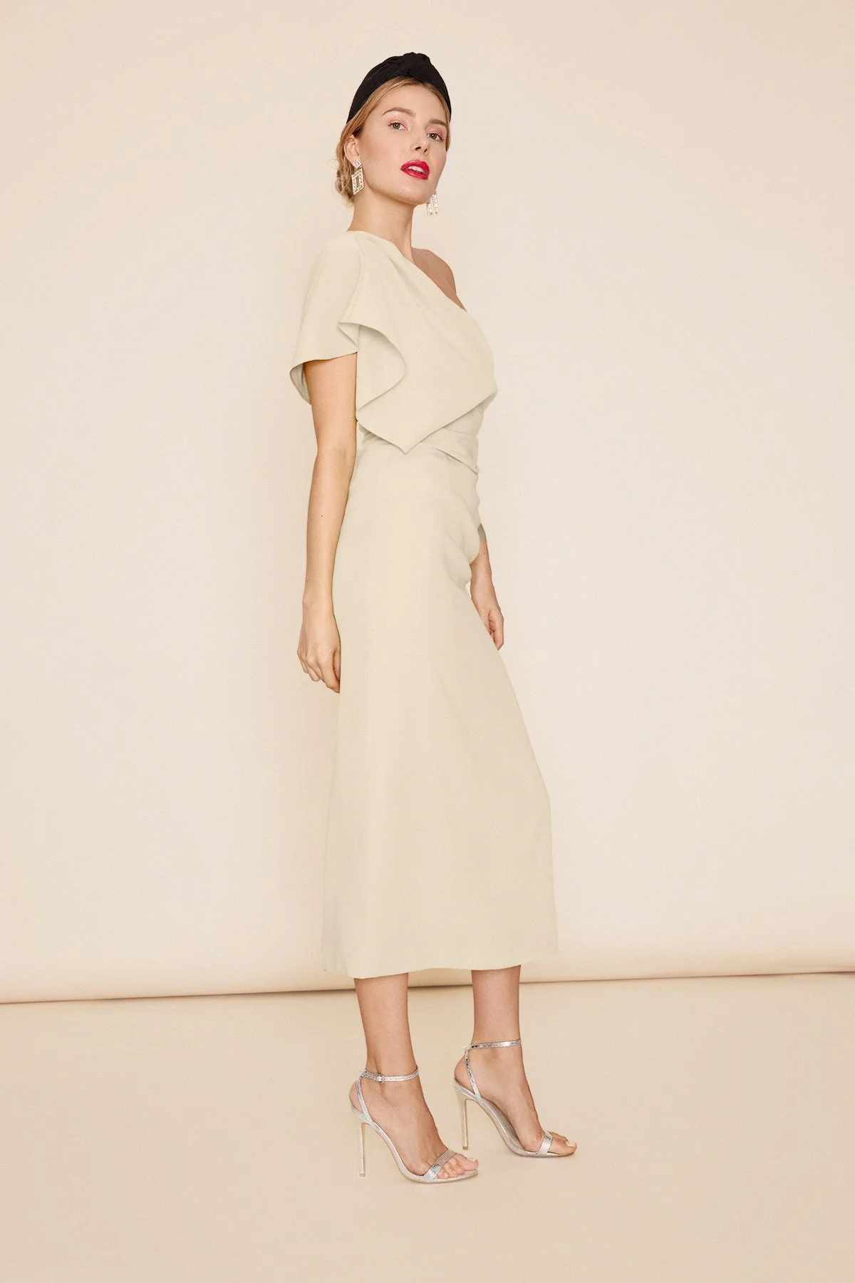 Este vestido de fiesta esta confeccionado con tejido tipo crepe elástico que no se arruga nada. Escote asimétrico y manga japonesa con vuelo.