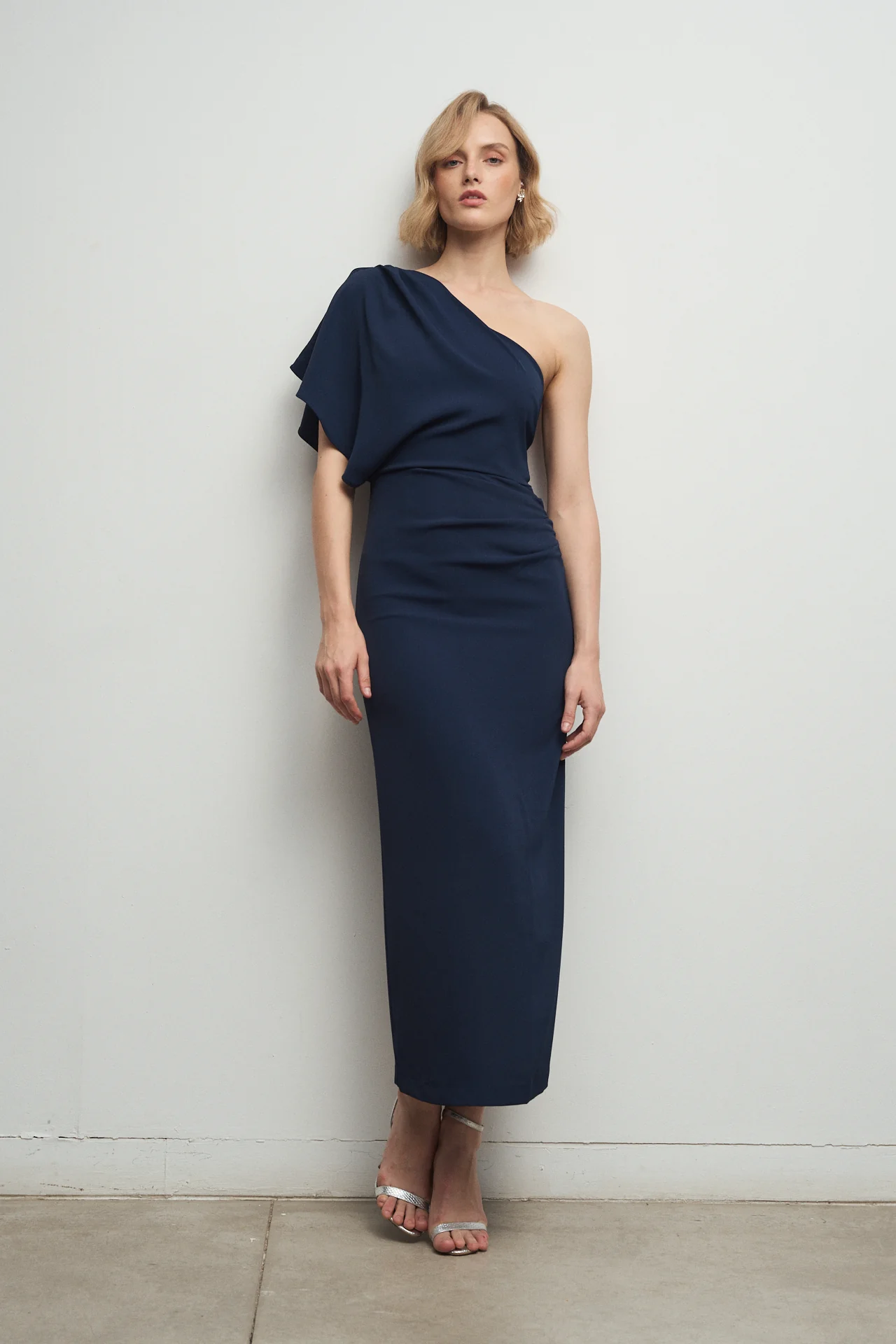 Este vestido est谩 confeccionado en un tejido tipo crep茅 el谩stico de alta calidad, que garantiza un look impecable sin arrugas, manteni茅ndote perfecta durante toda la celebraci贸n.