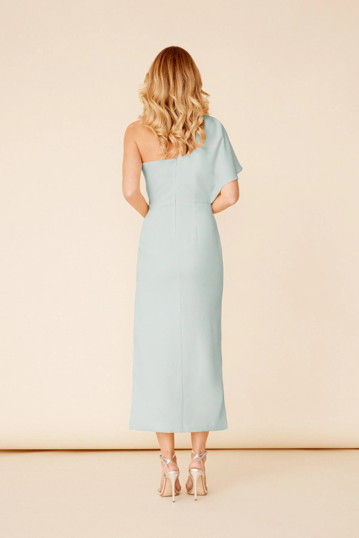 Vestido midi de fiesta para invitadas con escote asim茅trico y manga japonesa.