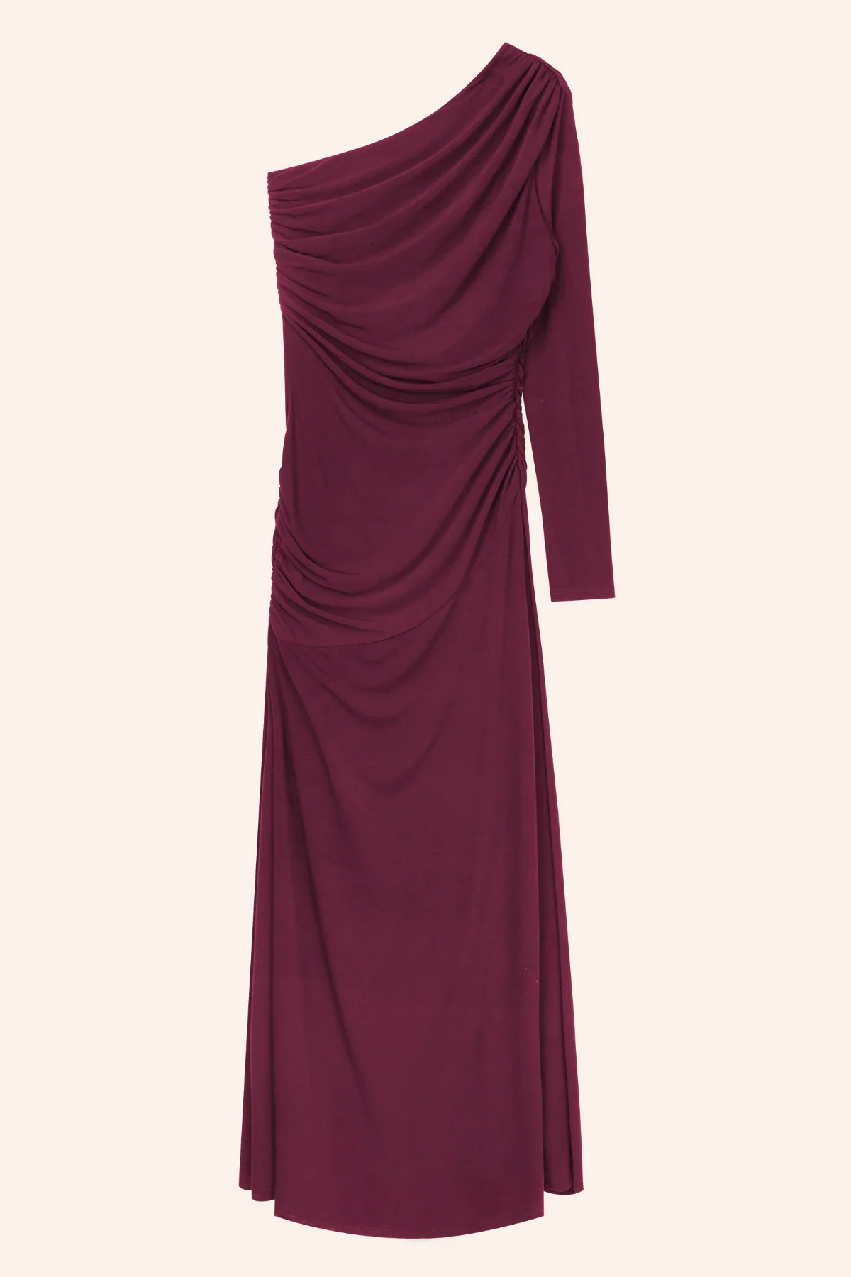 Confeccionado en punto de seda suave y fluido, este vestido garantiza comodidad y un acabado impecable. Su tonalidad ciruela transmite una elegancia atemporal con un matiz contemporáneo, ideal para destacar con confianza y personalidad.