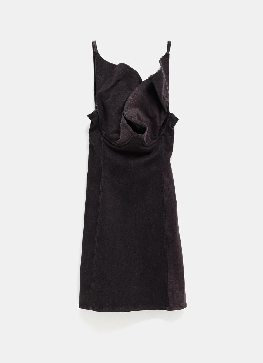 Vestido mini de Y/Project en denim arrugado, con tirantes ajustables, escote rizado, cierre con cremallera en la espalda y largo por mitad del muslo. Hecho en Portugal. Corte ajustado. Talla normal, elije tu talla habitual. Tallaje francés.