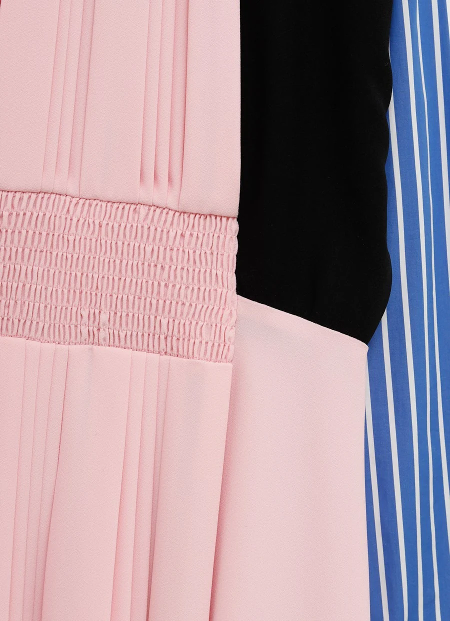 Vestido midi plisado con bloques de color de Prada. Cuello alto, mangas largas con puños abotonados, detalles plisados, cierre de cremallera oculta en el centro de la espalda y cinturilla elástica. Talla 42, tallaje italiano, corte regular. Hecho en Italia. Muy buen estado.