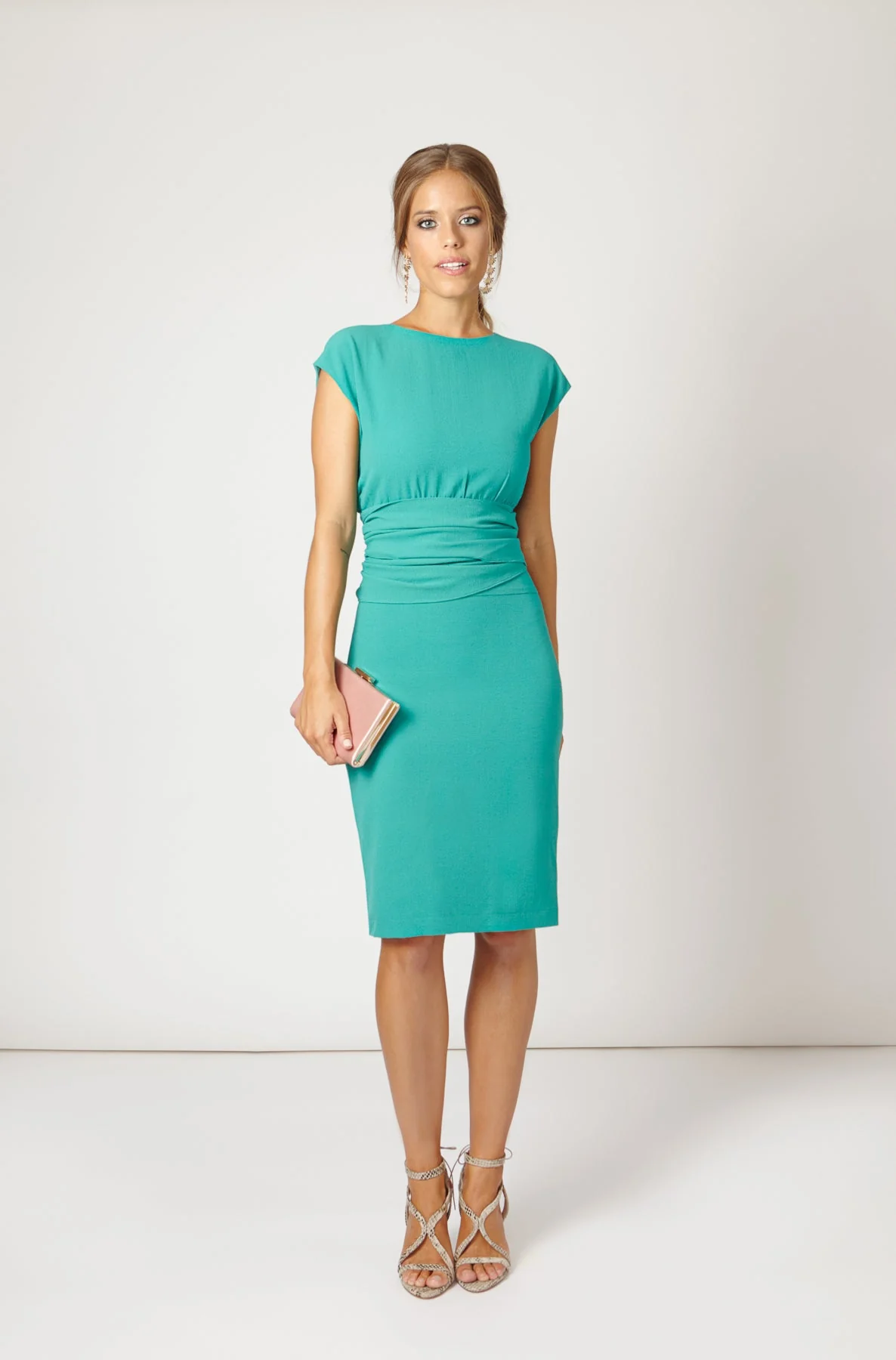 Vestido corto confeccionado en tejido tipo crepe en color turquesa.