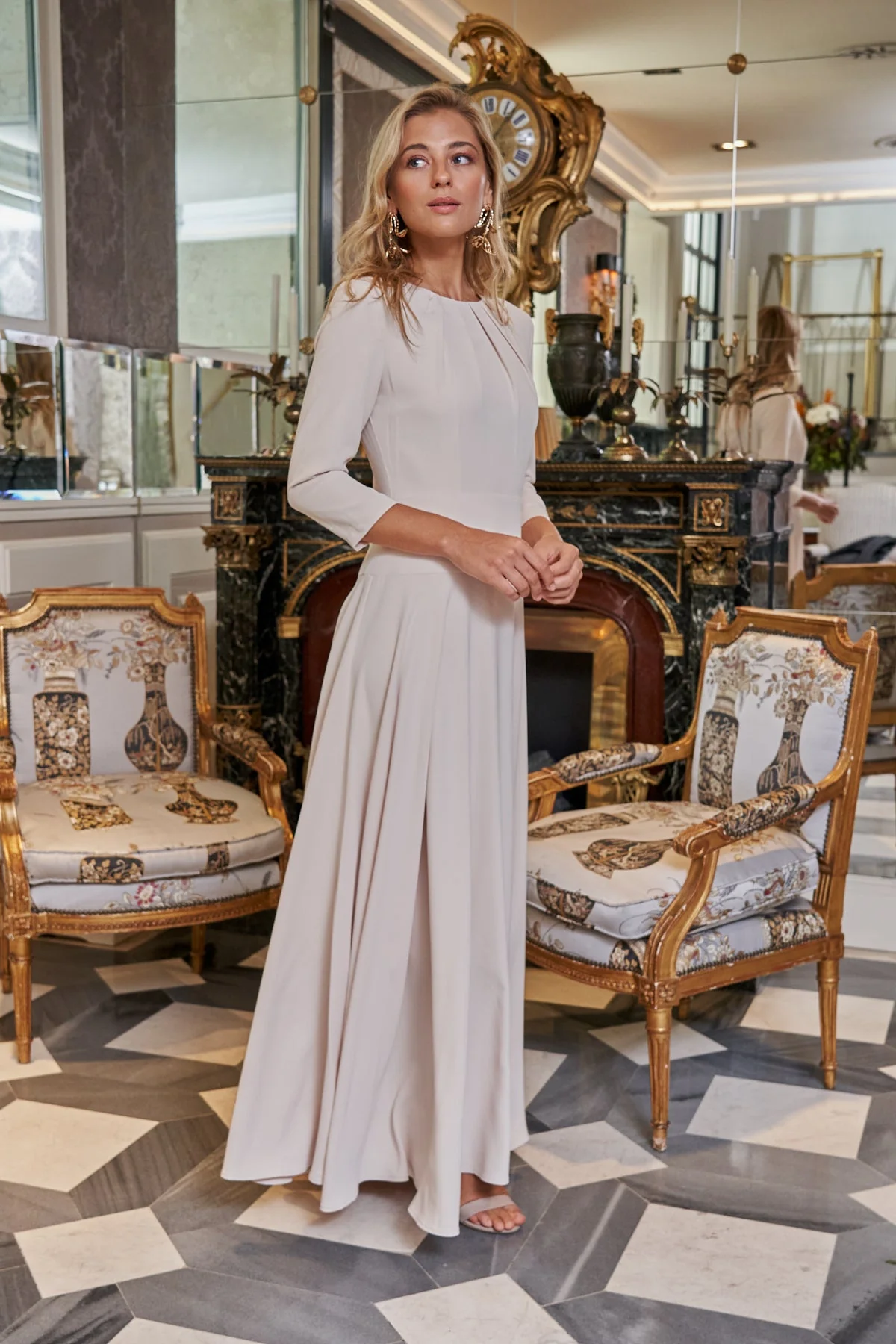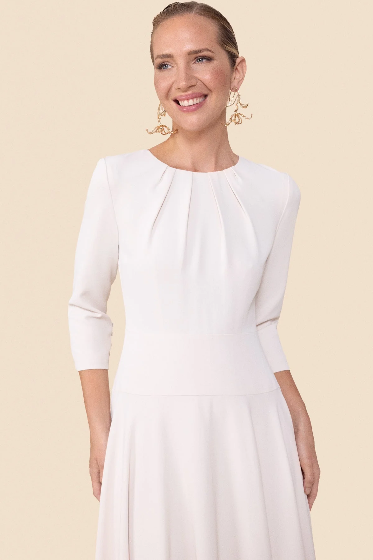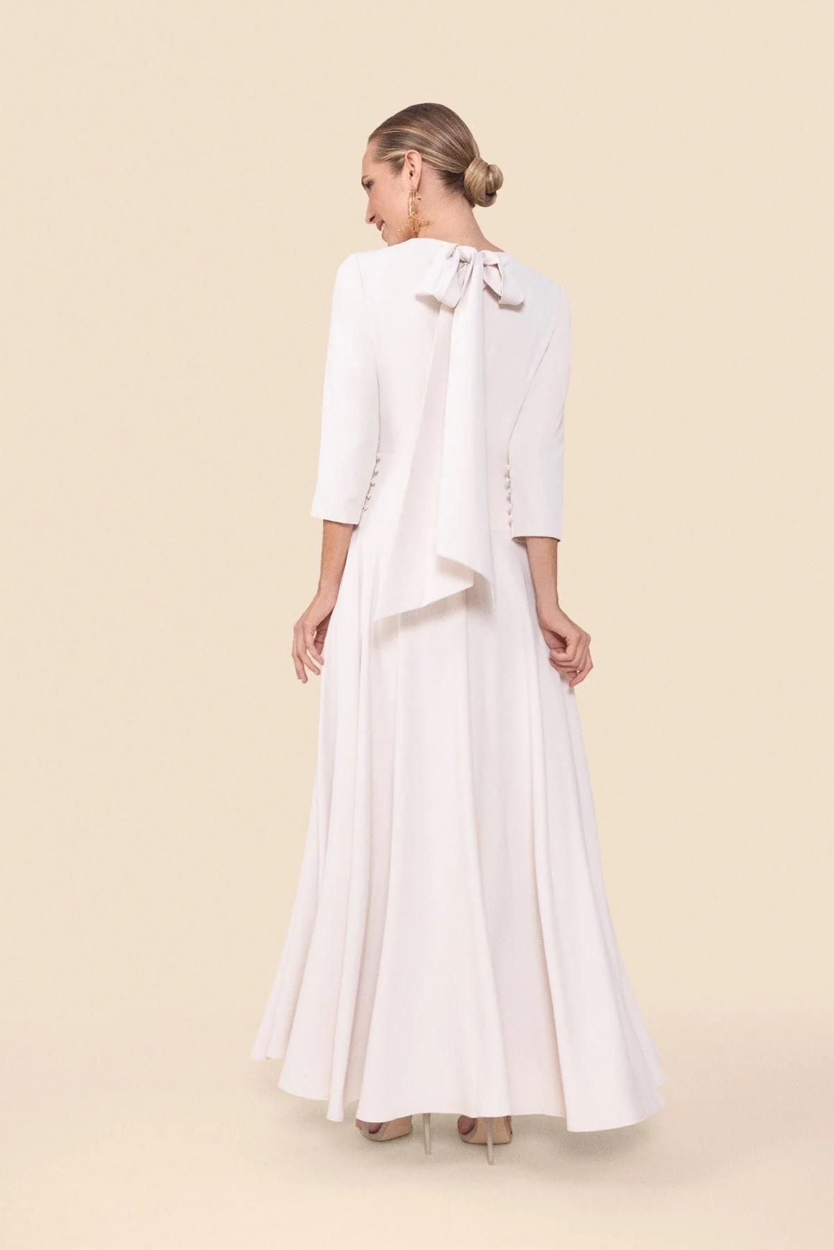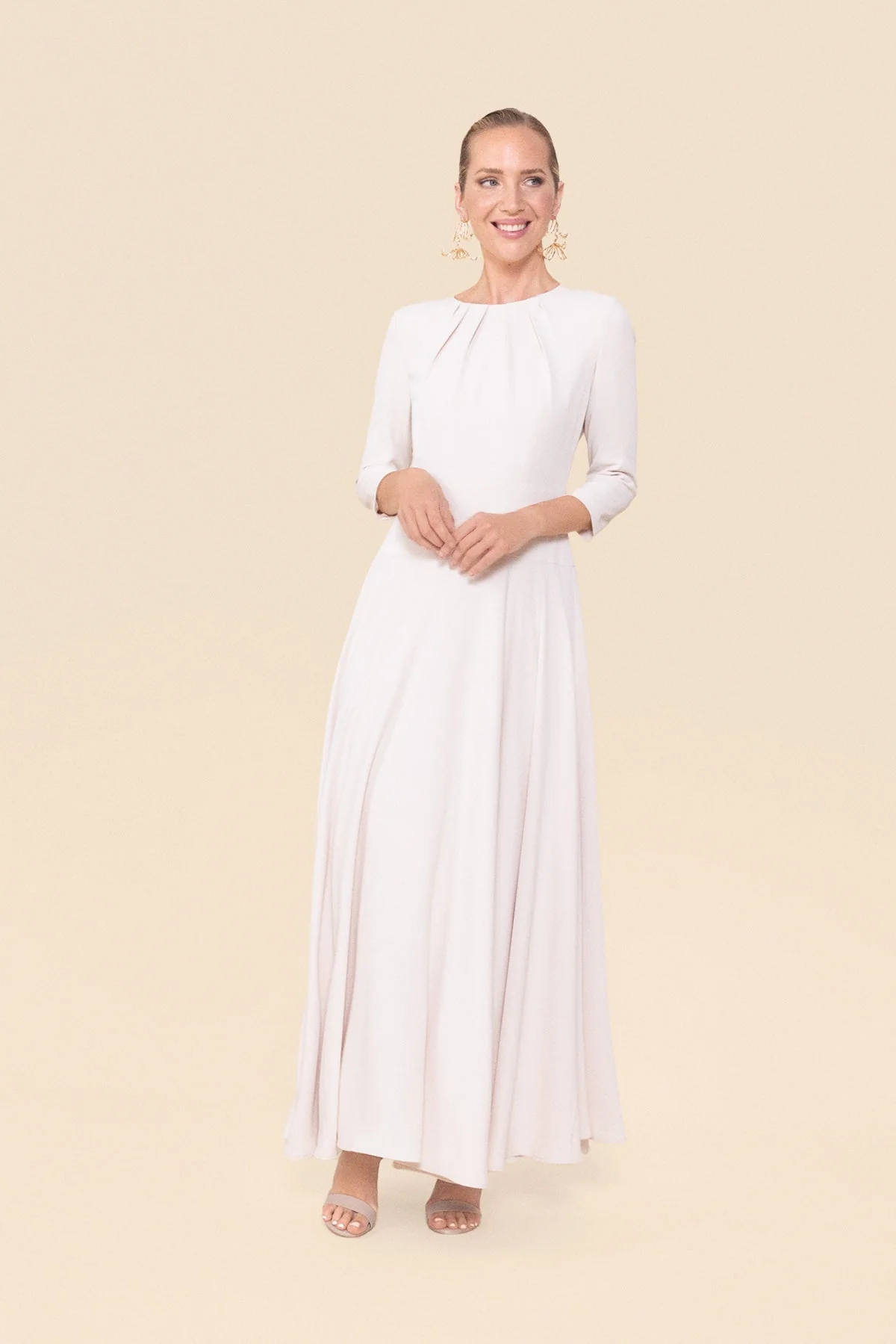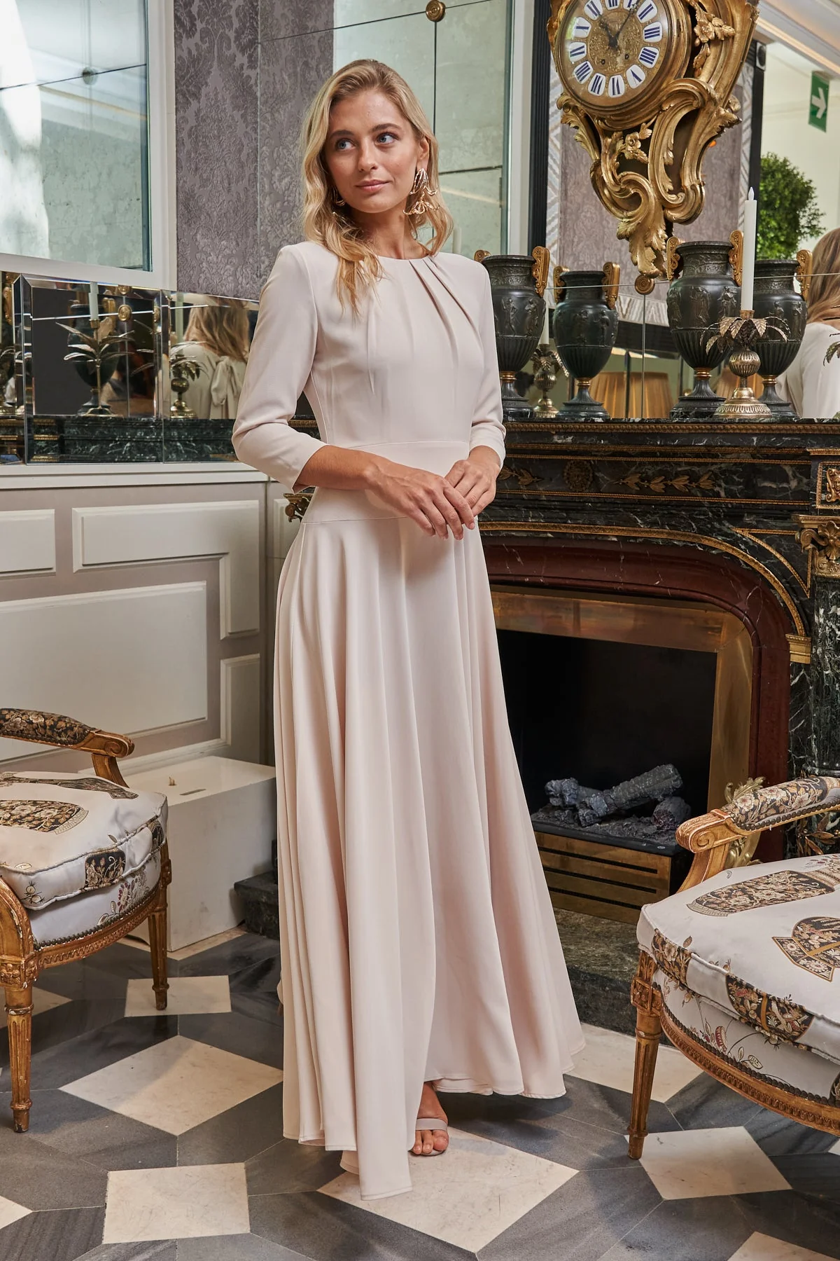 Vestido midi para invitadas con escote redondo con frunces y pliegues. Corte en la cintura y falda con vuelo. Mangas con botones forrados en el mismo tejido. Tejido tipo crepe super suave y agradable. Totalmente forrado. Disponible tambi茅n en color rosa lipstick.