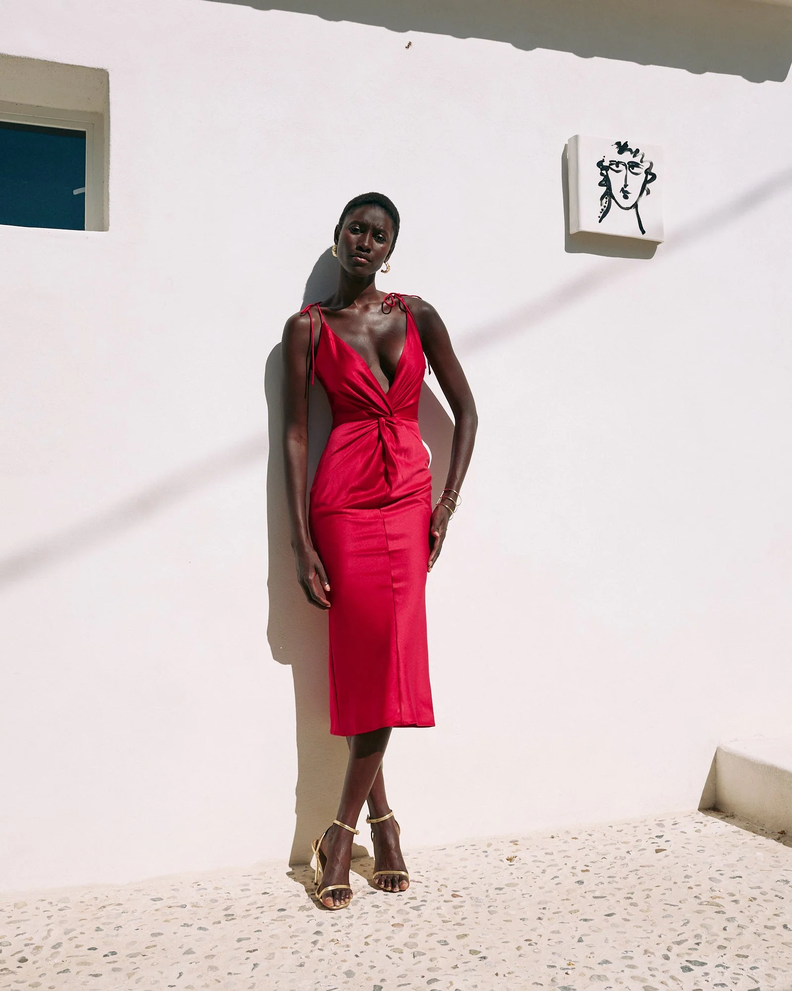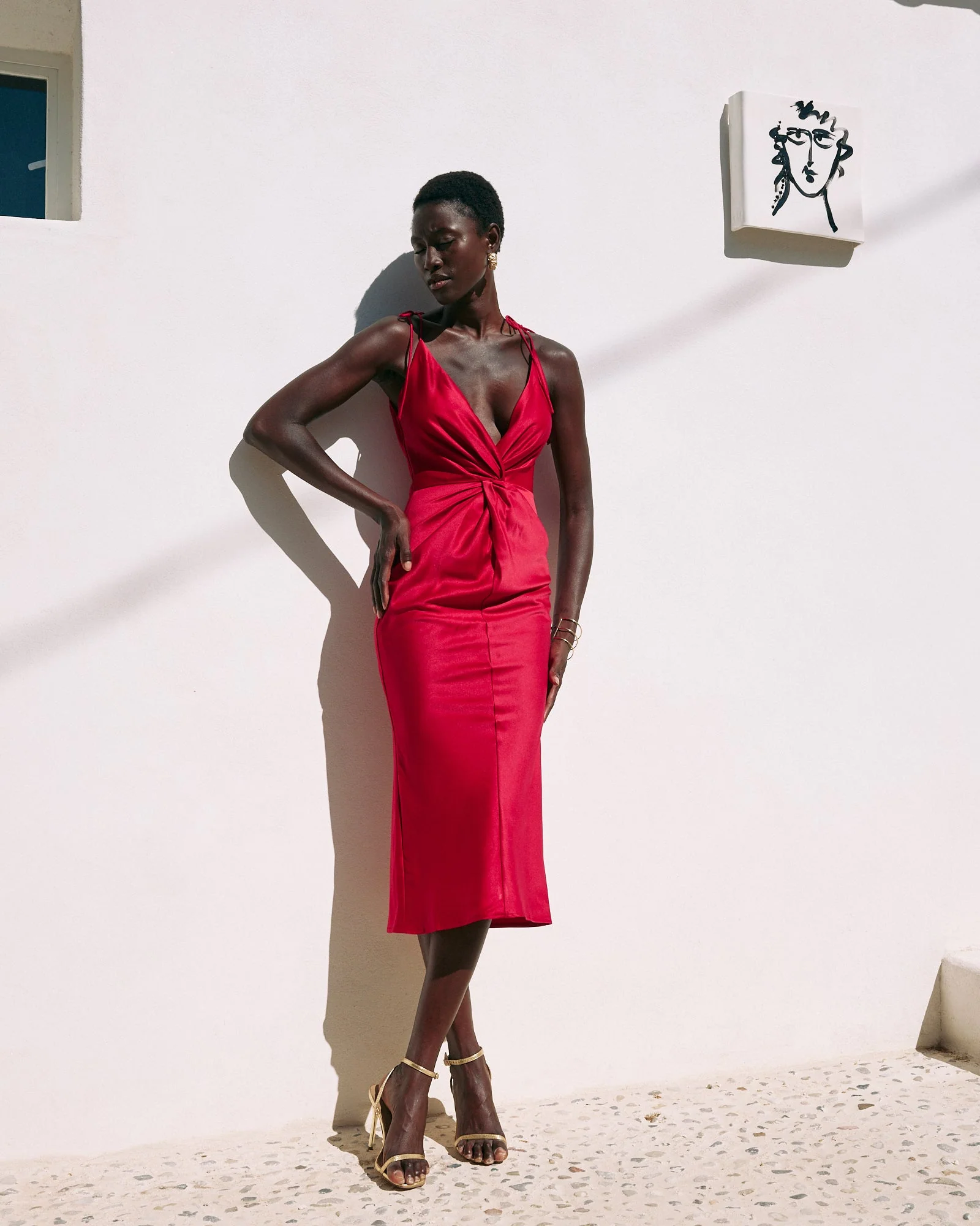 Vestido midi confeccionado con crepe sat茅n color rojo intenso.
