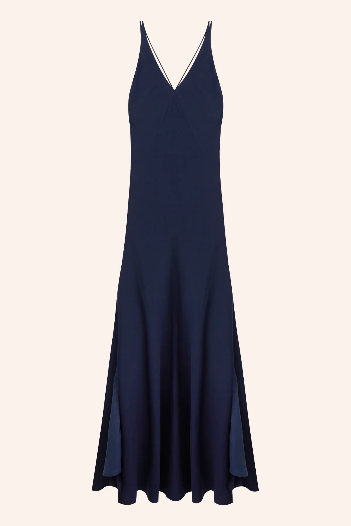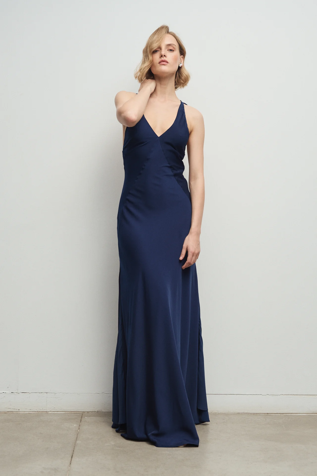 Vestido largo de invitada en crepe satinado con escote en espalda y tirantes cruzados ajustables.