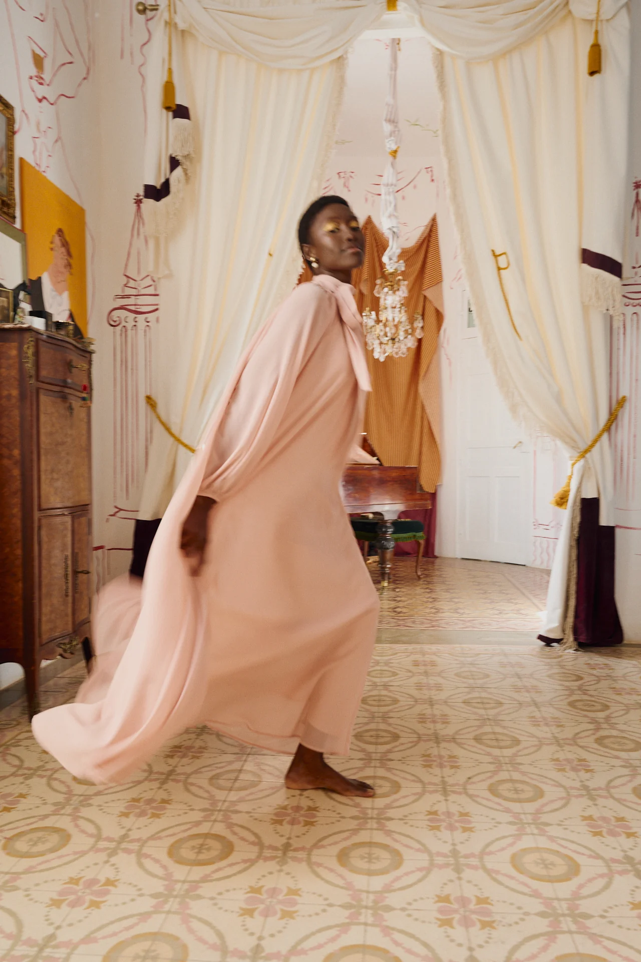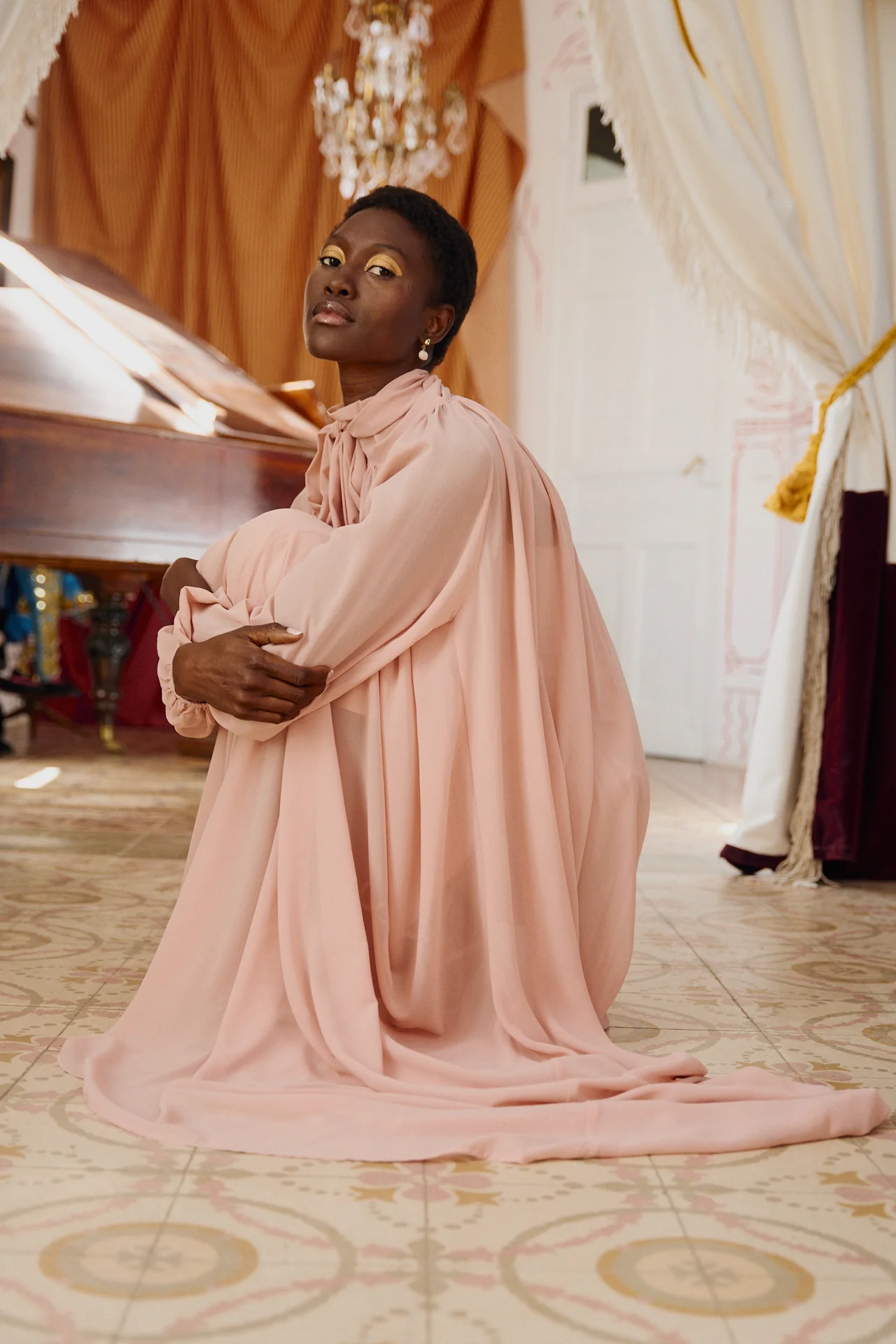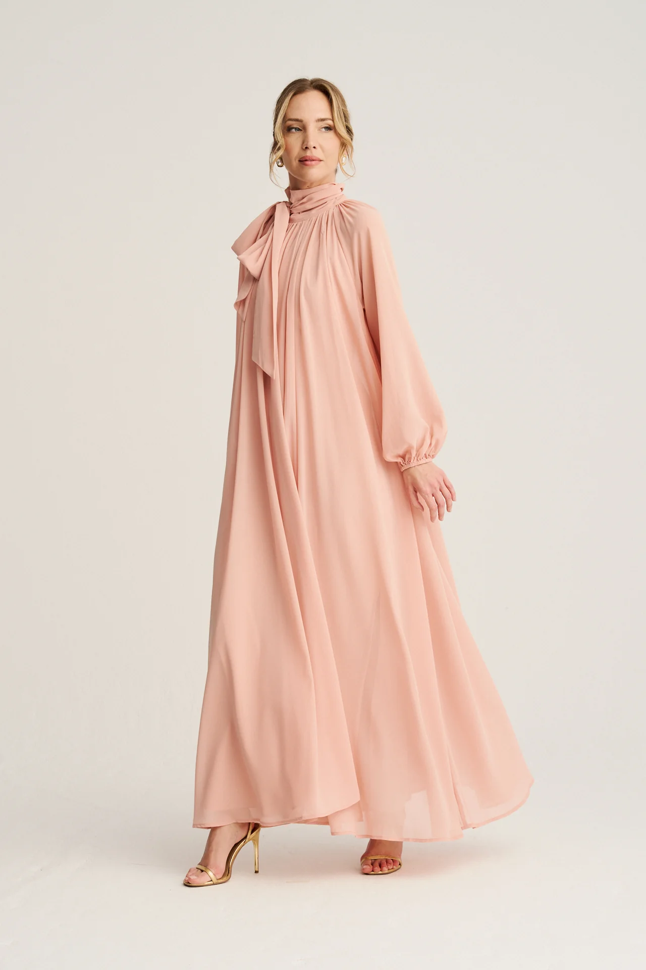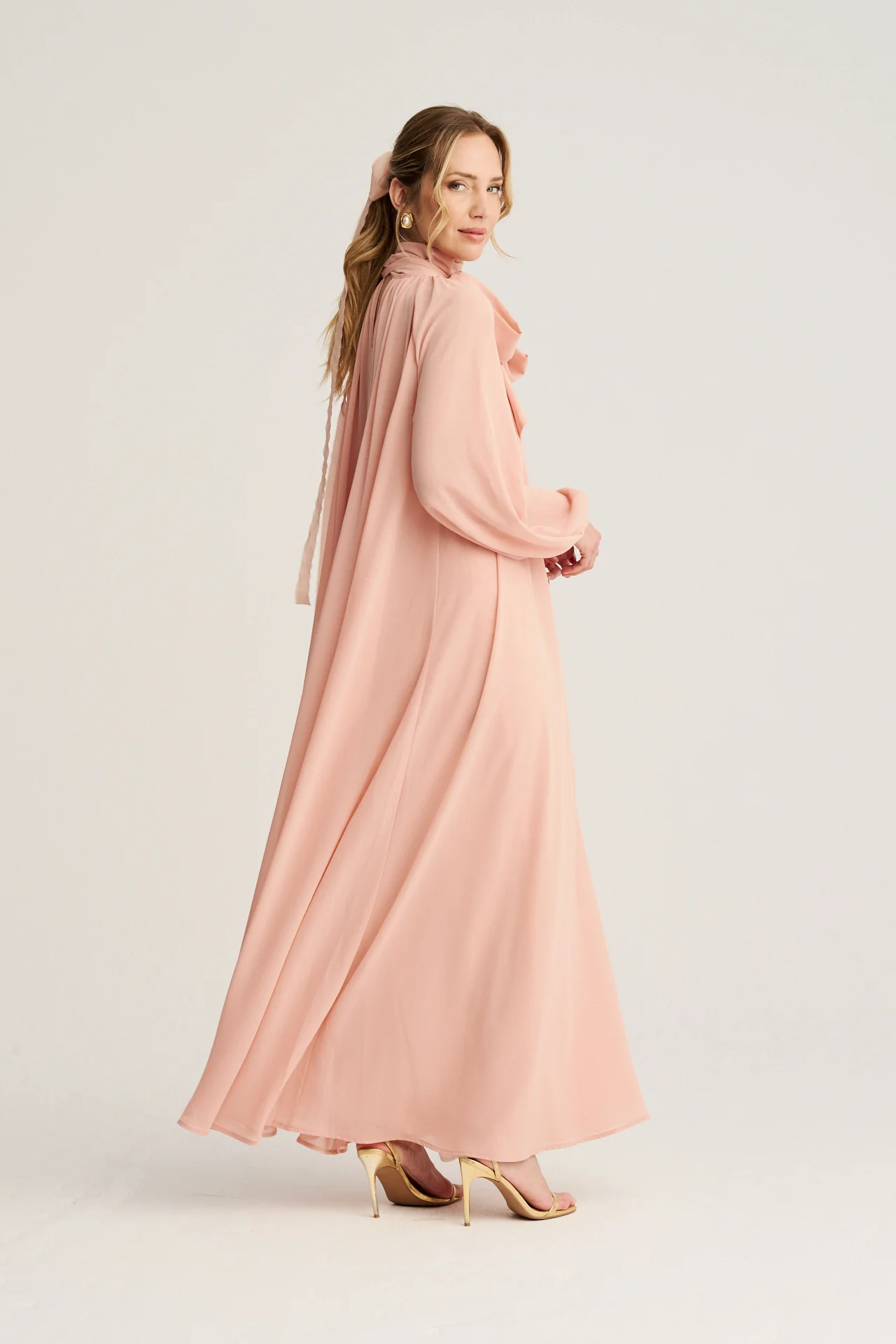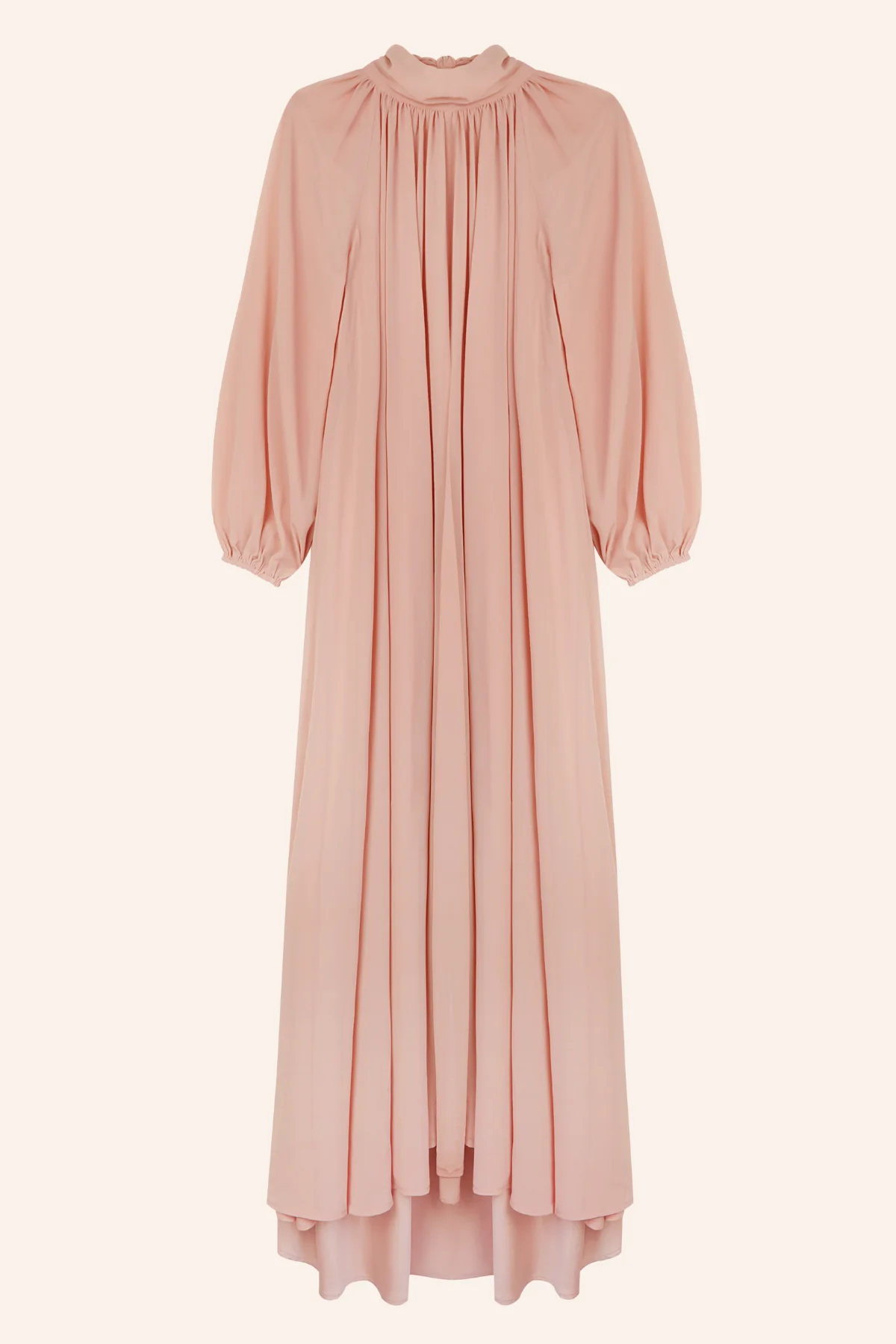 - Diseño sofisticado: Su caída fluida y el delicado color rosa empolvado aportan un aire de elegancia y dulzura. Las mangas abullonadas y su cuello alto fruncido realzan su estilo único.
