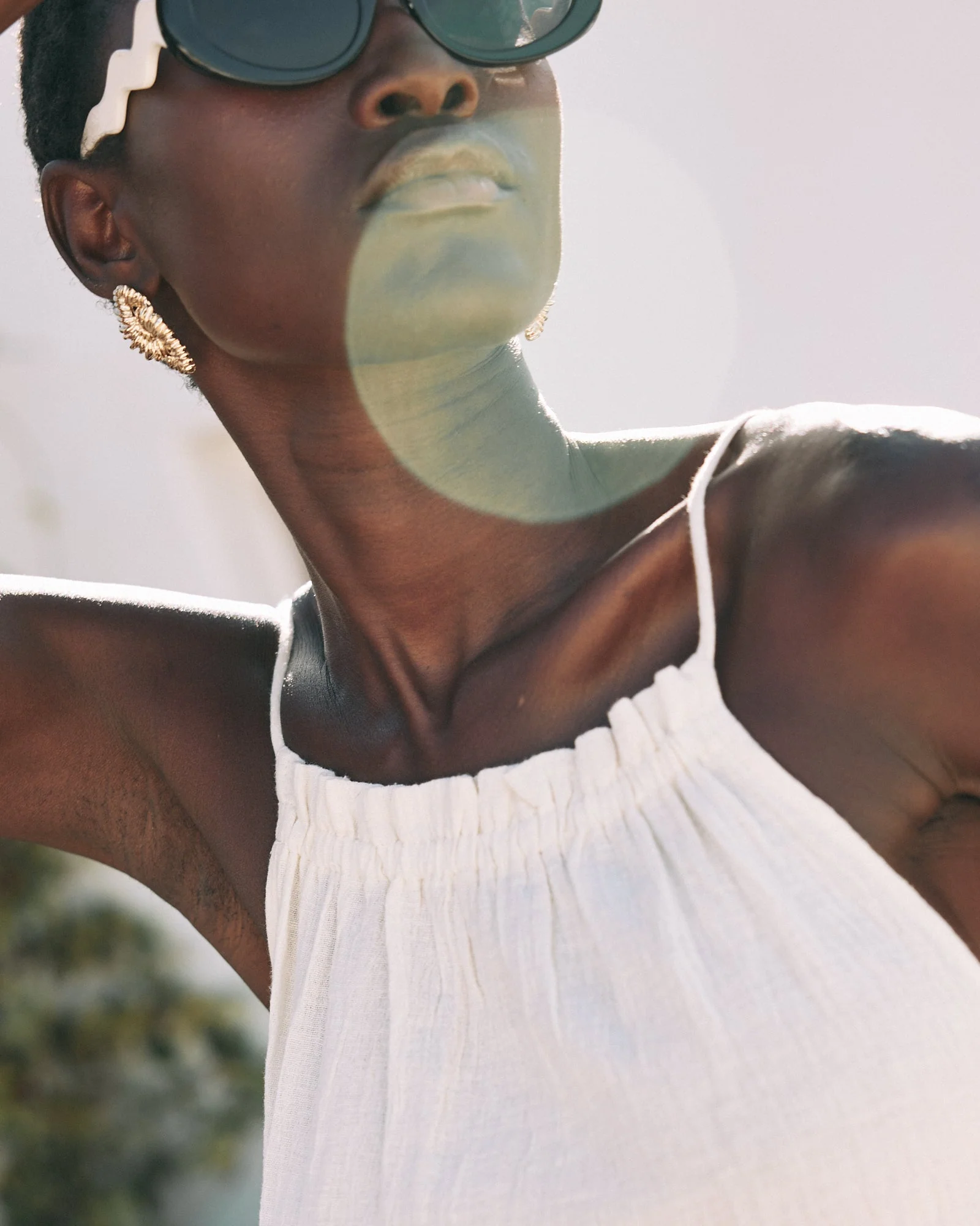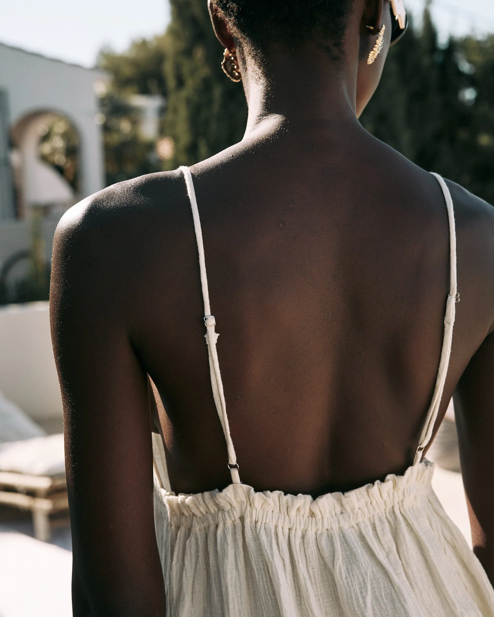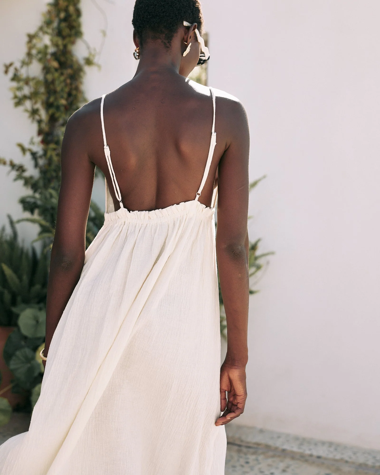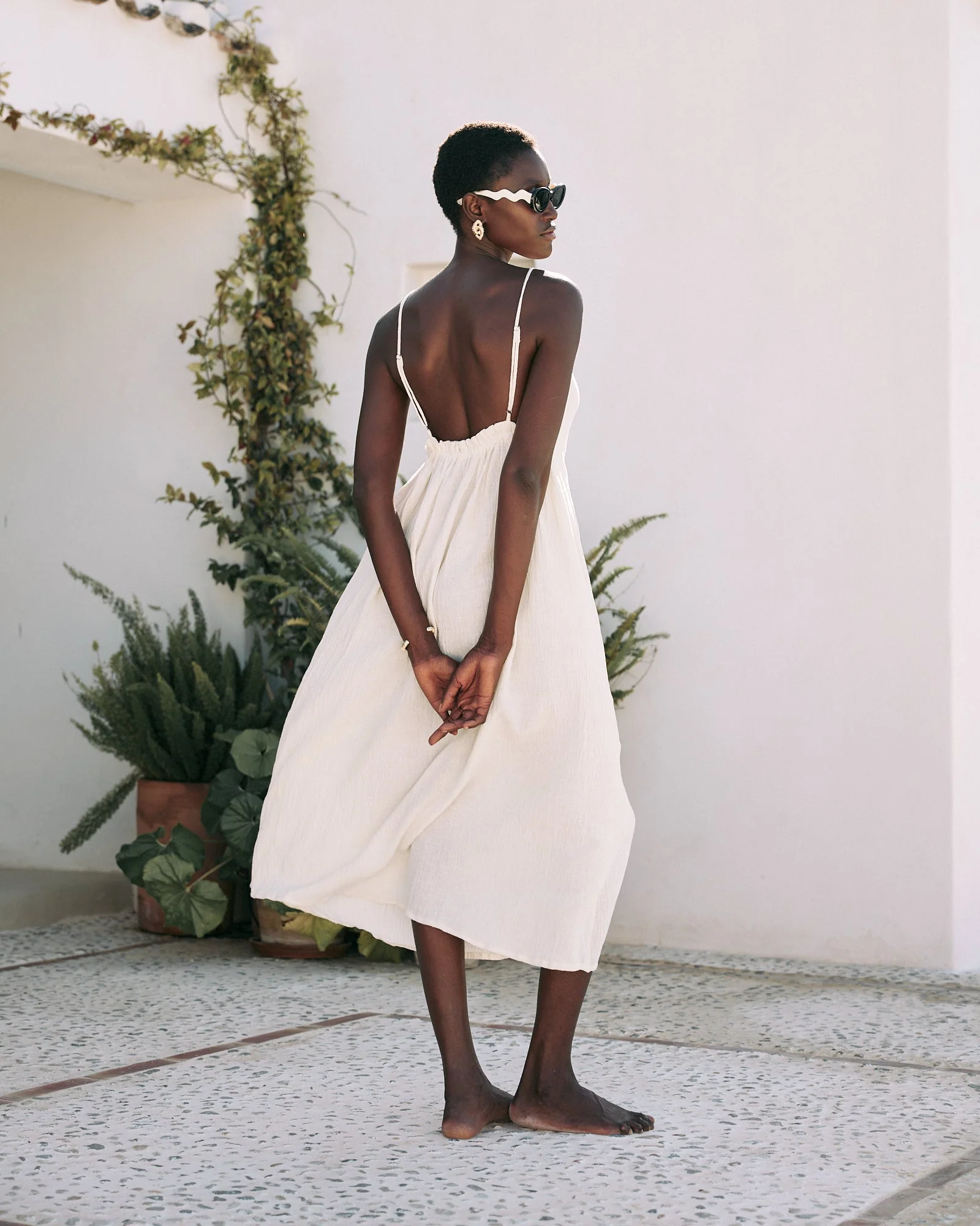 Vestido midi confeccionado en mezcla de algod贸n y lino con tirantes regulables y escote profundo en espalda.