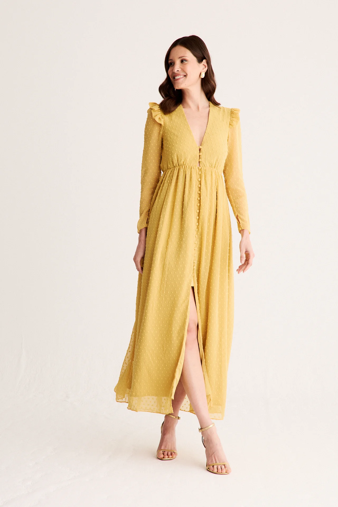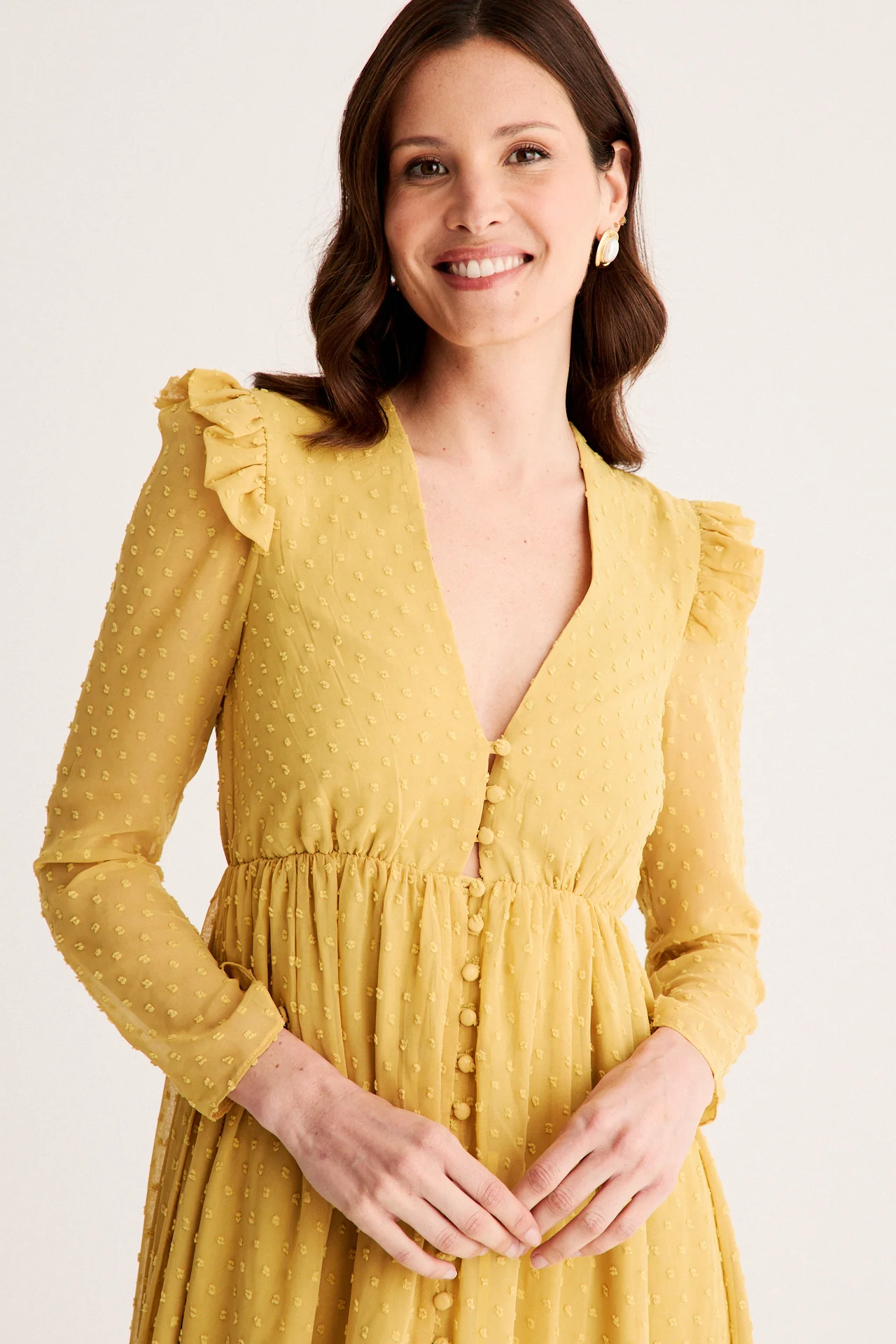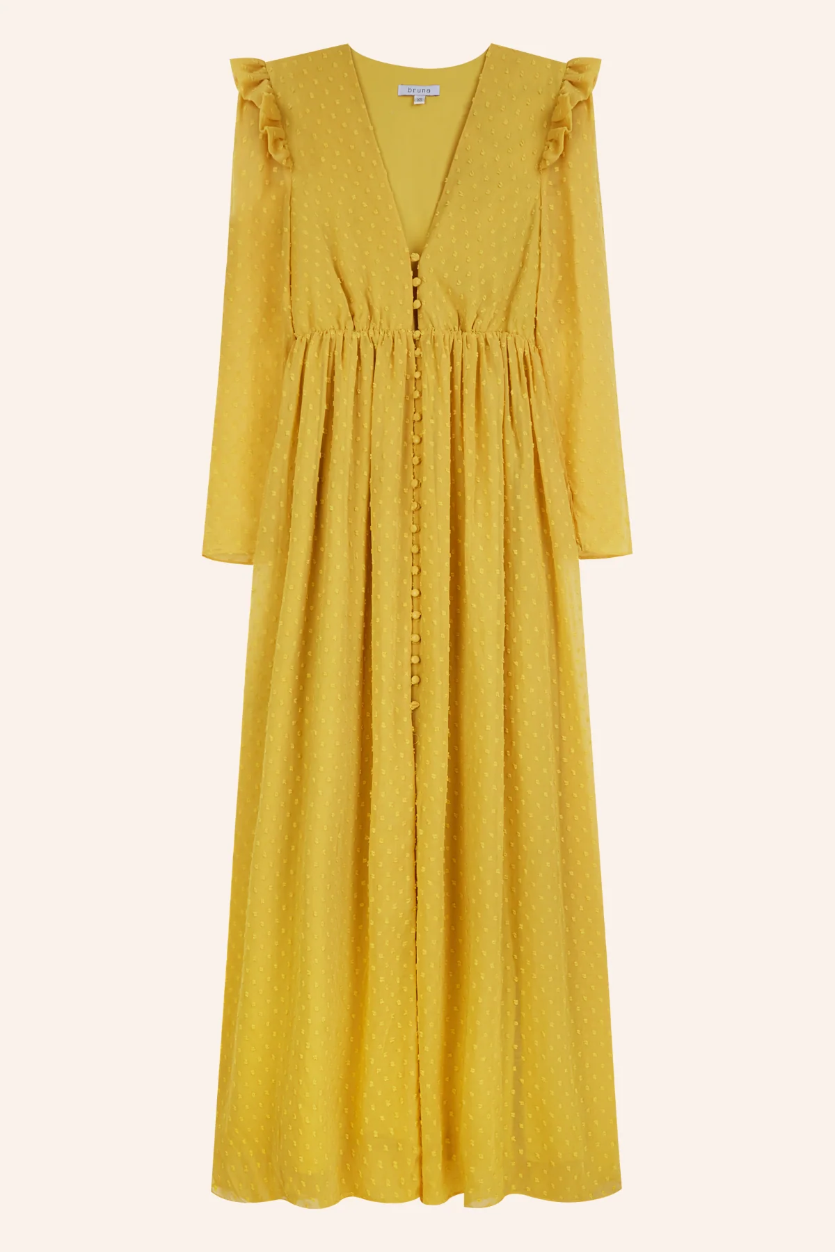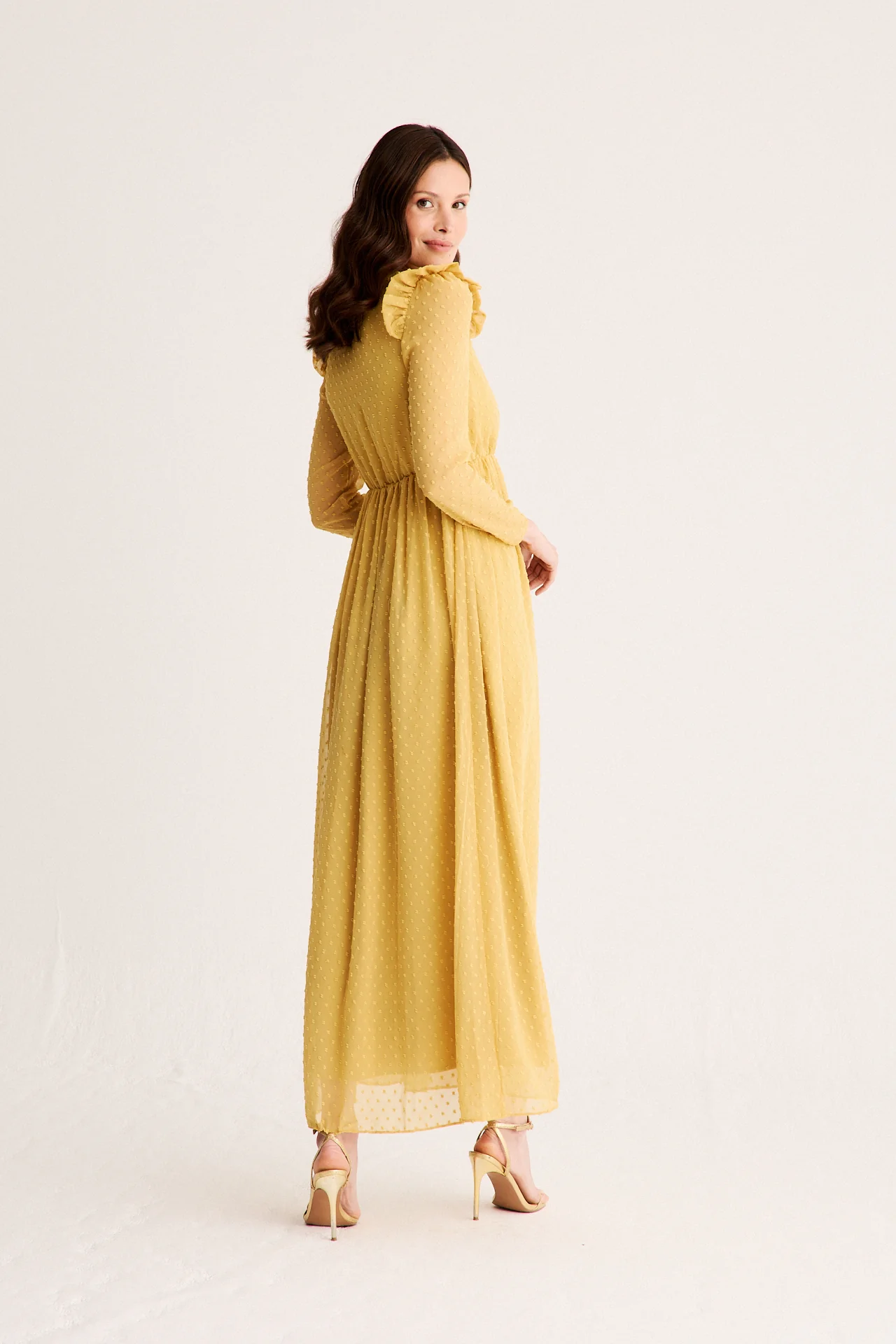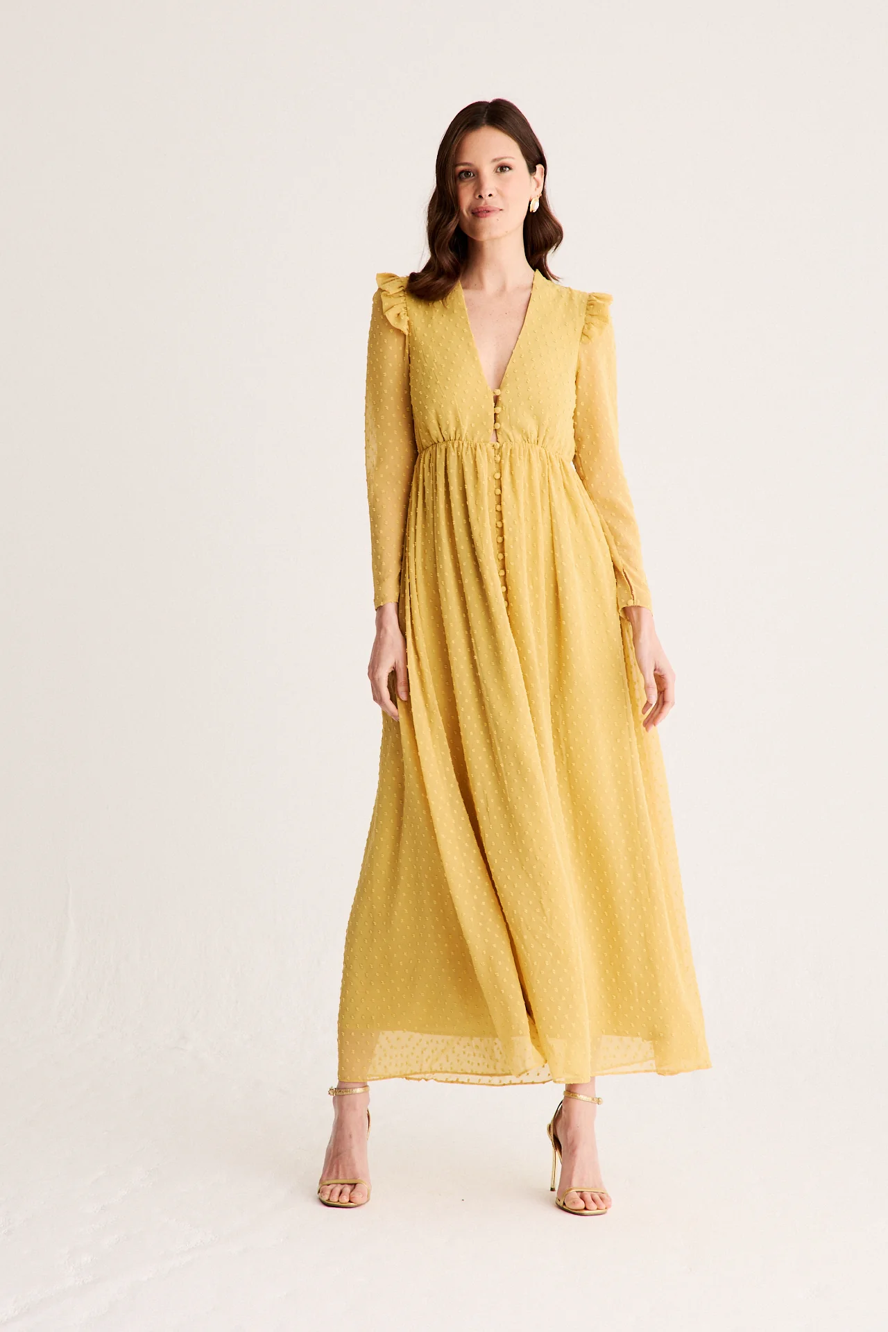 Vestido largo de fiesta en plumeti amarillo lemon – Elegancia para bodas y eventos especiales