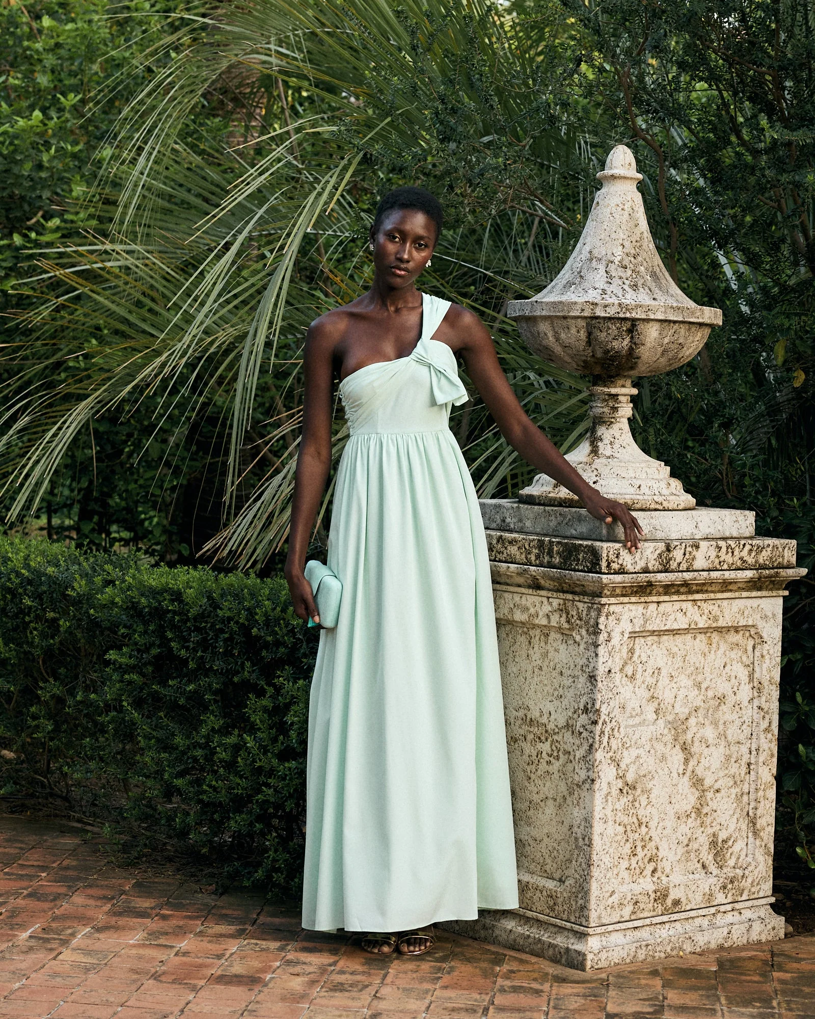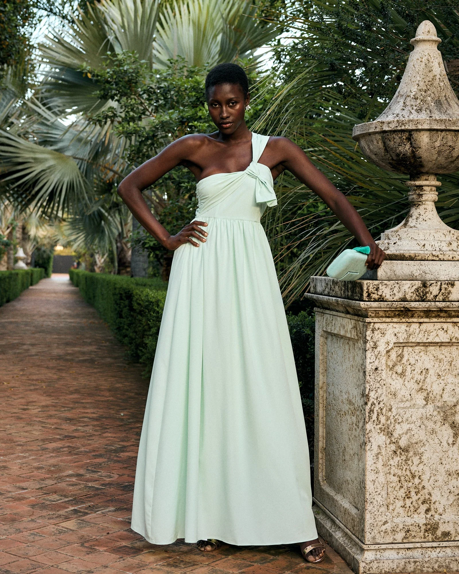 Vestido de fiesta para invitada confeccionado con crepe monocolor. Vestido largo para fiesta con escote palabra de honor con lazo asim茅trico.