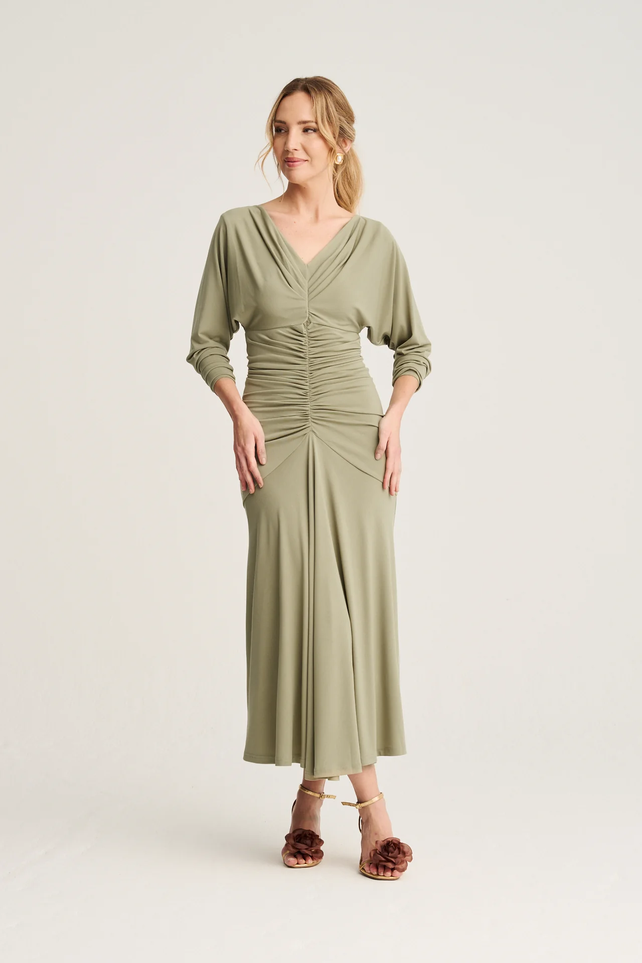 Este vestido en punto de seda con manga larga murciélago es la definición de sofisticación inesperada. Diseñado en un precioso color verde sage, combina detalles cuidadosamente pensados para estilizar y resaltar tu figura con fluidez y elegancia.