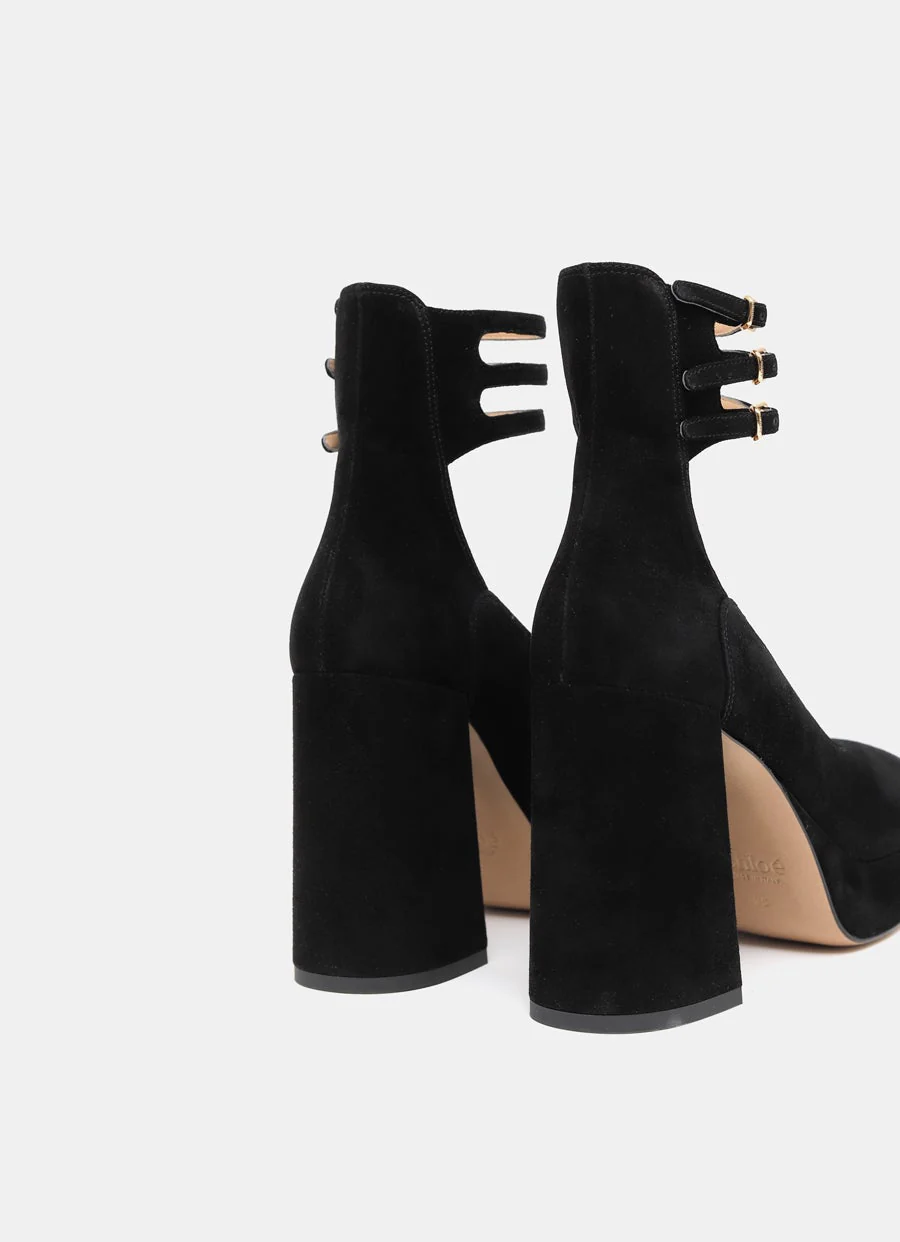 Zapato de Chlo茅 en terciopelo con puntera redonda, tac贸n forrado de 9 cm, tiras finas con cierre de hebilla dorada en el tobillo, plantilla con logo y suela de piel. Hecho en Italia. Talla normal, elige tu talla habitual. Tallaje franc茅s.
